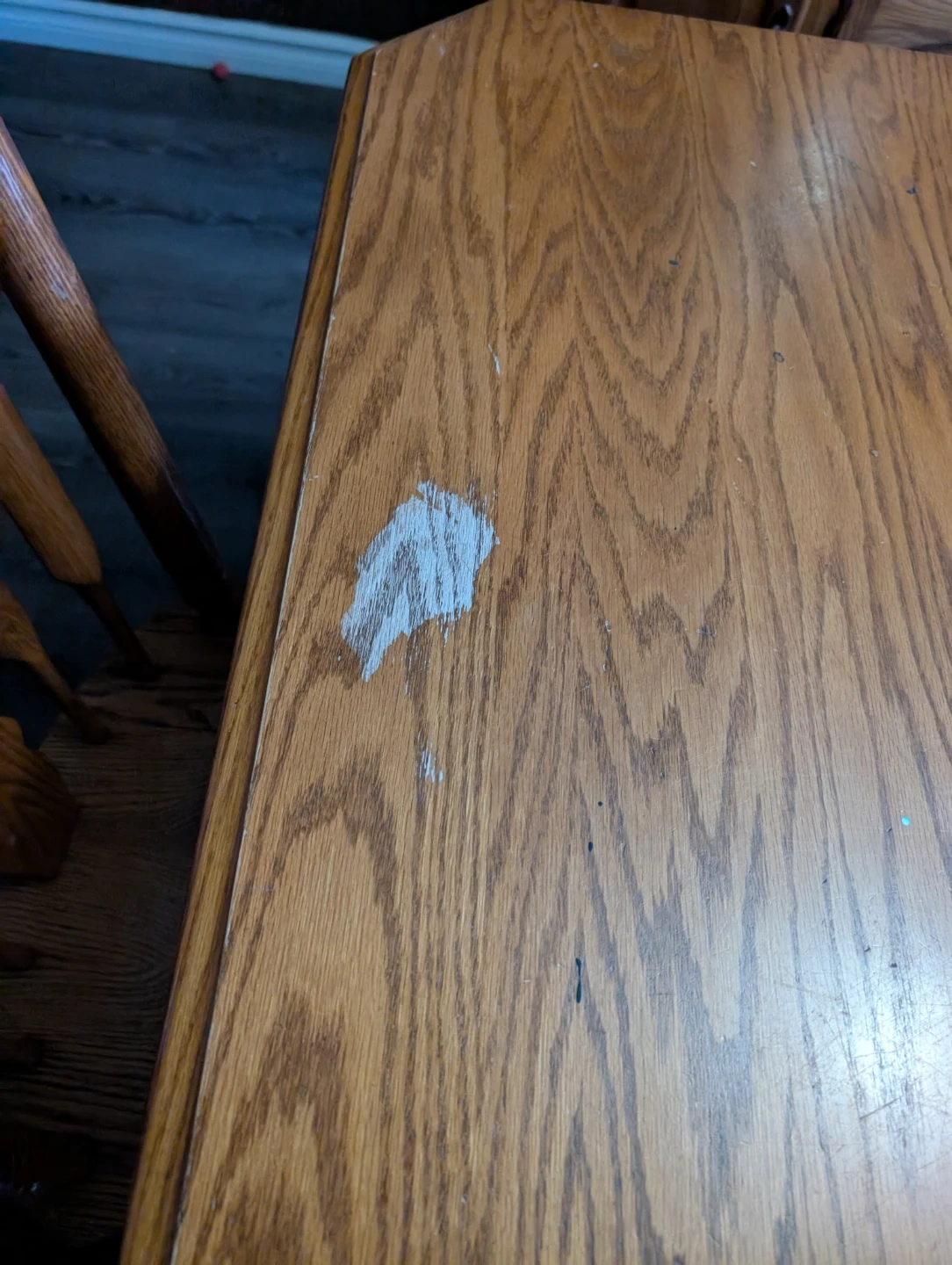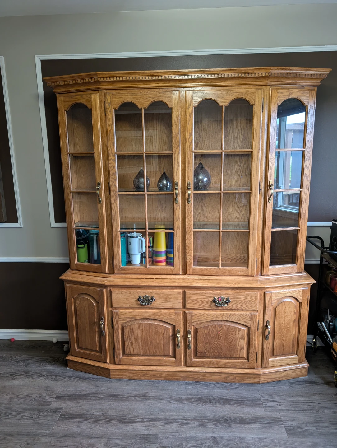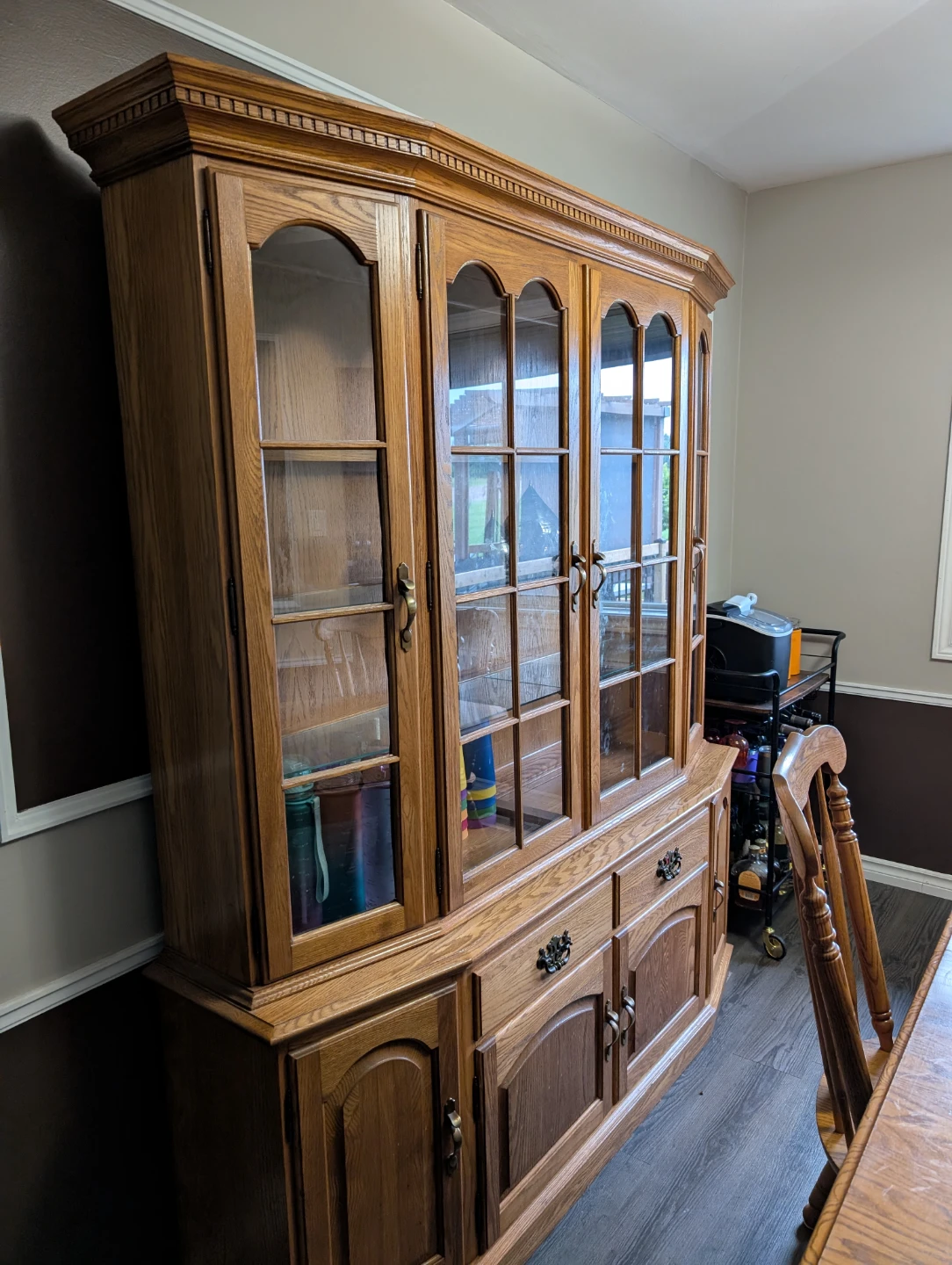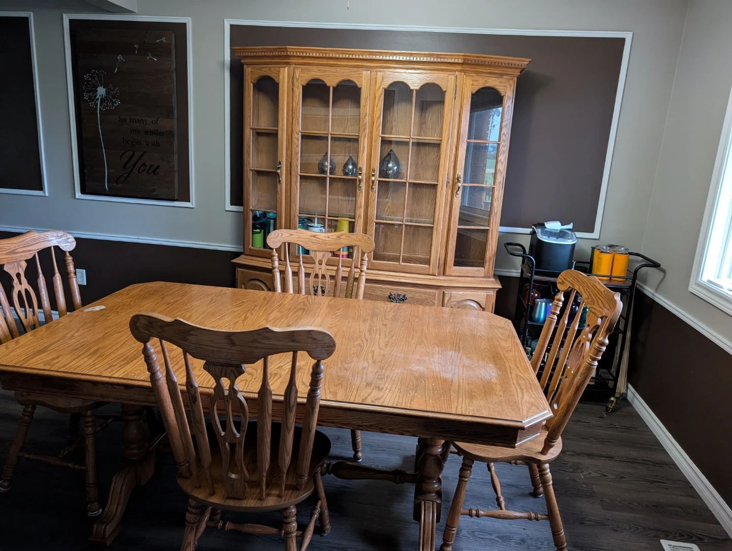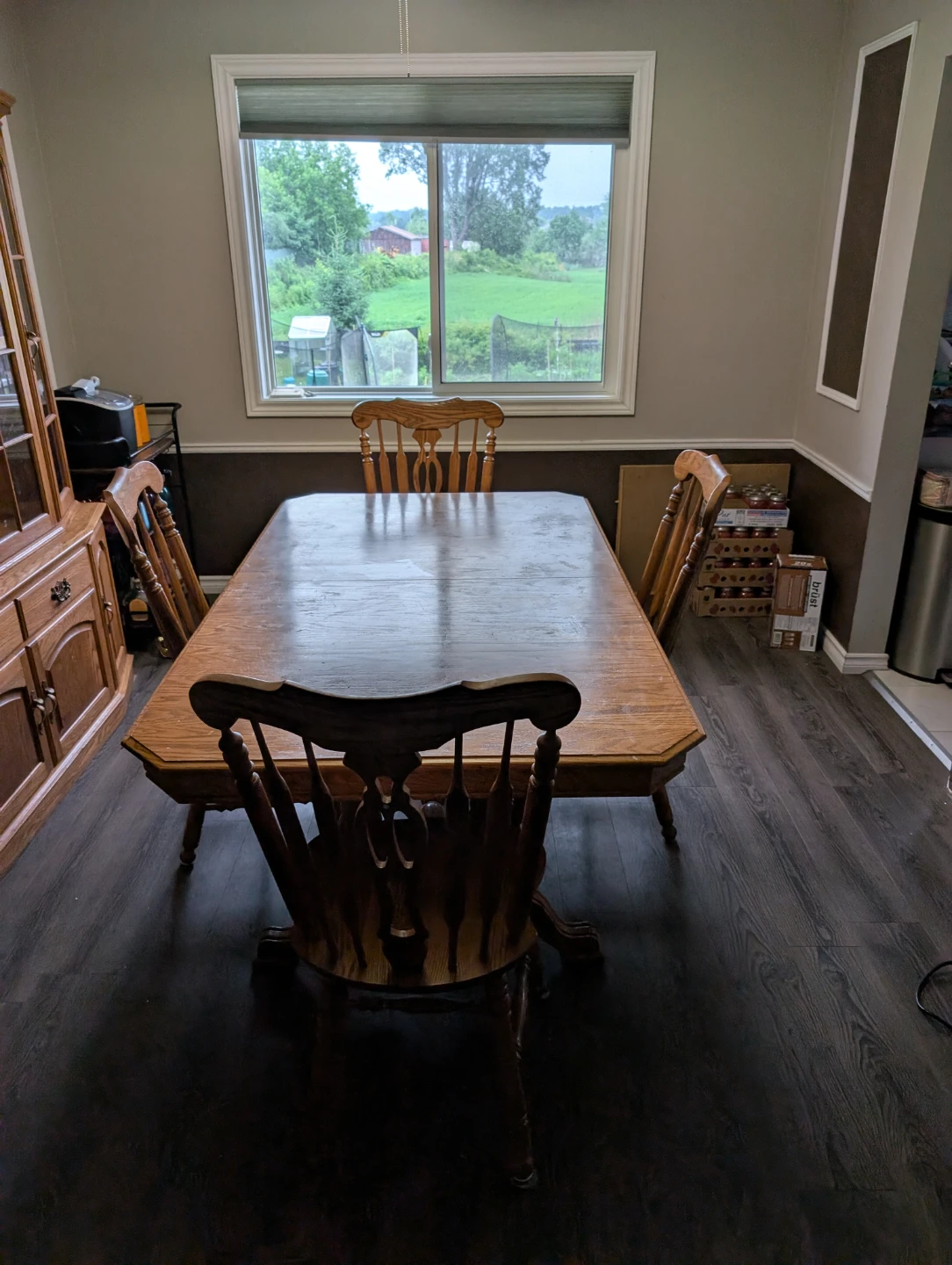 Selling a solid oak dining table with seven chairs (4 shown), 2 extender leaves and a matching hutch. Very old set, well loved but doesn't fit in the space we have. This set is very heavy so bring a truck and people to move it. There is some wear in places (shown in pictures). Would be a beautiful set to refinish! The hutch has glass doors and plenty of storage space. Perfect for a dining room or kitchen!