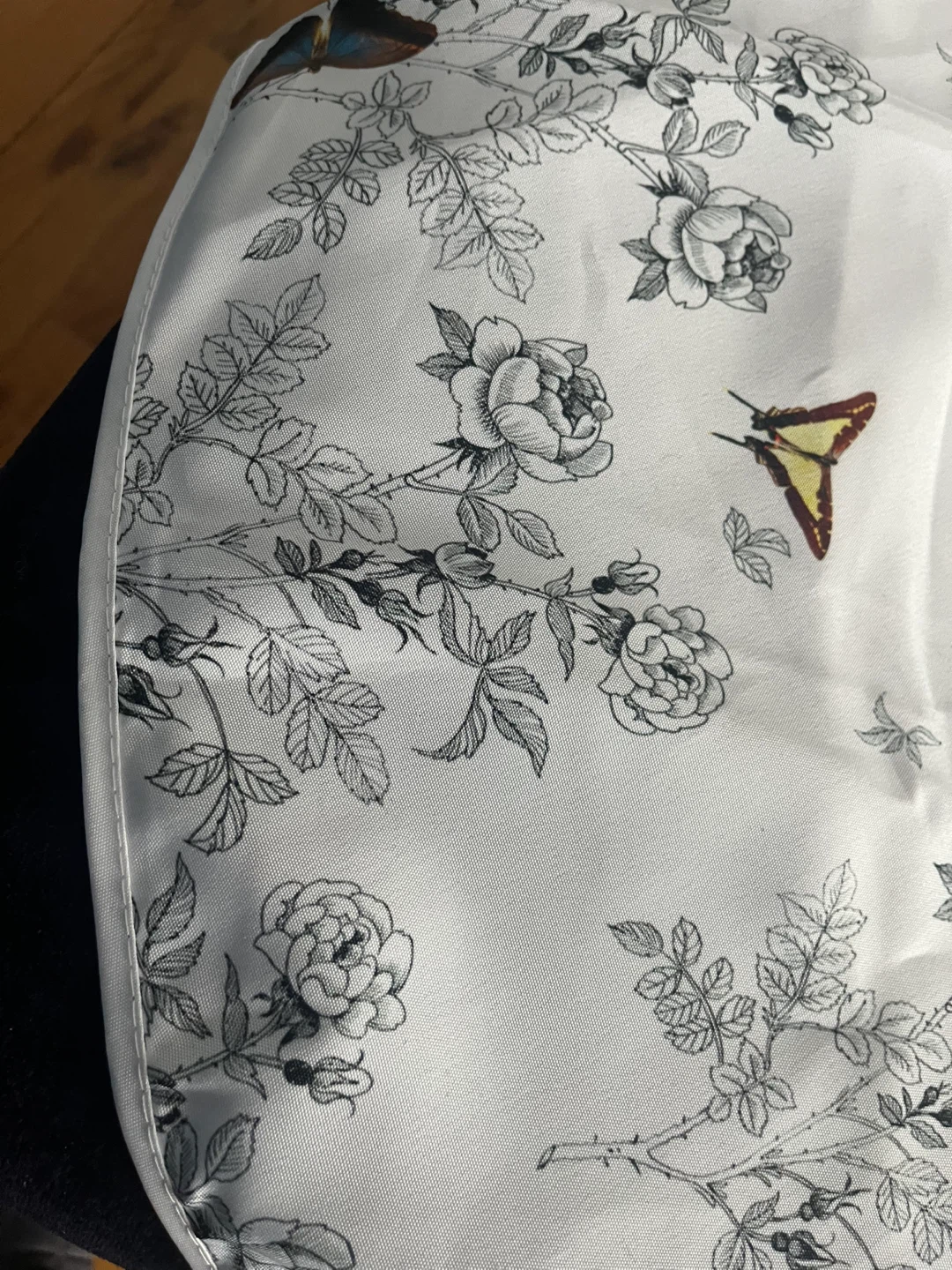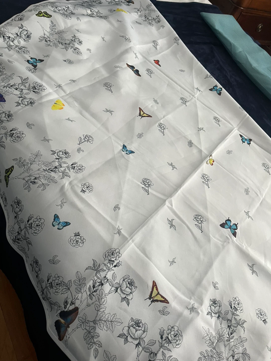 Beautiful tablecloth with a delicate floral and butterfly print. The design features roses and various butterflies in a monochrome palette with subtle hints of color. It is brand new.