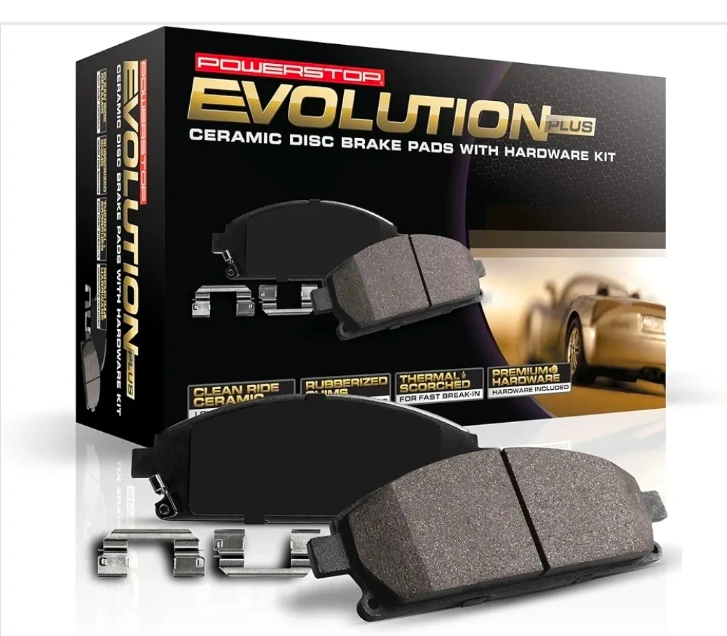 Looking to sell a set of PowerStop Evolution Plus ceramic disc brake pads with hardware kit. These pads offer a clean ride and are rubberized for virtually silent braking. They're also thermally scorched for fast break-in and include premium hardware