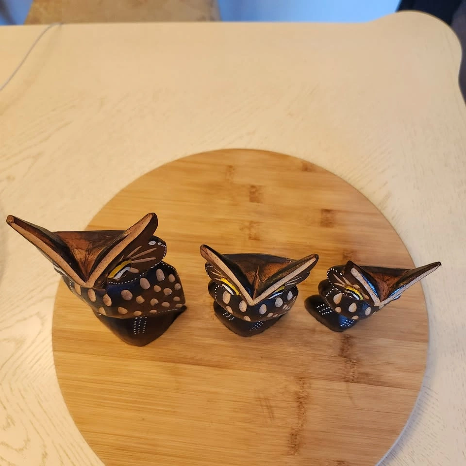 The smallest owl has a small piece broken off on one ear tuft, but this does not detract at all from the visual appeal. The medium and tall owls are both in very good condition.