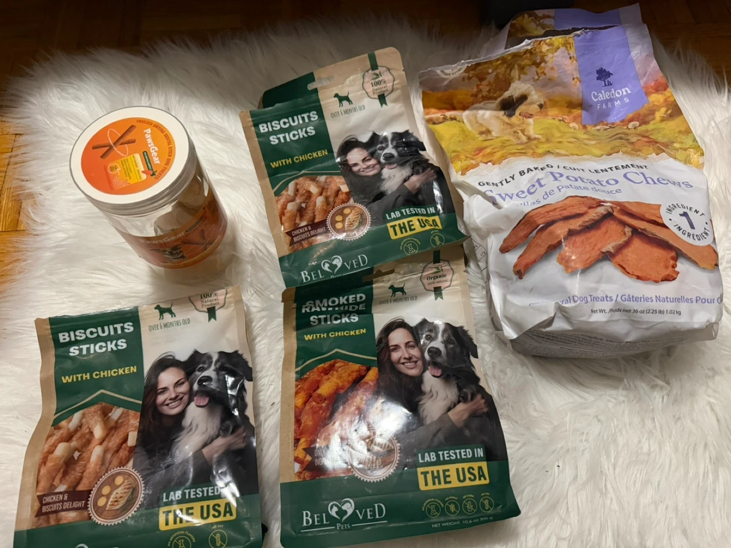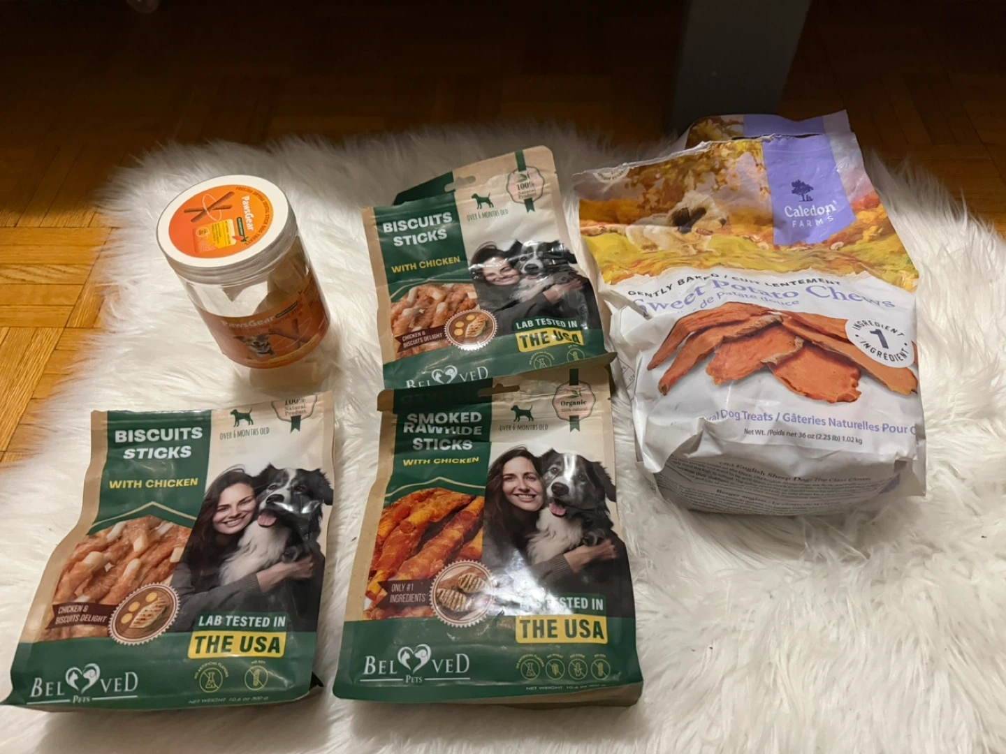 Selling a variety of dog treats! Includes Beloved Biscuits Sticks with Chicken, Pawseals treats, and Caledon Farms Sweet Potato Chews. Perfect for spoiling your furry friend!
