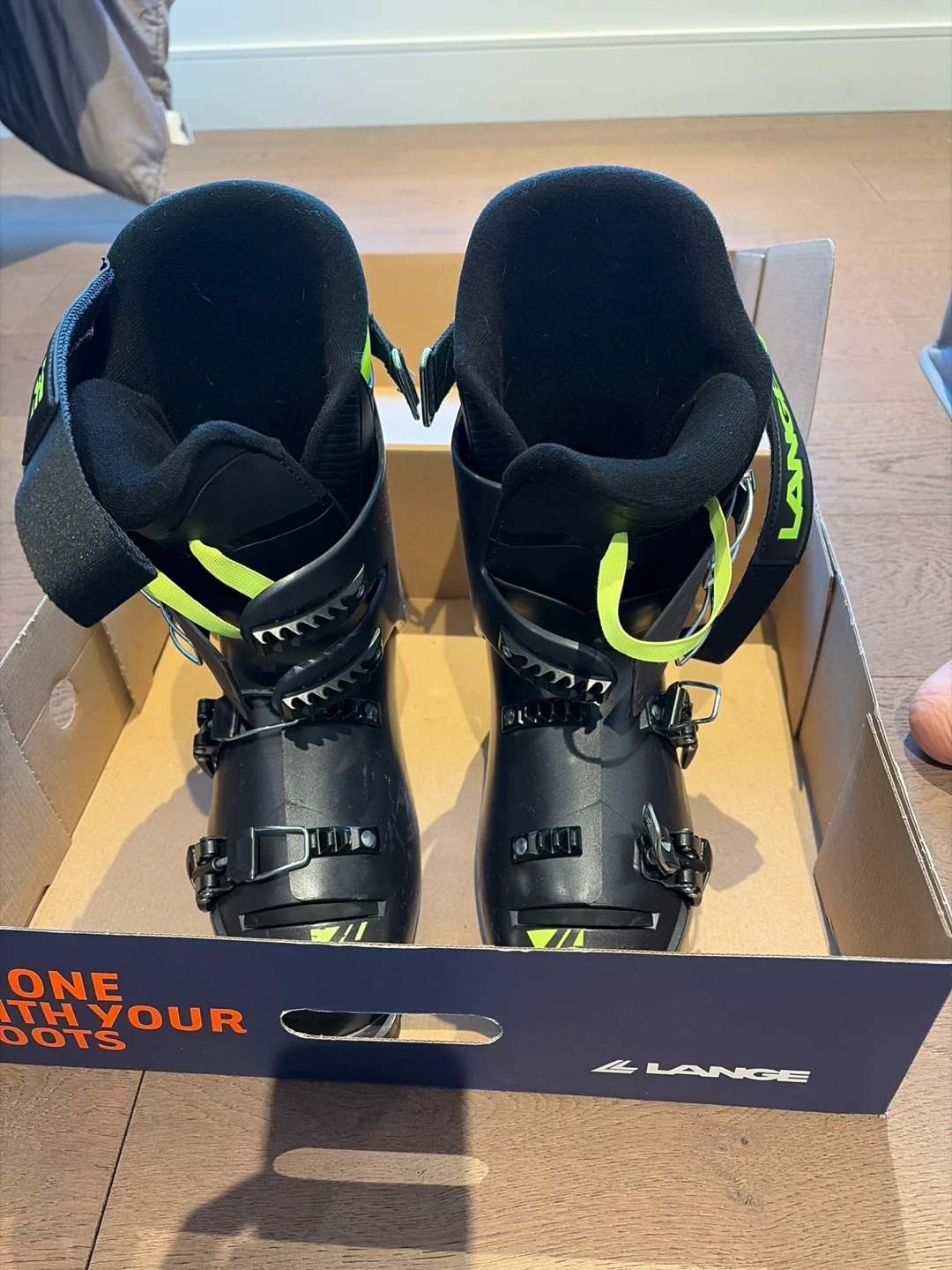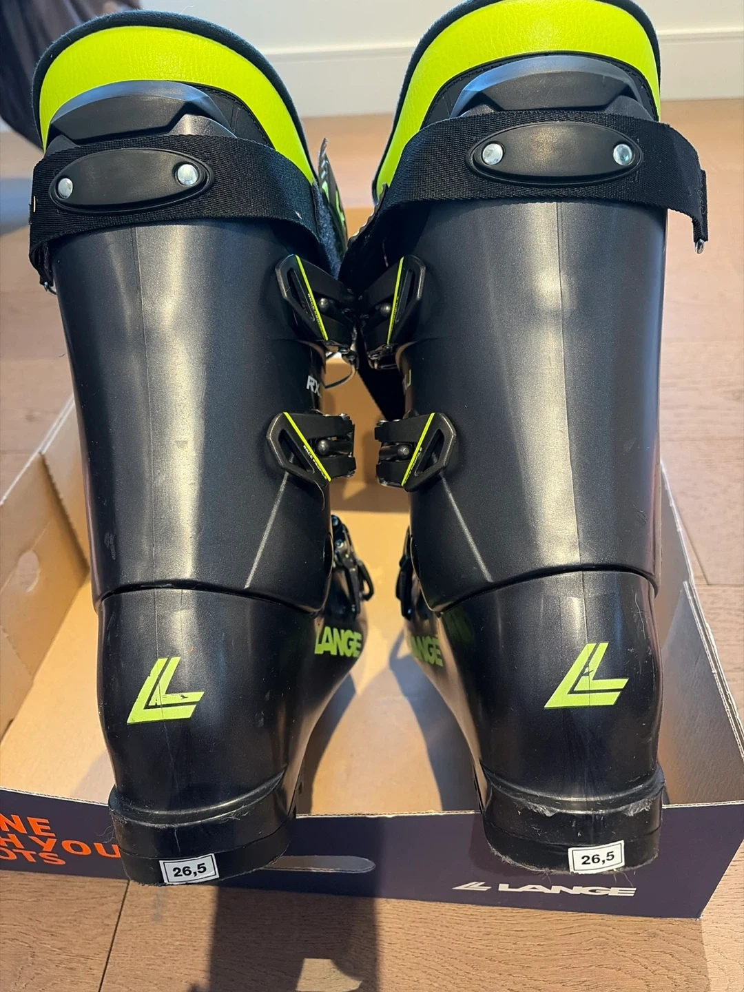 Selling a pair of Lange RXJ ski boots in Anthracite and Lime. They are size 26.5. Some scuffs but nothing major at all. Used a few times only. The original box is included!