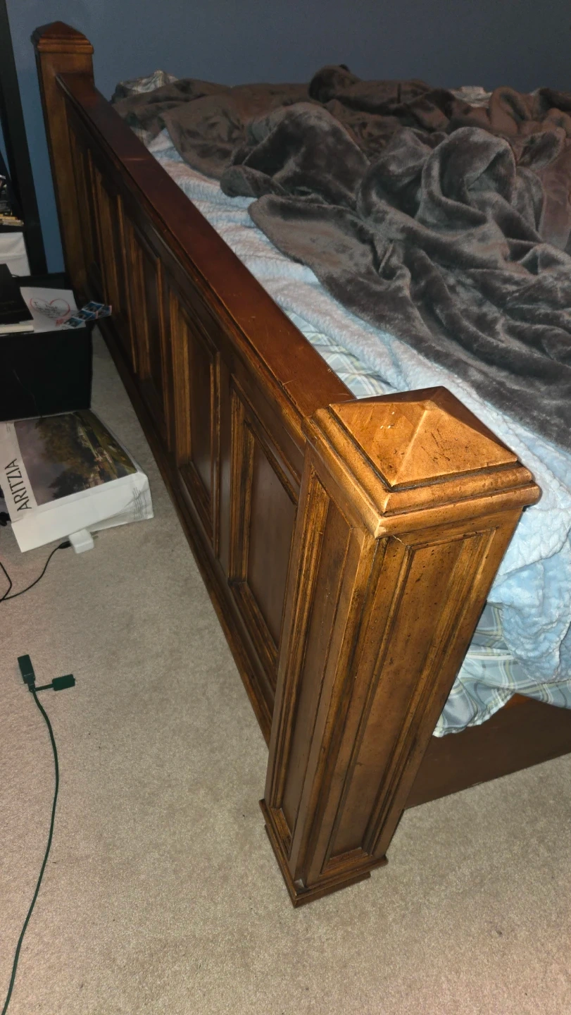 Selling a solid wooden bed frame. It has a beautiful, classic design and is in good condition. Perfect for adding a touch of elegance to your bedroom! Comes with box spring if required.