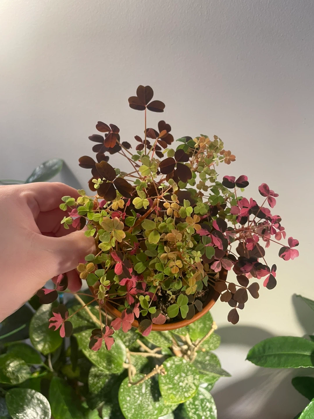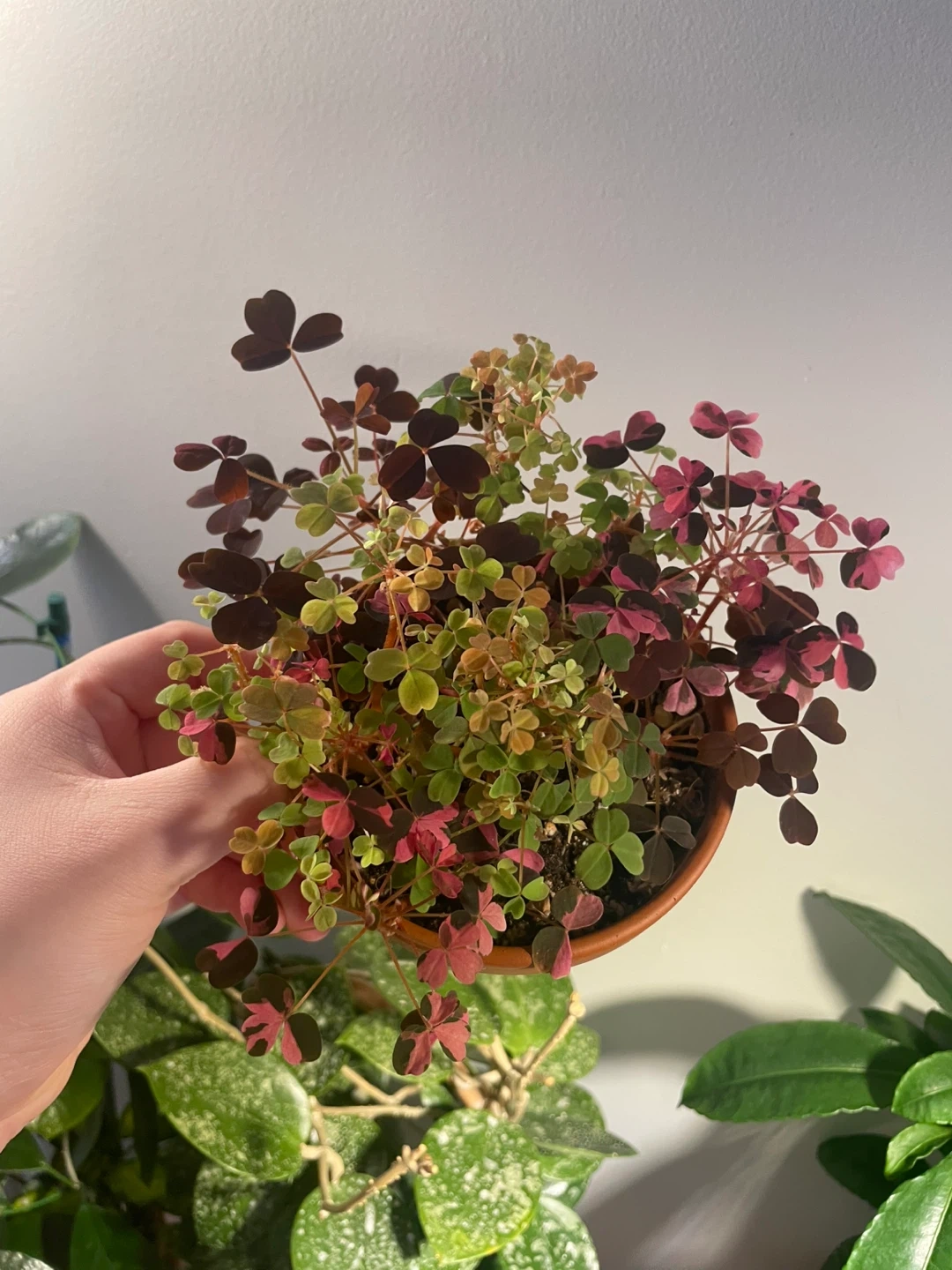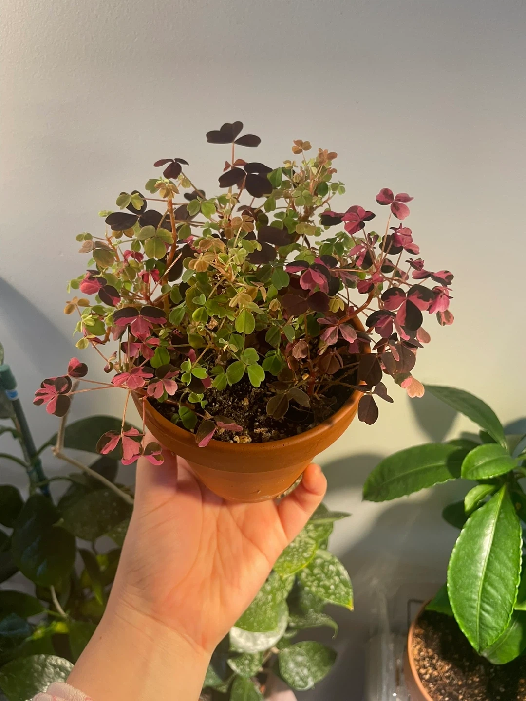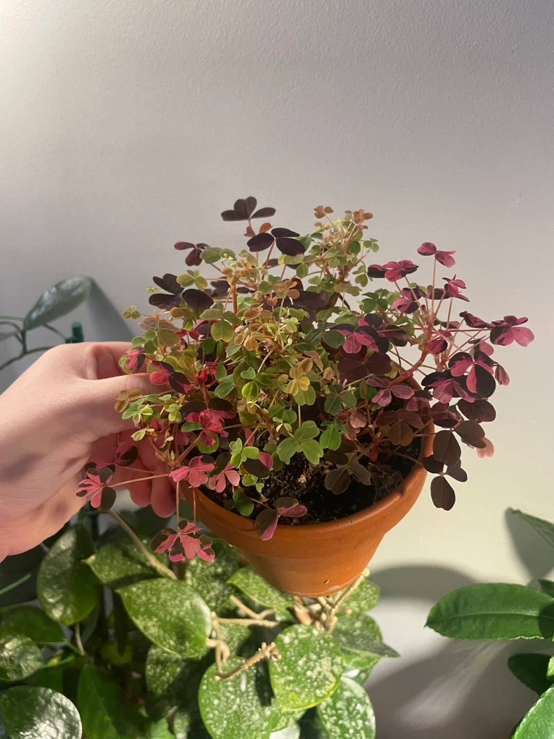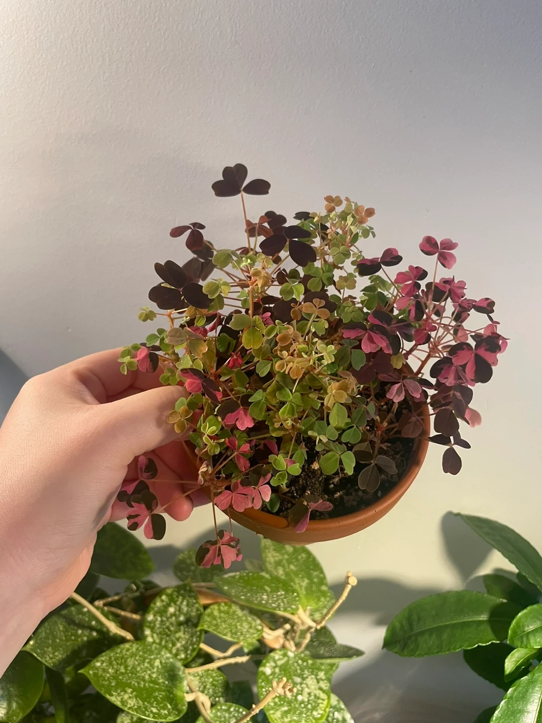 Selling an Oxalis plant in a terracotta pot. It features beautiful tri-color leaves in shades of green, pink, and purple. A lovely addition to any indoor garden!