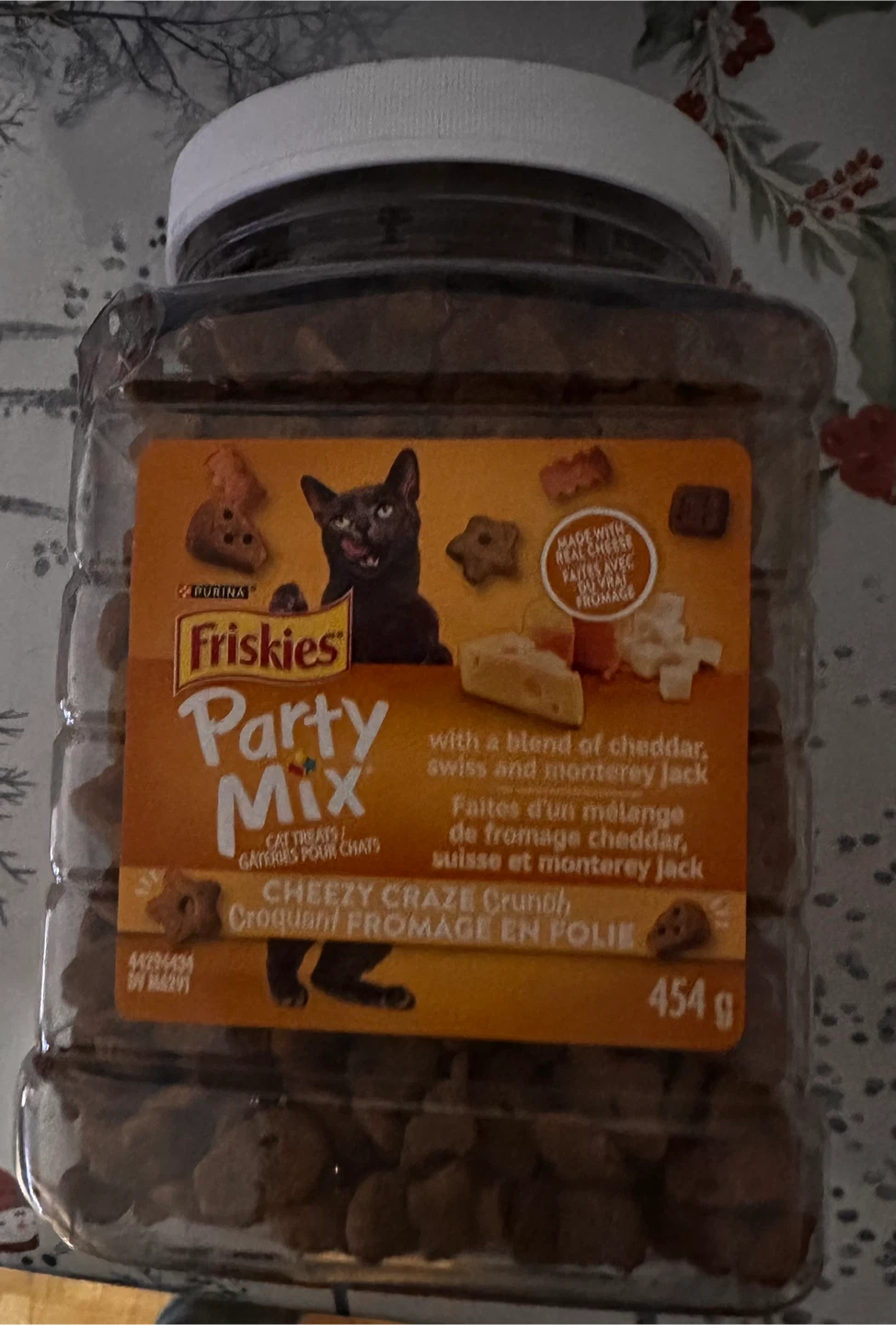 Selling a container of Friskies Party Mix Cheezy Craze Crunch cat treats. They're a blend of cheddar, swiss, and monterey jack cheeses. Best before October 2026!
