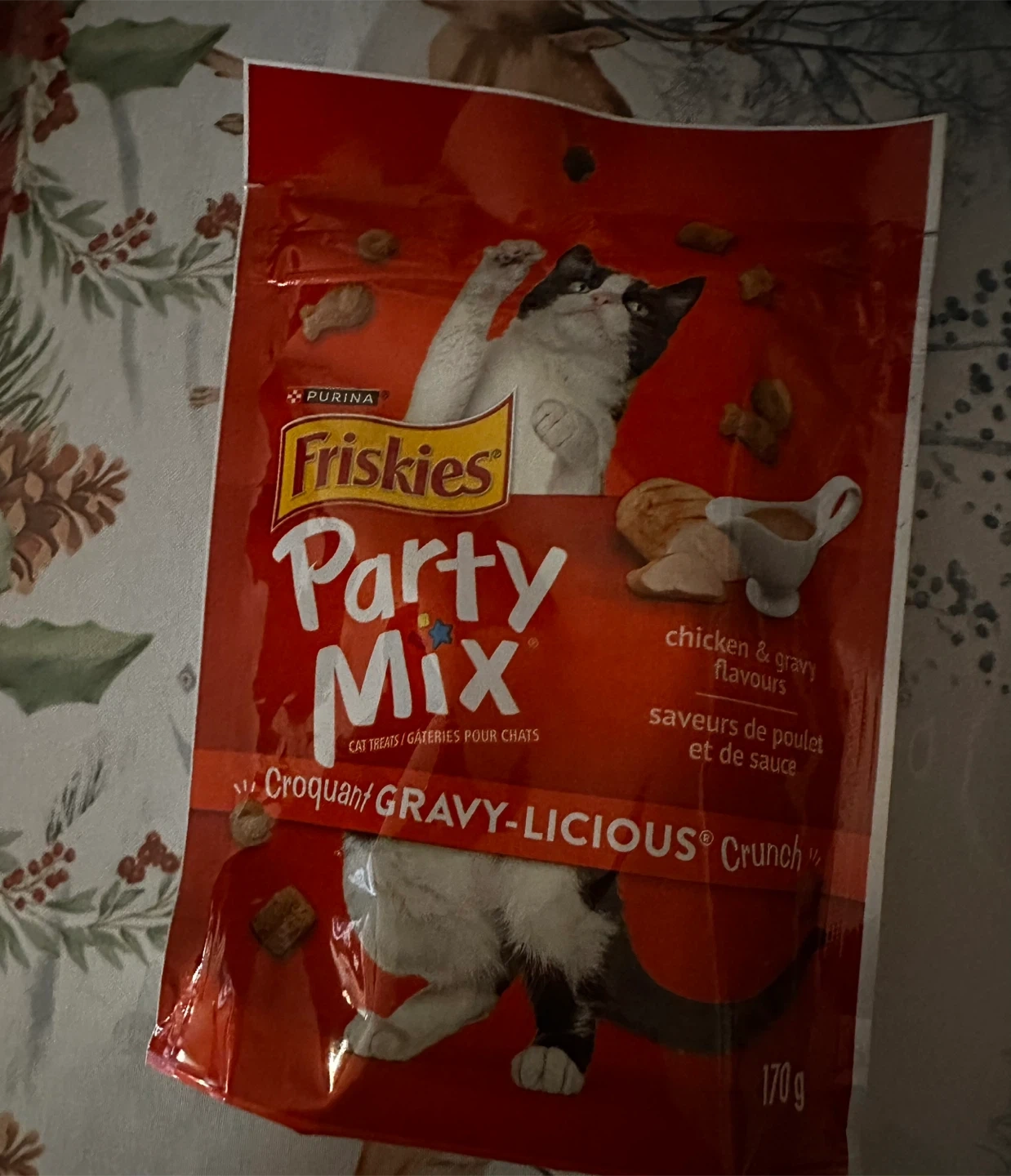 Selling a bag of Friskies Party Mix cat treats in chicken and gravy flavour! These crunchy treats are a great way to reward your feline friend. Perfect for a little party for your cat!