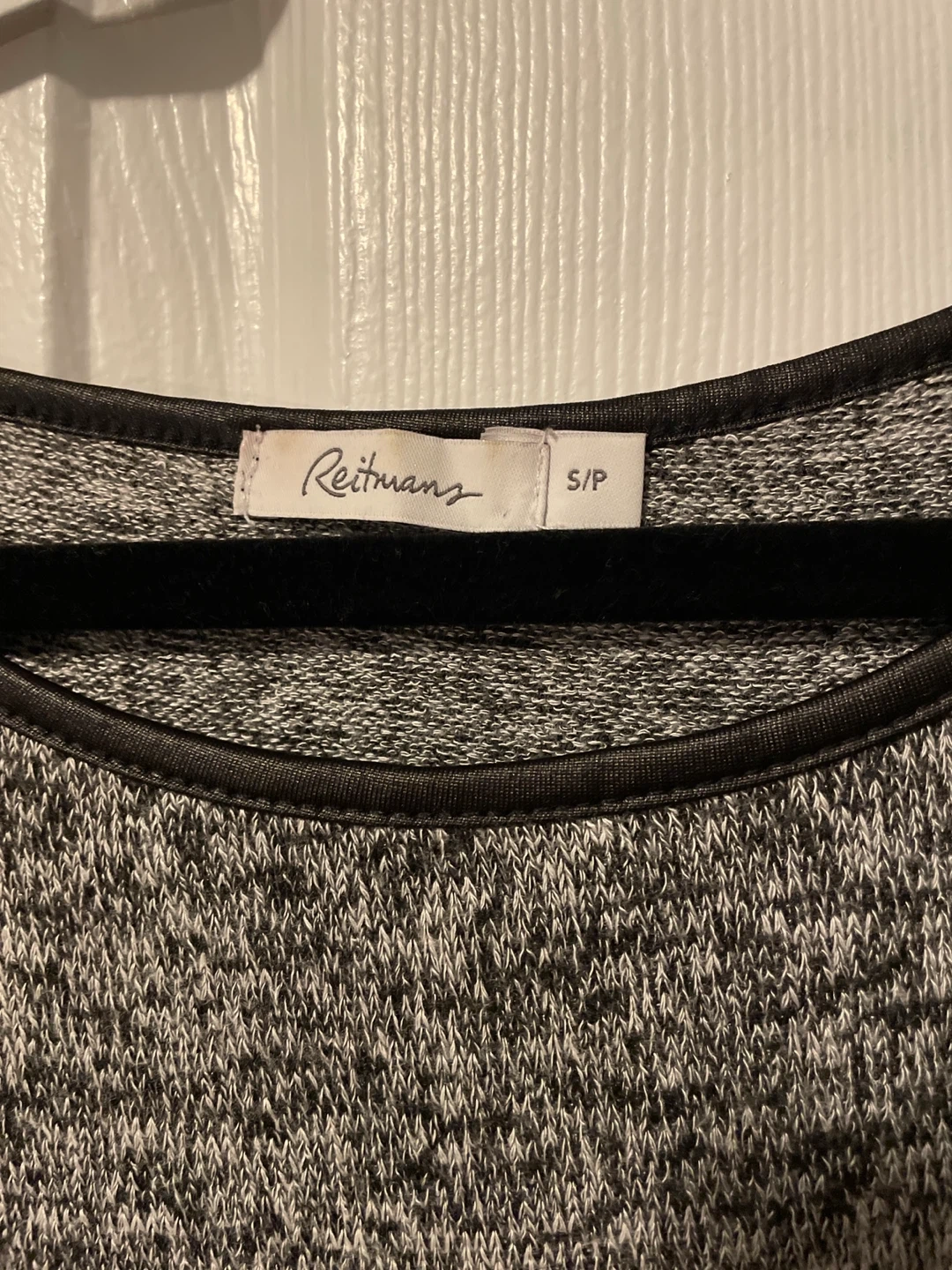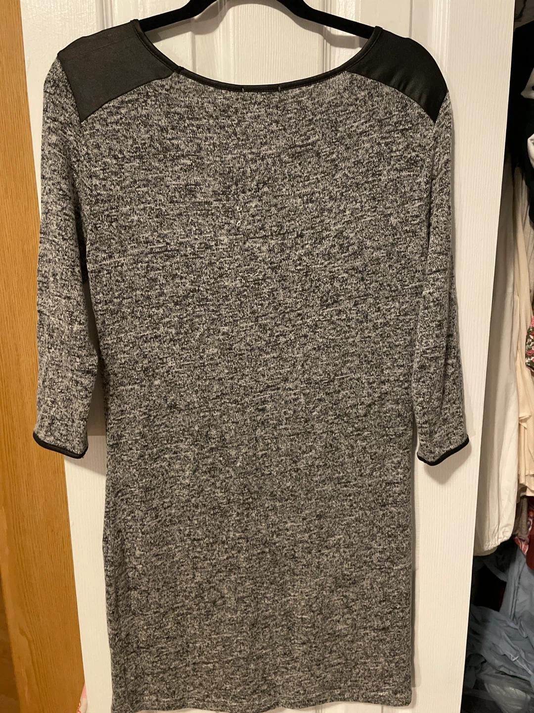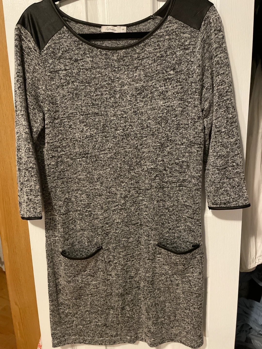 Giving a cute Reitmans dress in size Small. It's a grey and black colour with 3/4 sleeves and faux leather detailing around the neckline and pockets. Perfect for a casual day out or the office!
