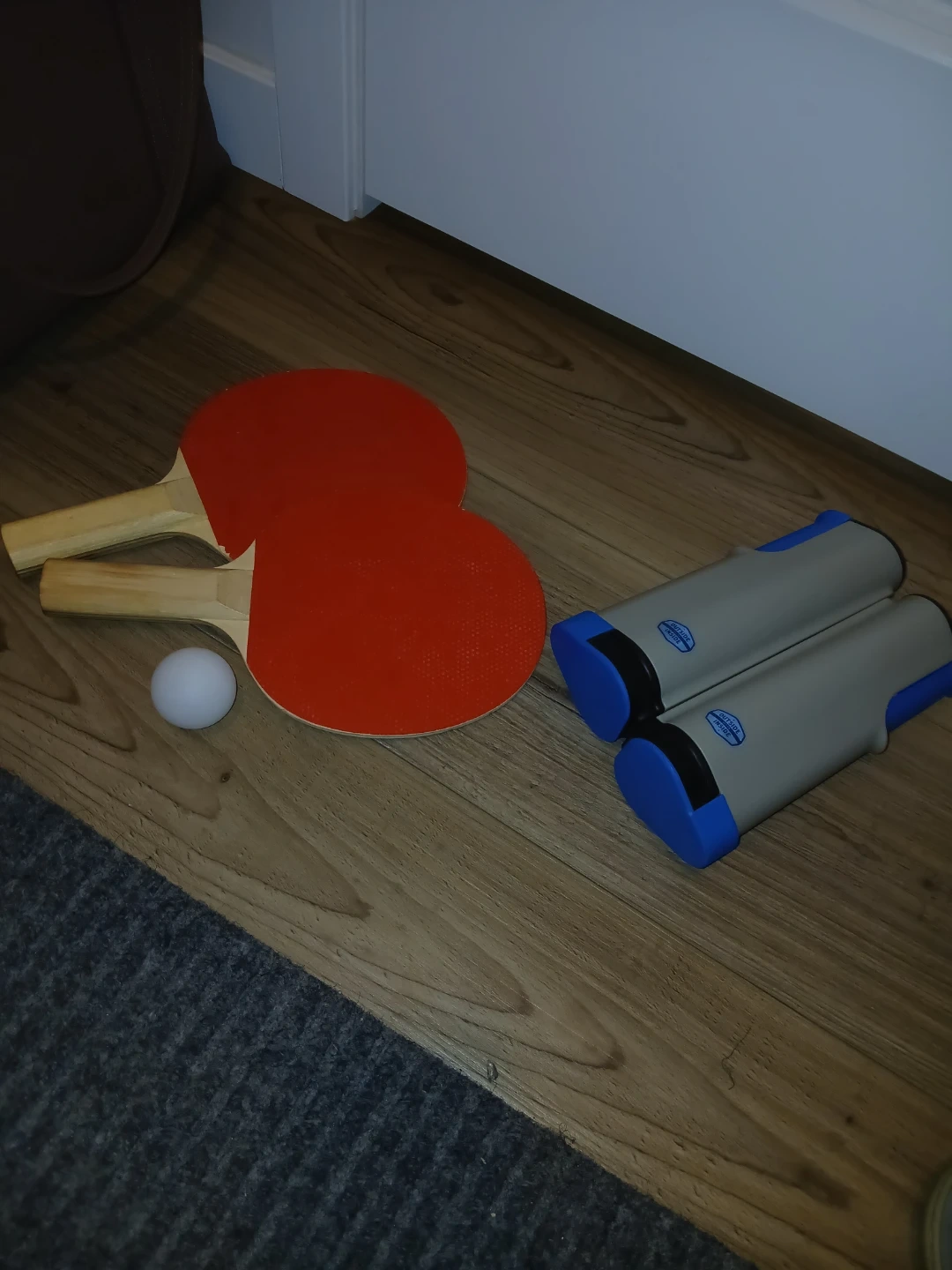 Selling a complete ping pong set! It includes two paddles with textured red and black rubber surfaces, a retractable net with blue and grey components, and a ping pong ball. Comes in a convenient carrying bag for easy storage and transport