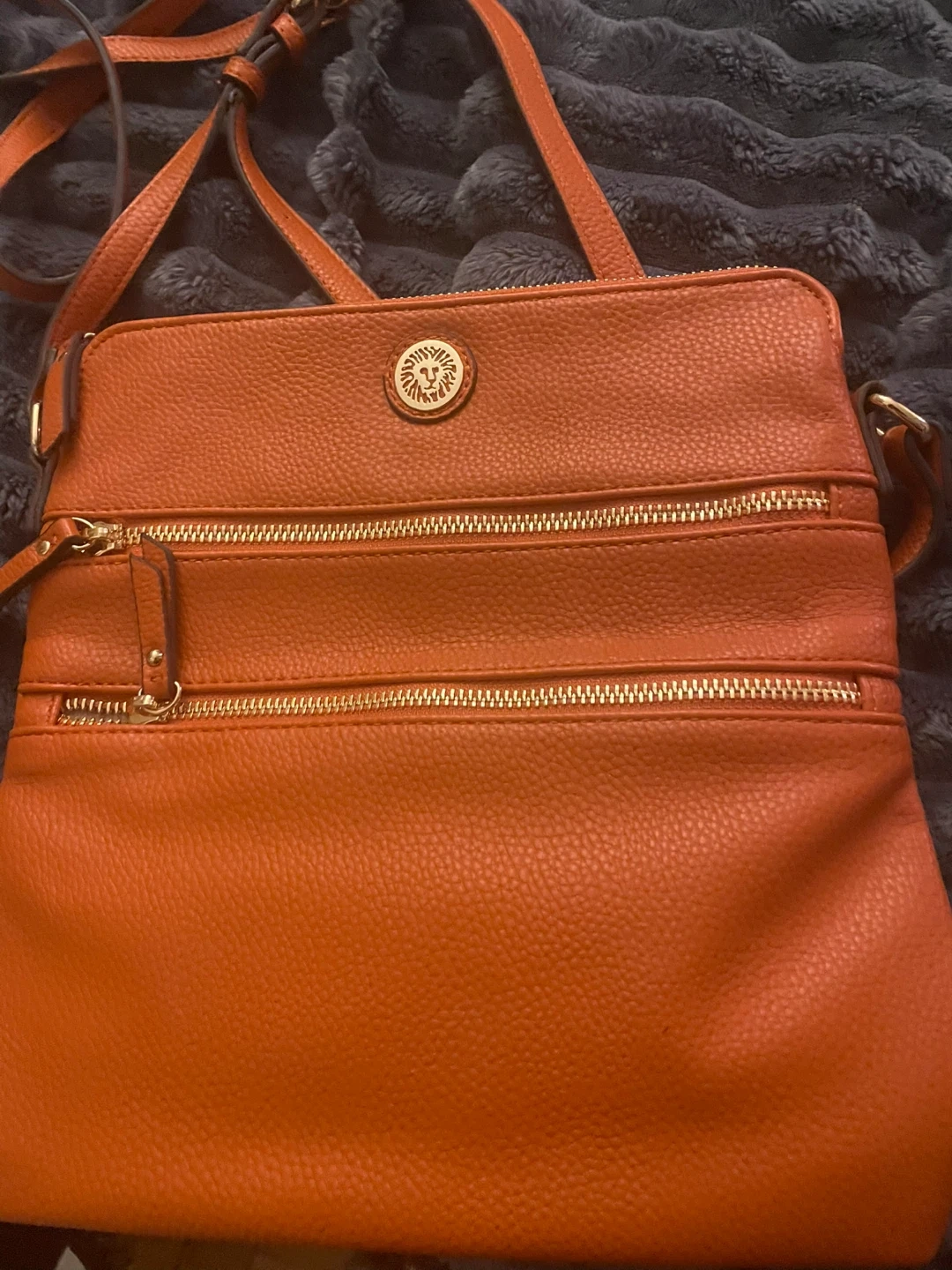 Here's a stylish Anne Klein crossbody bag in a lovely orange color! It features gold-tone zippers and the signature Anne Klein lion logo. Perfect for everyday use and keeping your essentials organized!