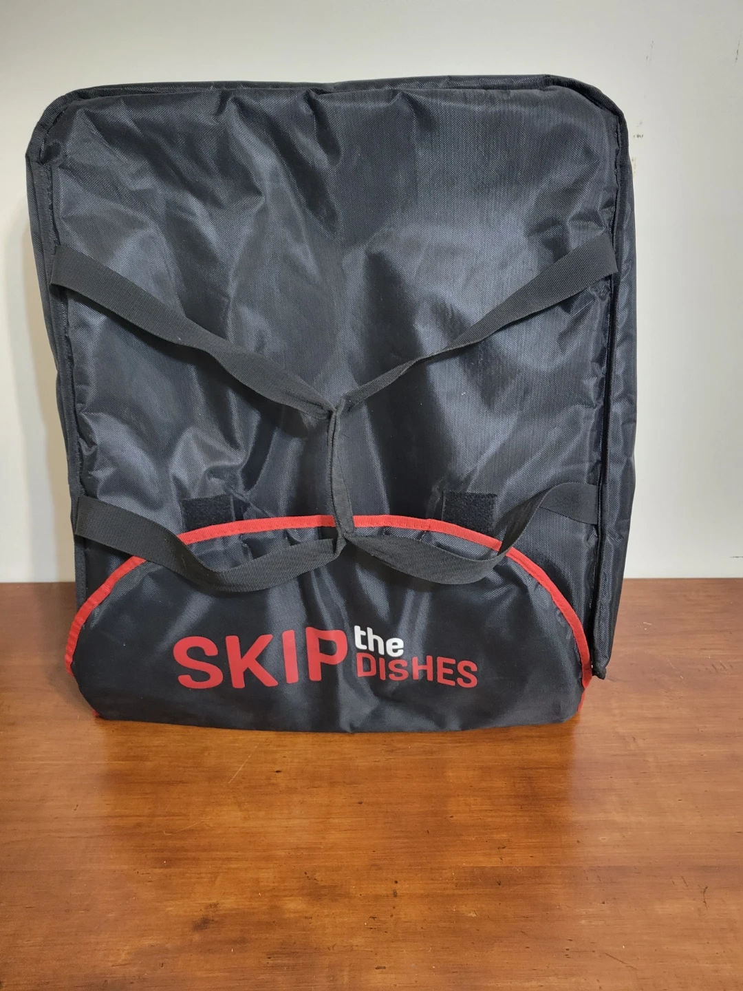 Selling a Skip The Dishes delivery bag! It's black with red trim and has the Skip The Dishes logo on the front. Perfect for food delivery or keeping things insulated.