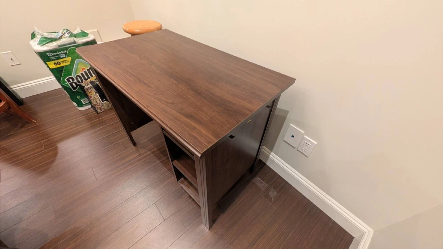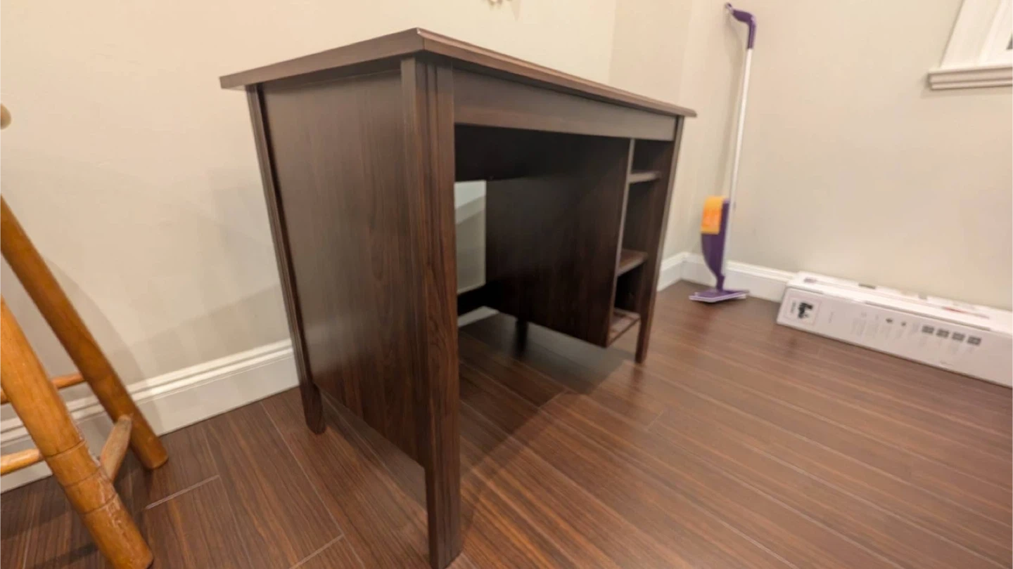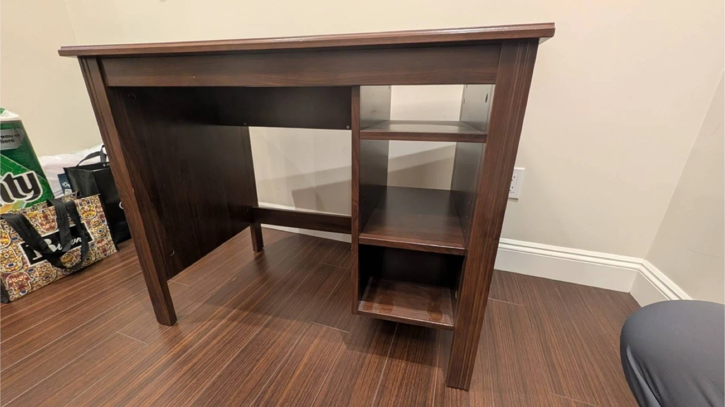 Selling a brown desk that's perfect for a home office or study space! It features built-in shelves on the side, great for storing books or supplies. The desk is approximately 90 cm (35 3/8") wide and 73 cm (28 3/4") tall, offering a comfortable workspace.