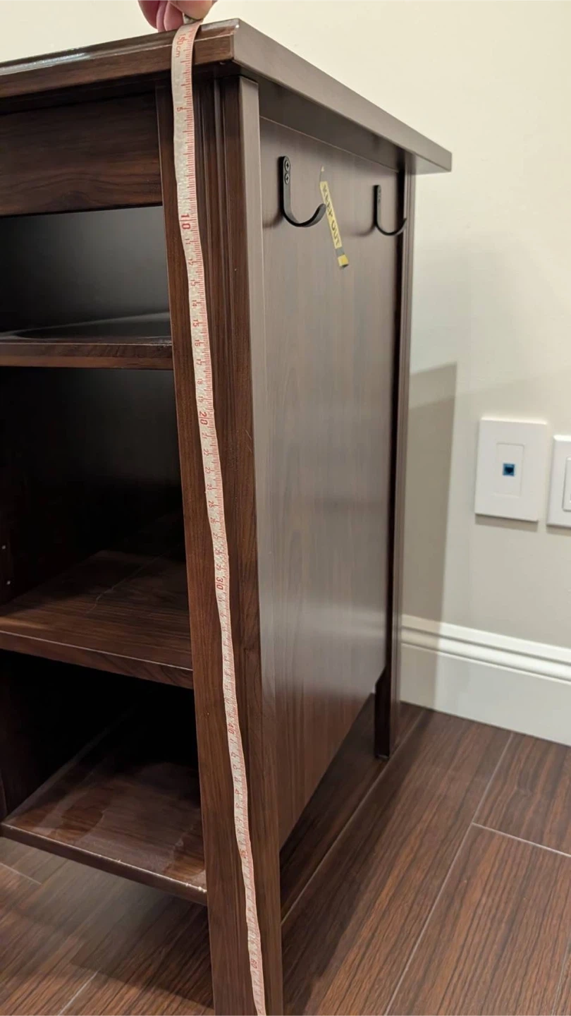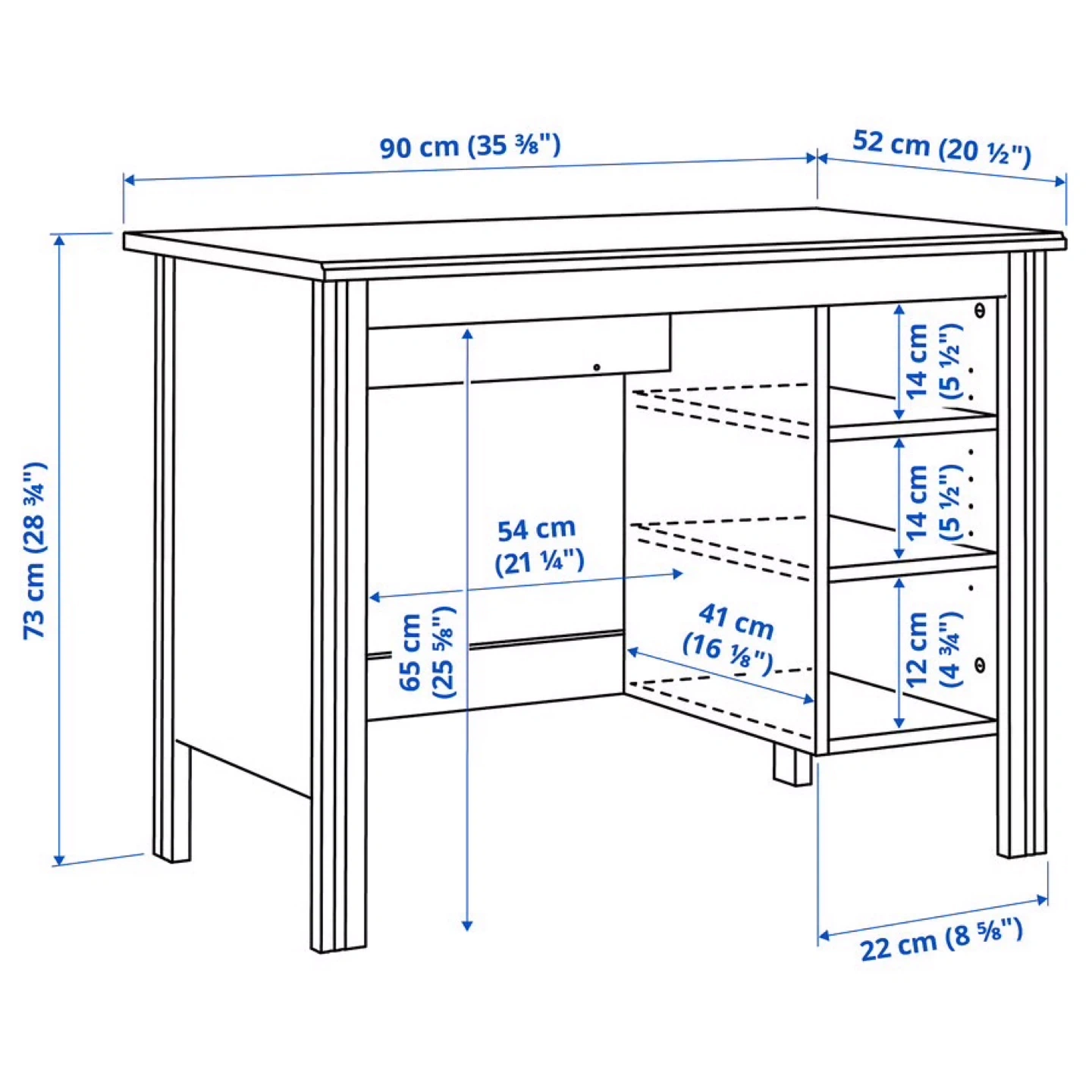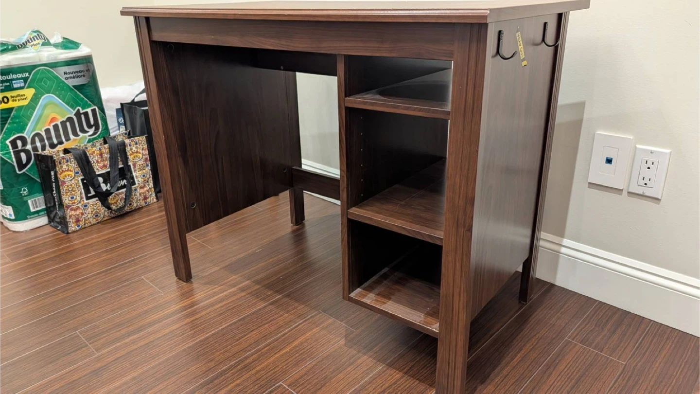Selling a brown desk that's perfect for a home office or study space! It features built-in shelves on the side, great for storing books or supplies. The desk is approximately 90 cm (35 3/8") wide and 73 cm (28 3/4") tall, offering a comfortable workspace.