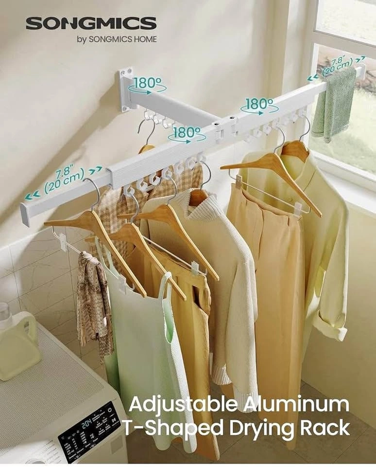 The SONGMICS Wall-Mounted Clothes Drying Rack is perfect for small spaces. Its foldable, extendable arms and 21 swivel hooks make it easy to dry clothes, towels, or delicates without clutter. When not in use, simply fold it flat against the wall β perfect for laundry rooms, bathrooms, or balconies.