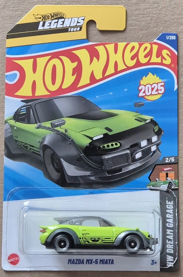 Mazda MX-5 Miata Collection: 2025 Hot Wheels Mainline Series: HW Dream Garage Colour: Lime Green Description: Detailed taillights, black accent striping, "トフオートワークス", Hot Wheels logo on sides, black hood striping, and detailing Asking for $3. If the ad is still up, it is available. Check out my other ads