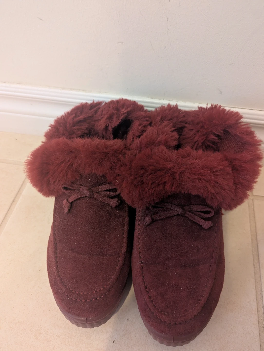 Comfy burgundy moccasin-style slippers with faux fur trim! They look great for wearing around the house on chilly days. They look to be in good condition.