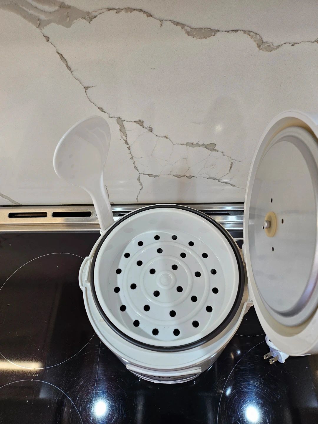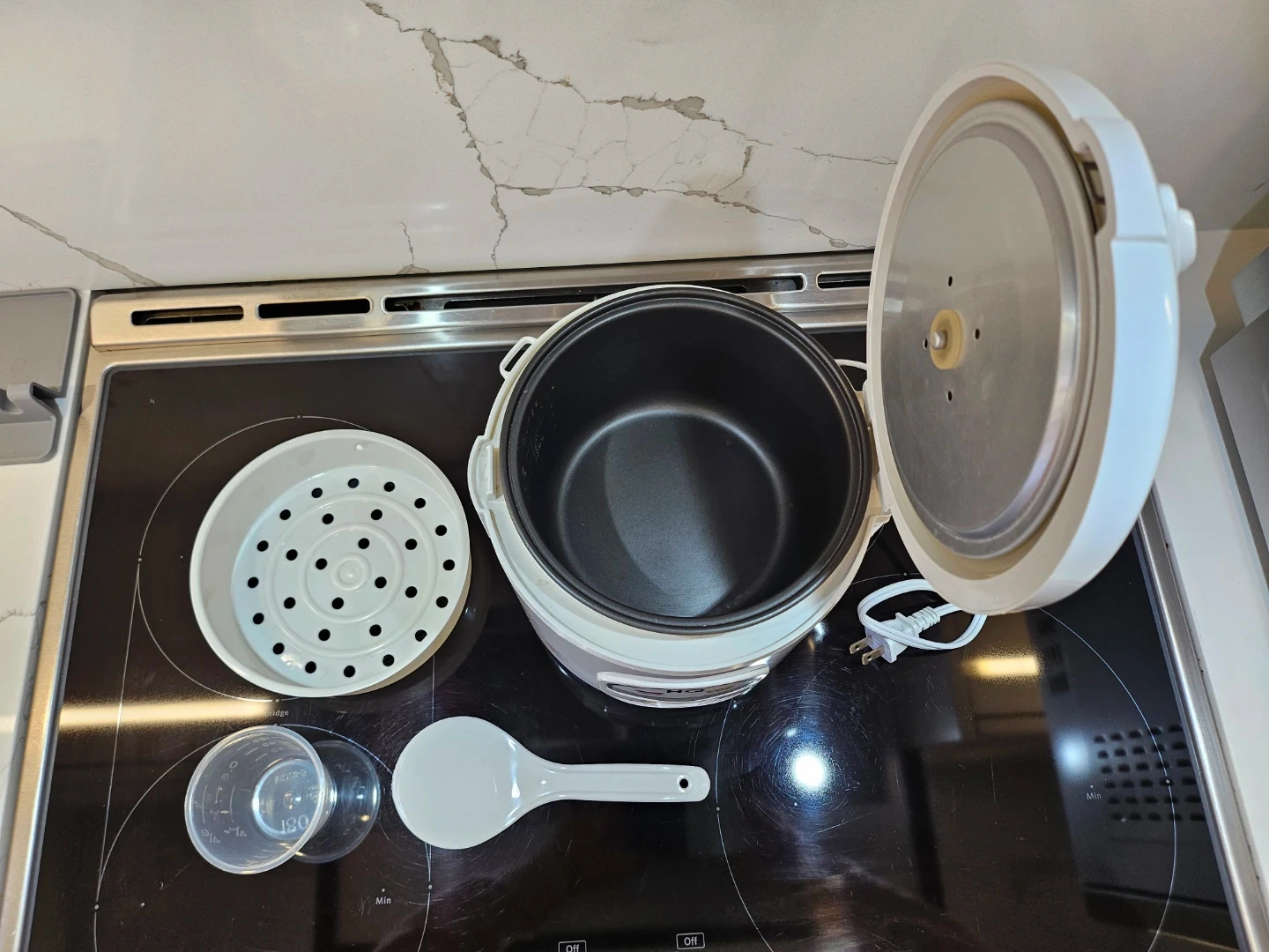 It comes with all the accessories, including a steamer basket, measuring cup, and rice paddle.