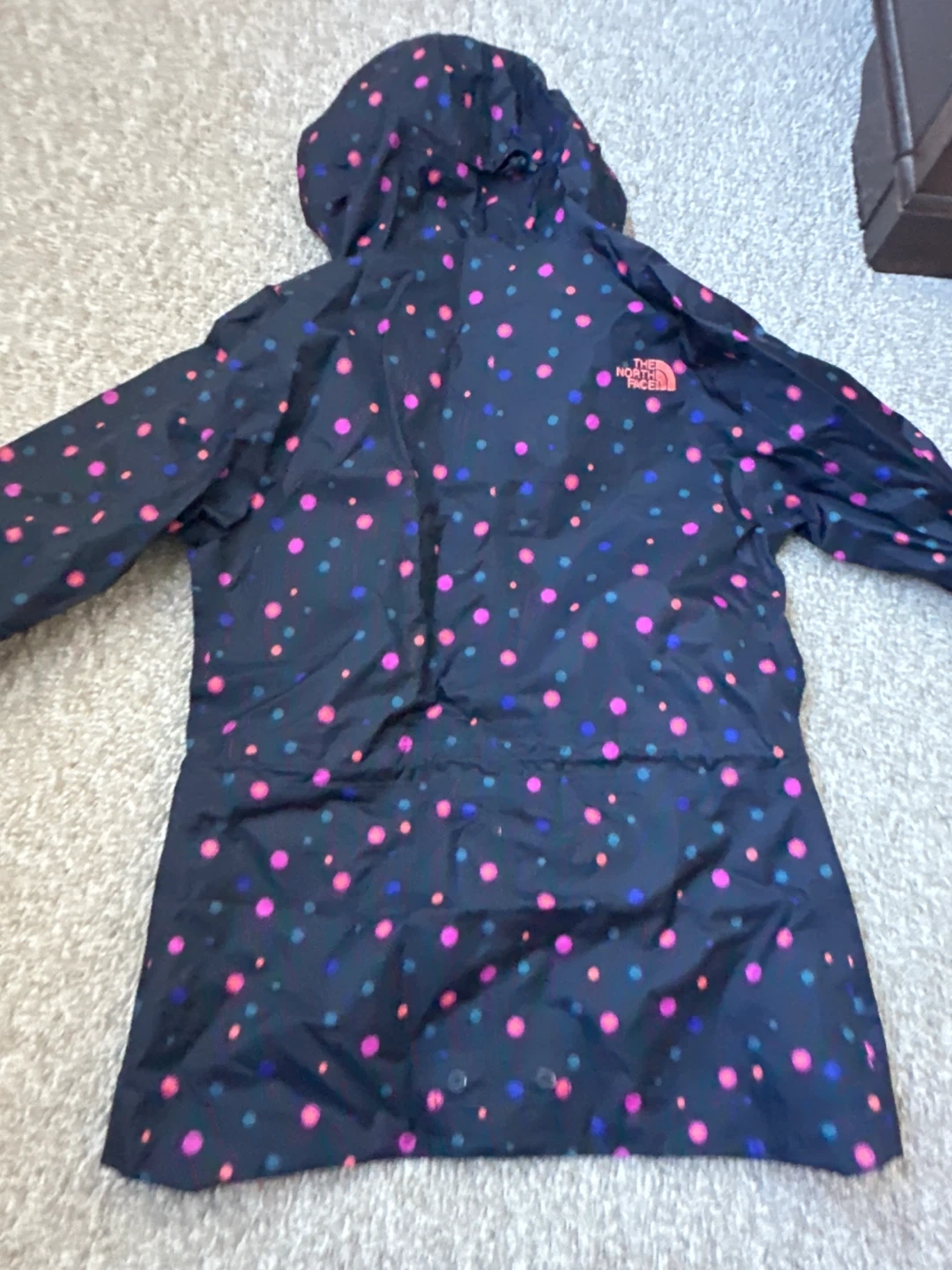 Selling a cute The North Face rain jacket in size XS. It's a navy colour with a fun polka dot pattern of pink, blue, and purple! Made from 100% recycled polyester.
