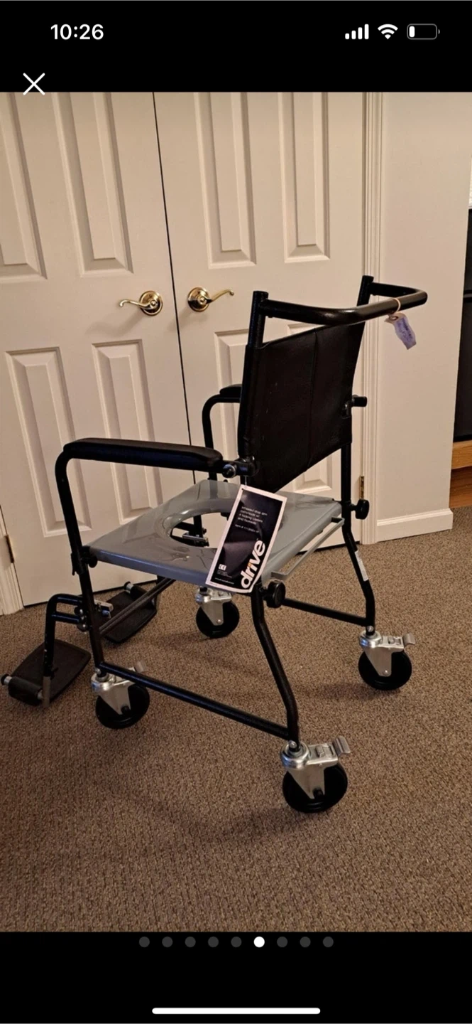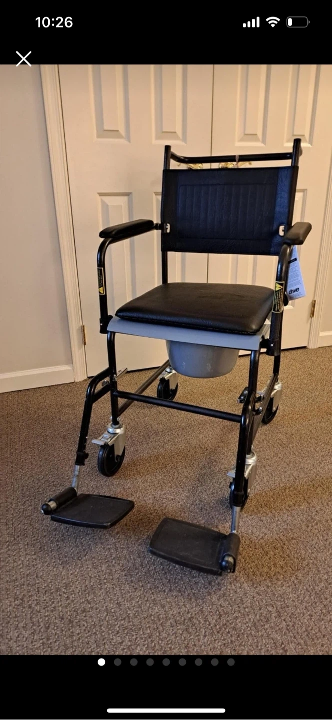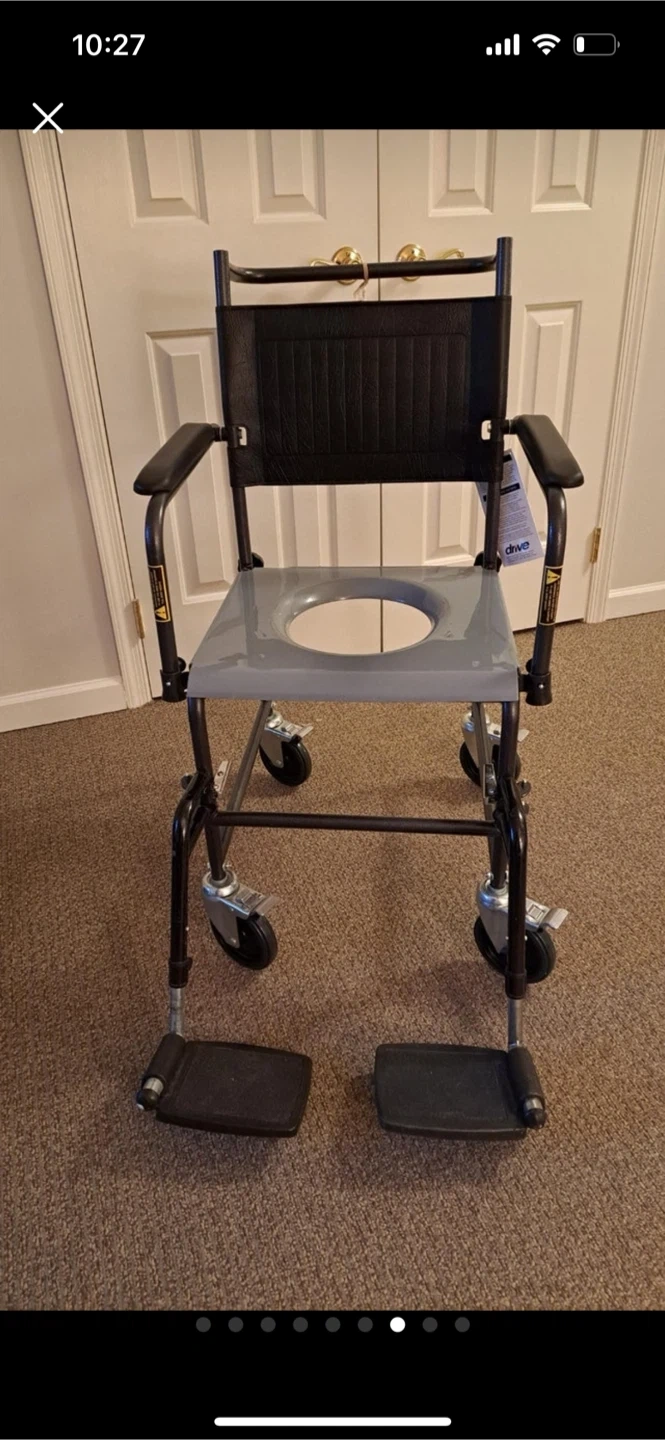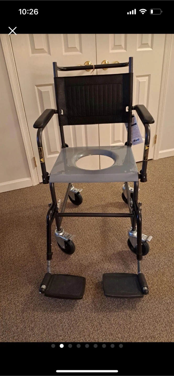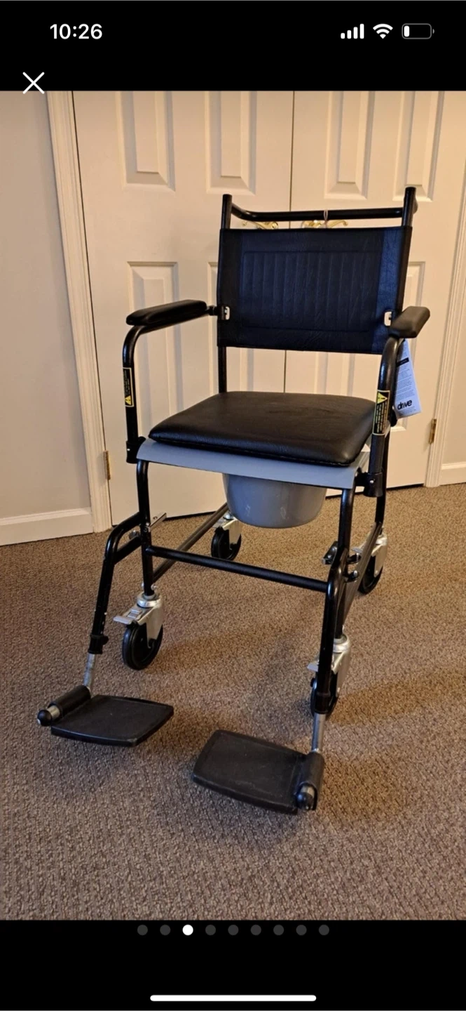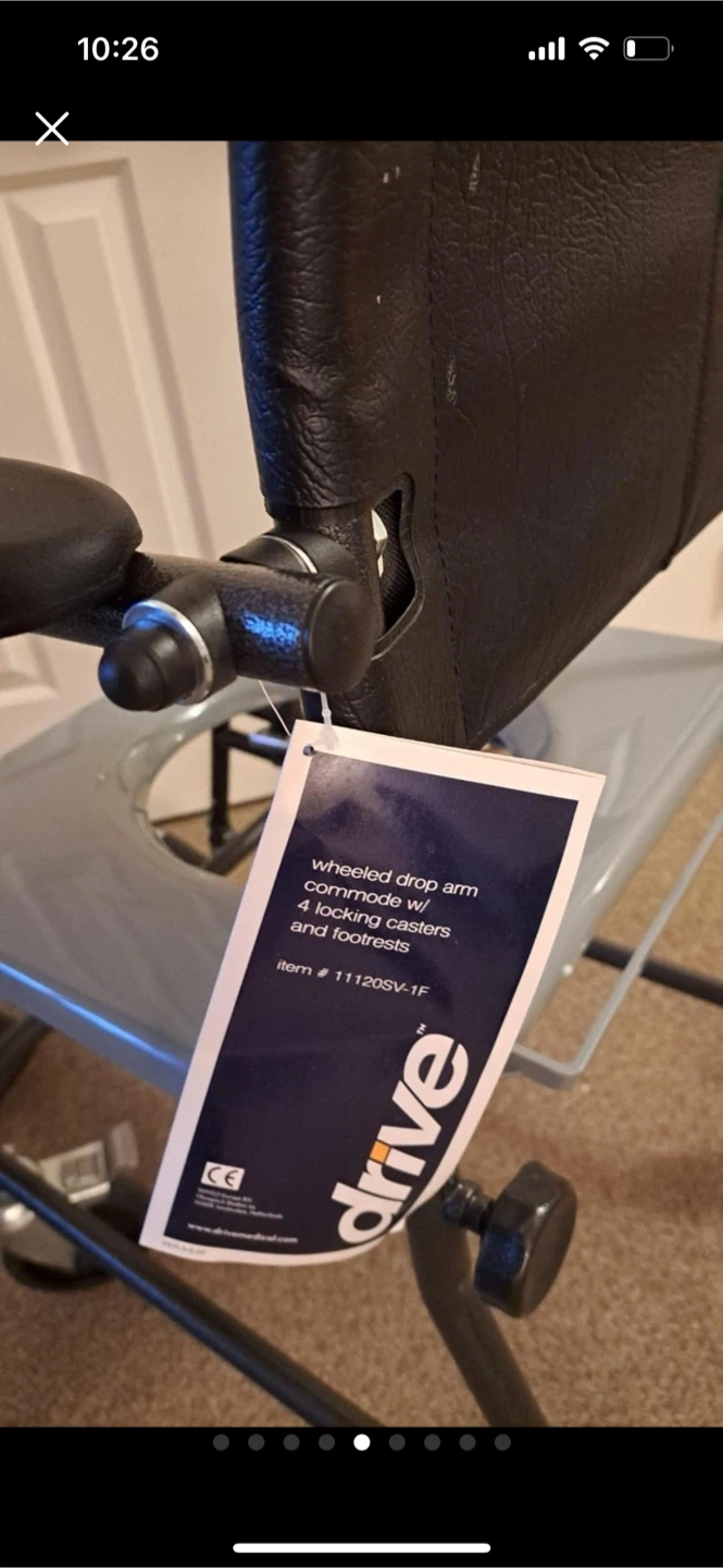 Selling a Drive wheeled drop arm commode with 4 locking casters and footrests. Item number is 11120SV-1F
