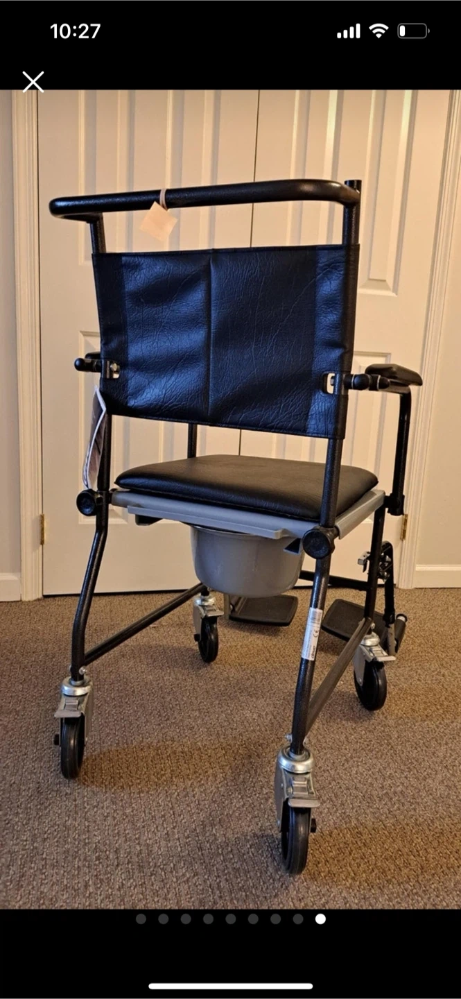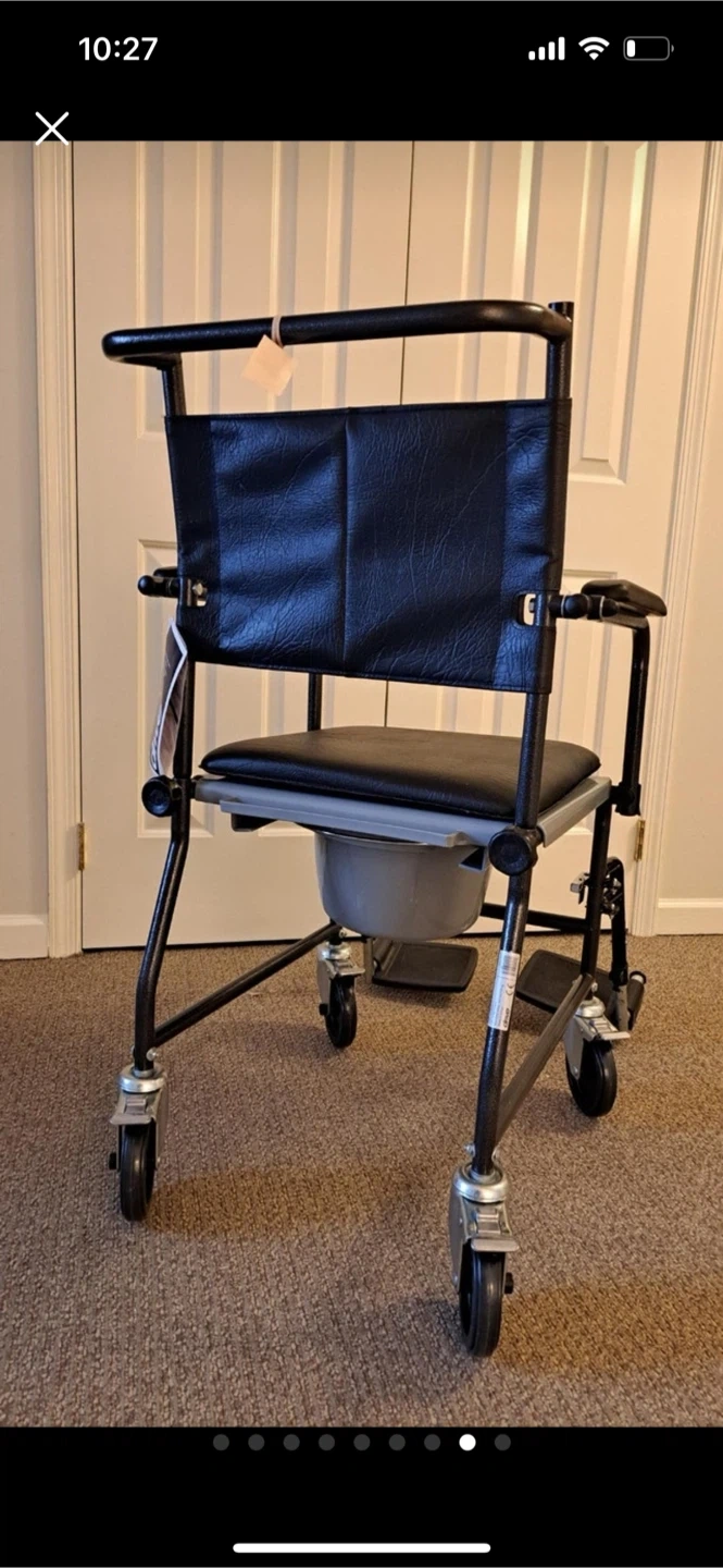 Here are the specs: Simple, tool-free assembly Fully knock-down for easy storage and transport Drop-arms allow for easier lateral transfers Swing-away detachable footrests Collection pan included secures underneath the seat and can be easily removed from the backside of the unit Comfortable, wide backrest Durable and easy-to-clean padded vinyl seat cover.