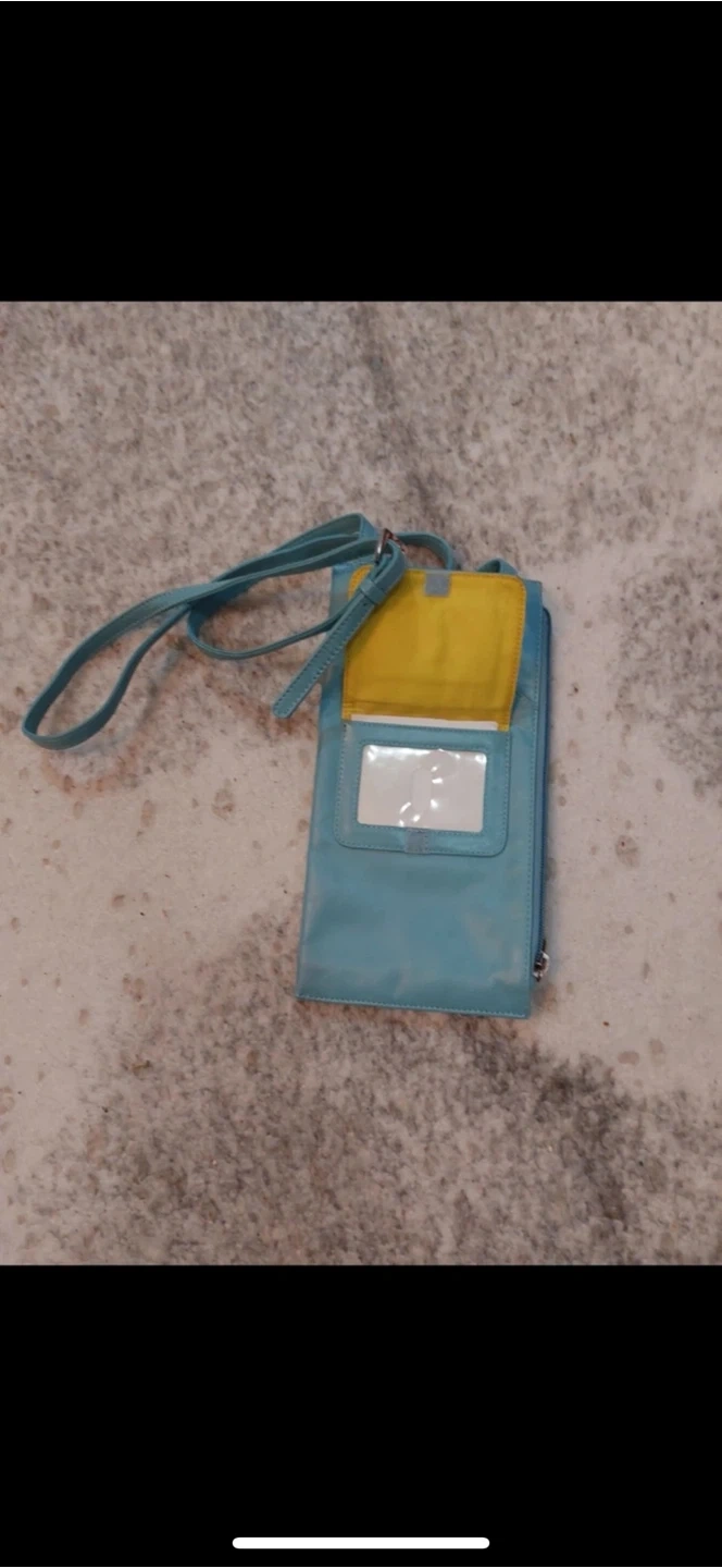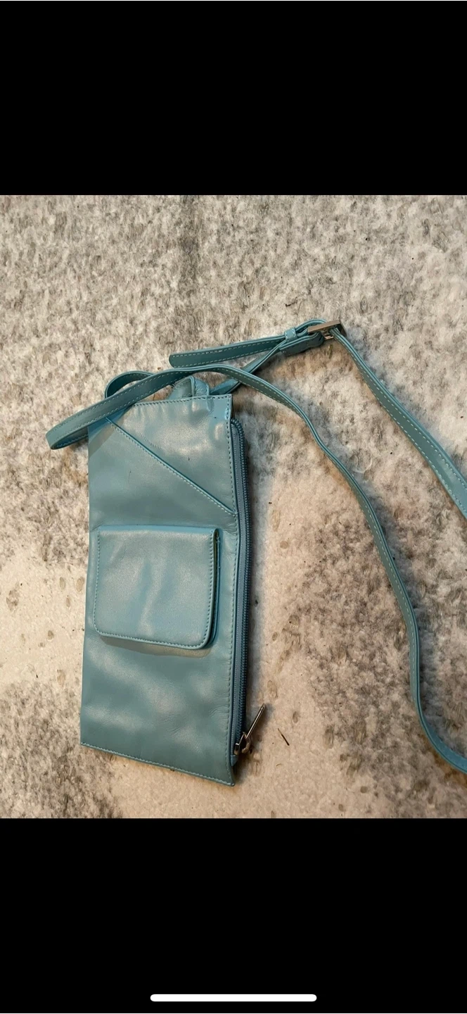 Selling a cute Danier crossbody bag in a lovely light blue colour. It's made of leather and has a yellow interior. Perfect for carrying your essentials!