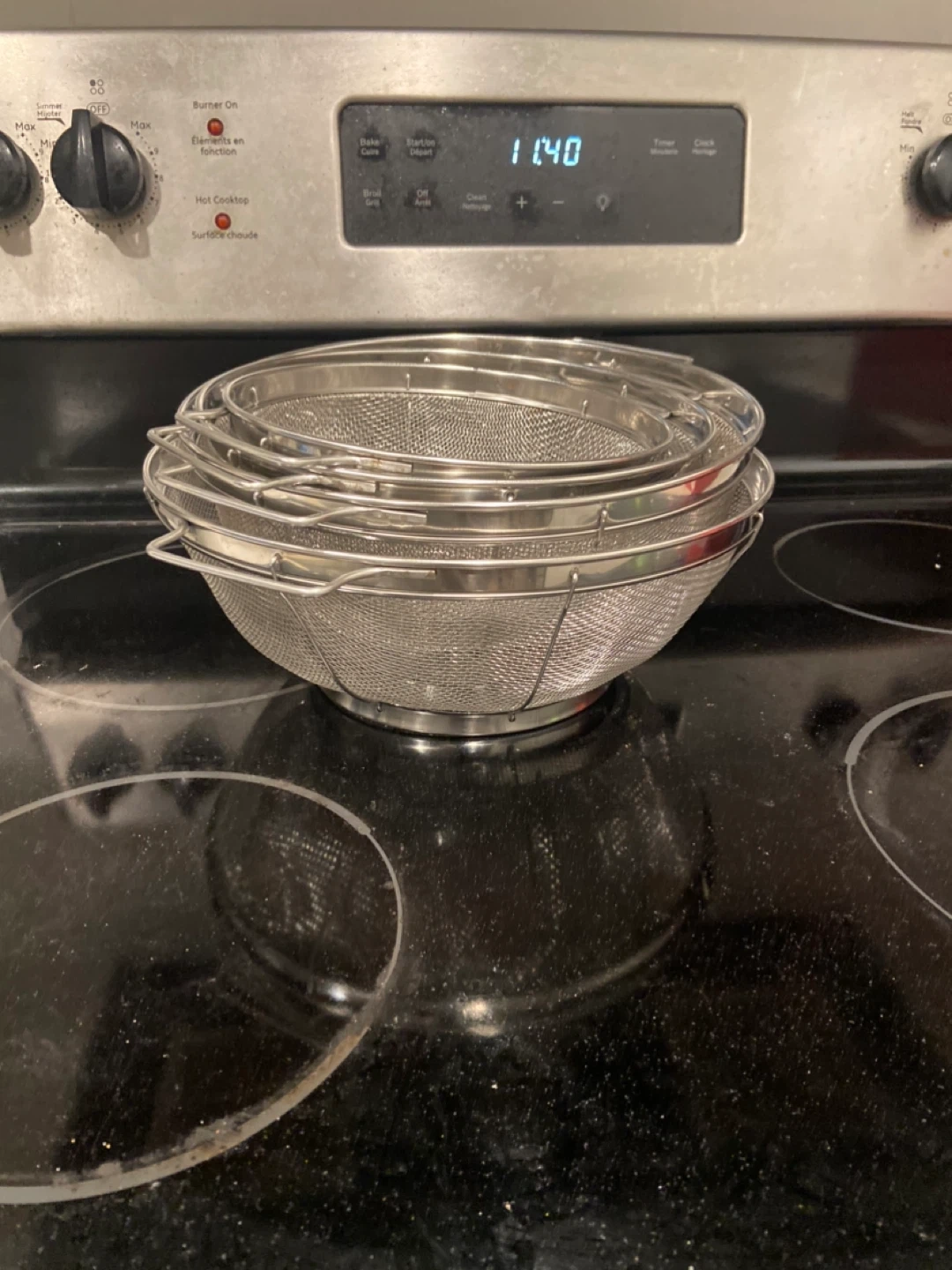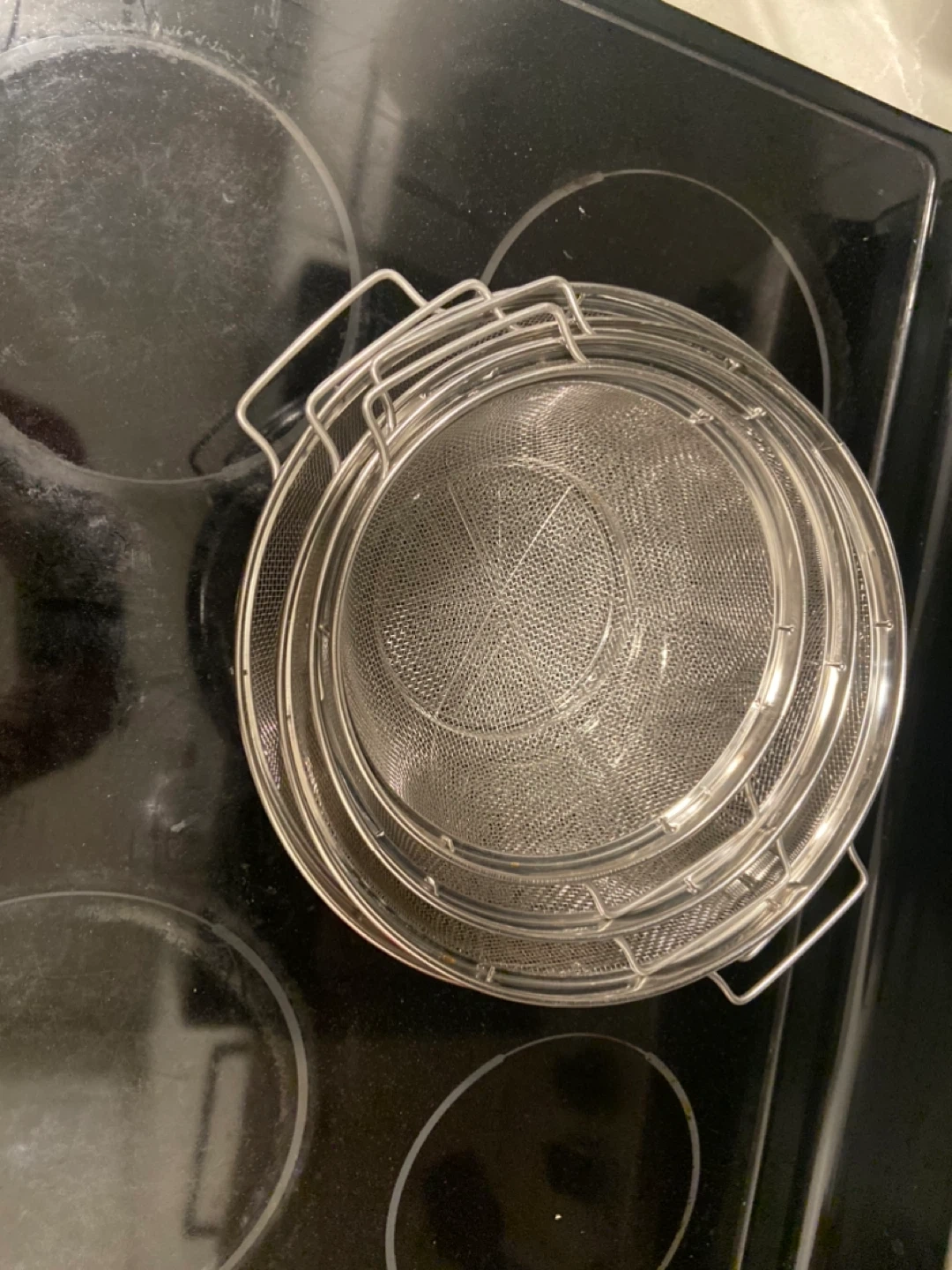 Set of four stainless steel strainers/colanders. They're in great condition and ready for a new kitchen! These are perfect for rinsing fruits, vegetables, or draining pasta. They nest together for easy storage, and are dishwasher safe.