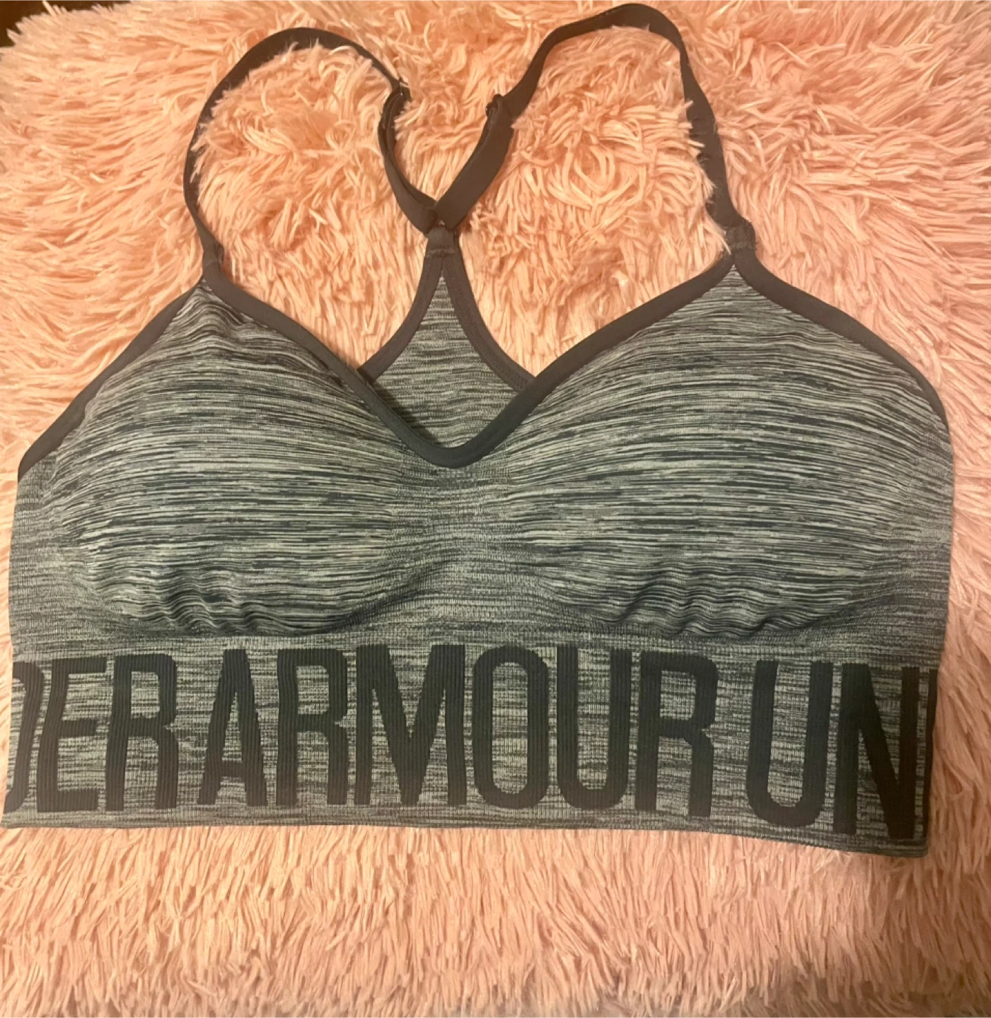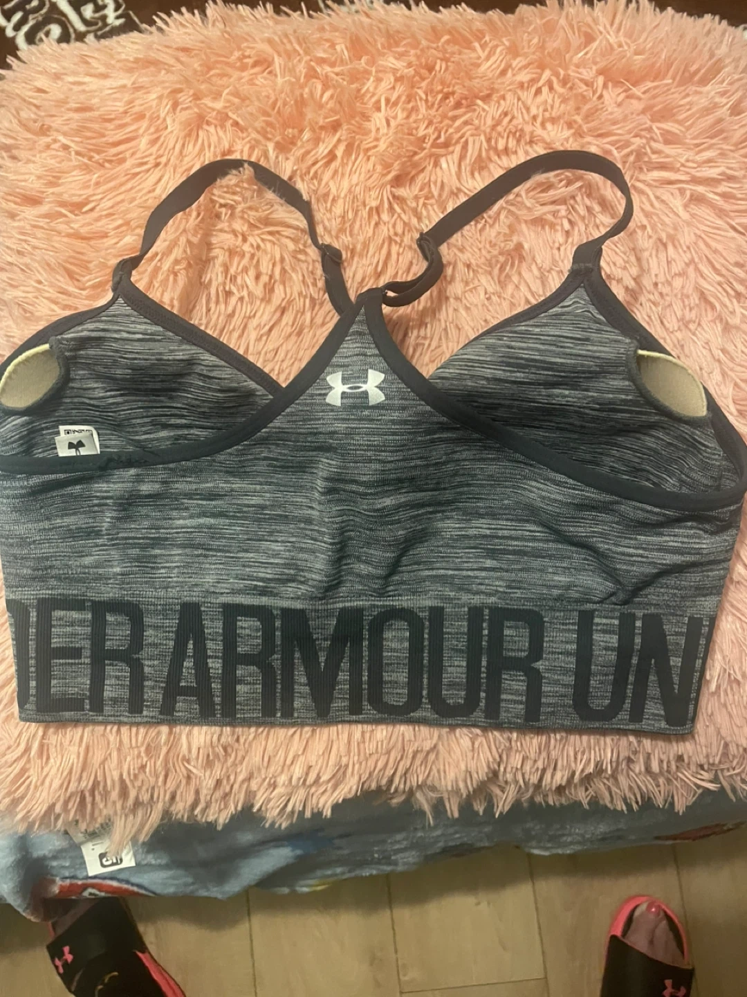 Selling an Under Armour sports bra in size medium It's in new condition and ready for your workouts! The bra is a stylish grey colour and features the Under Armour logo. It's made from a comfortable material, perfect for any activity
