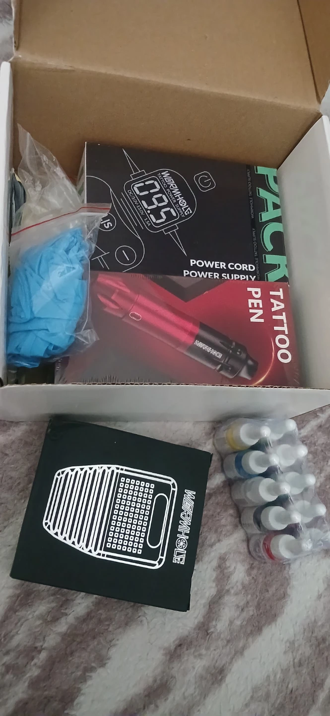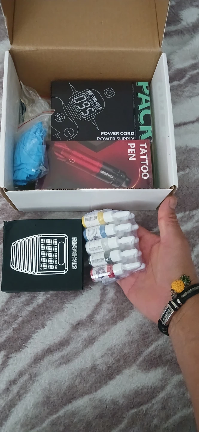 I'm selling a brand new tattoo pen kit. It includes everything shown in the photos, including the pen, power supply, ink, and other accessories. Everything is in its original box and ready to use!