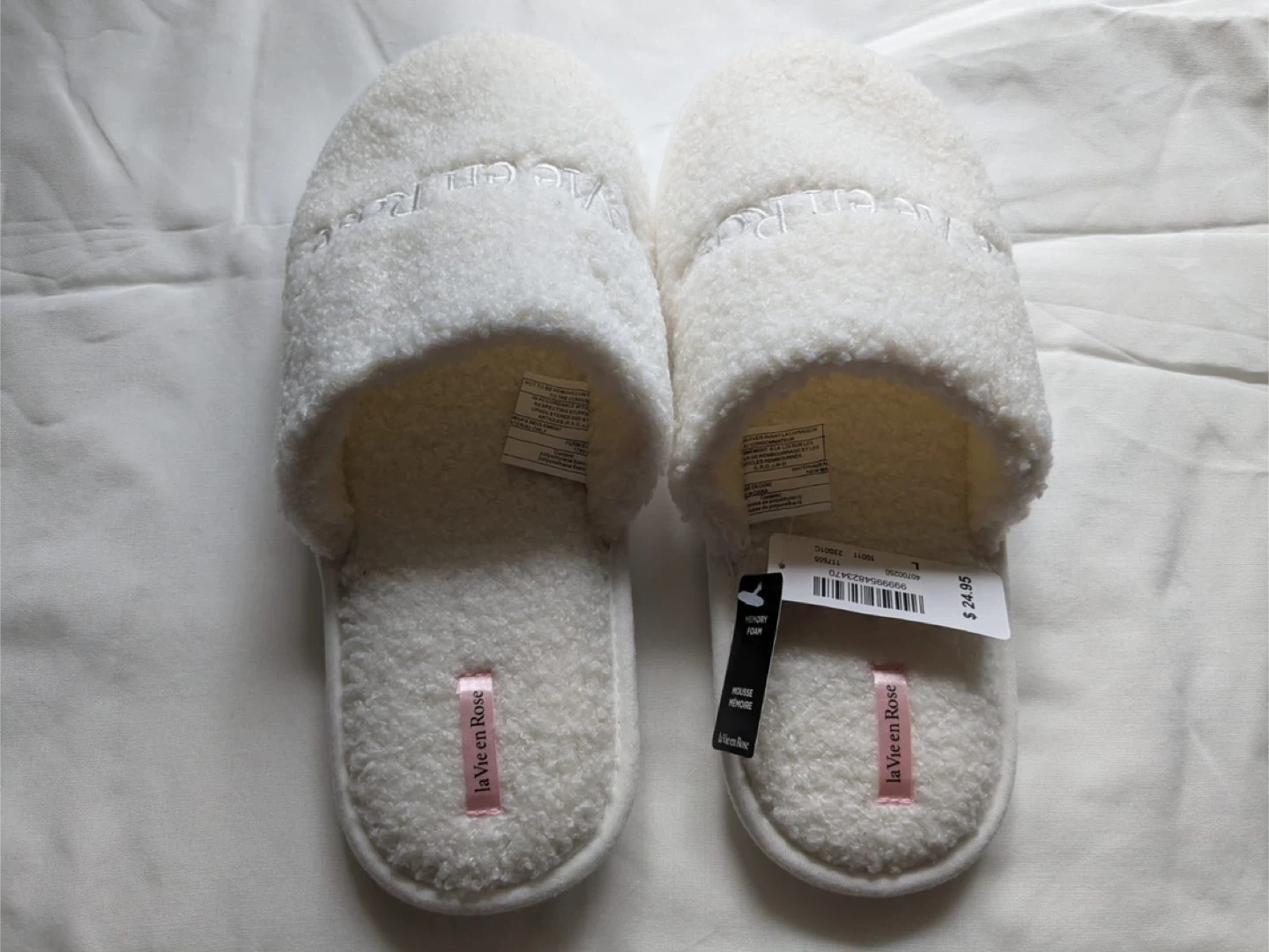 These La Vie en Rose slippers are brand new and ready to keep your feet cozy! They're a soft, fluffy white and come in size L. They're super comfy for wearing around the house