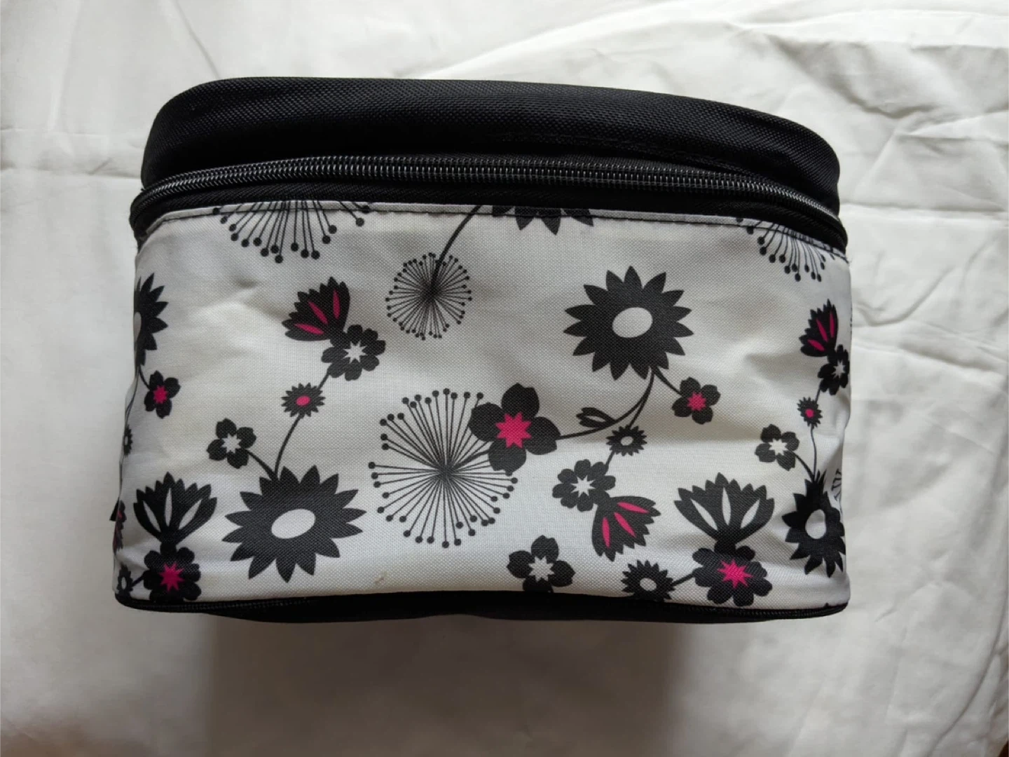 Here's a Thermos lunch bag that's perfect for travel or everyday use. It has a stylish floral pattern on the sides and a solid black top. It's in great condition and ready to go!