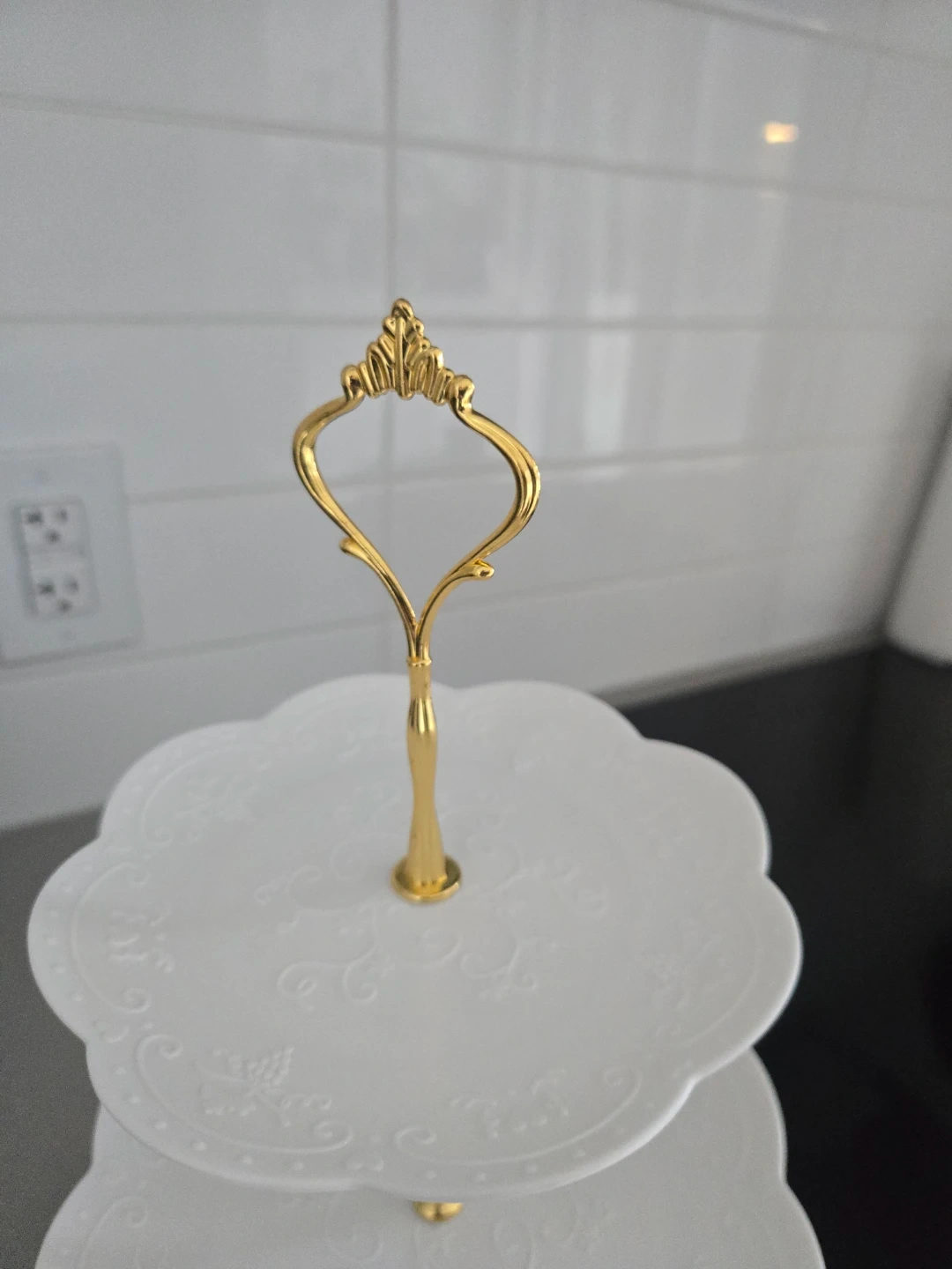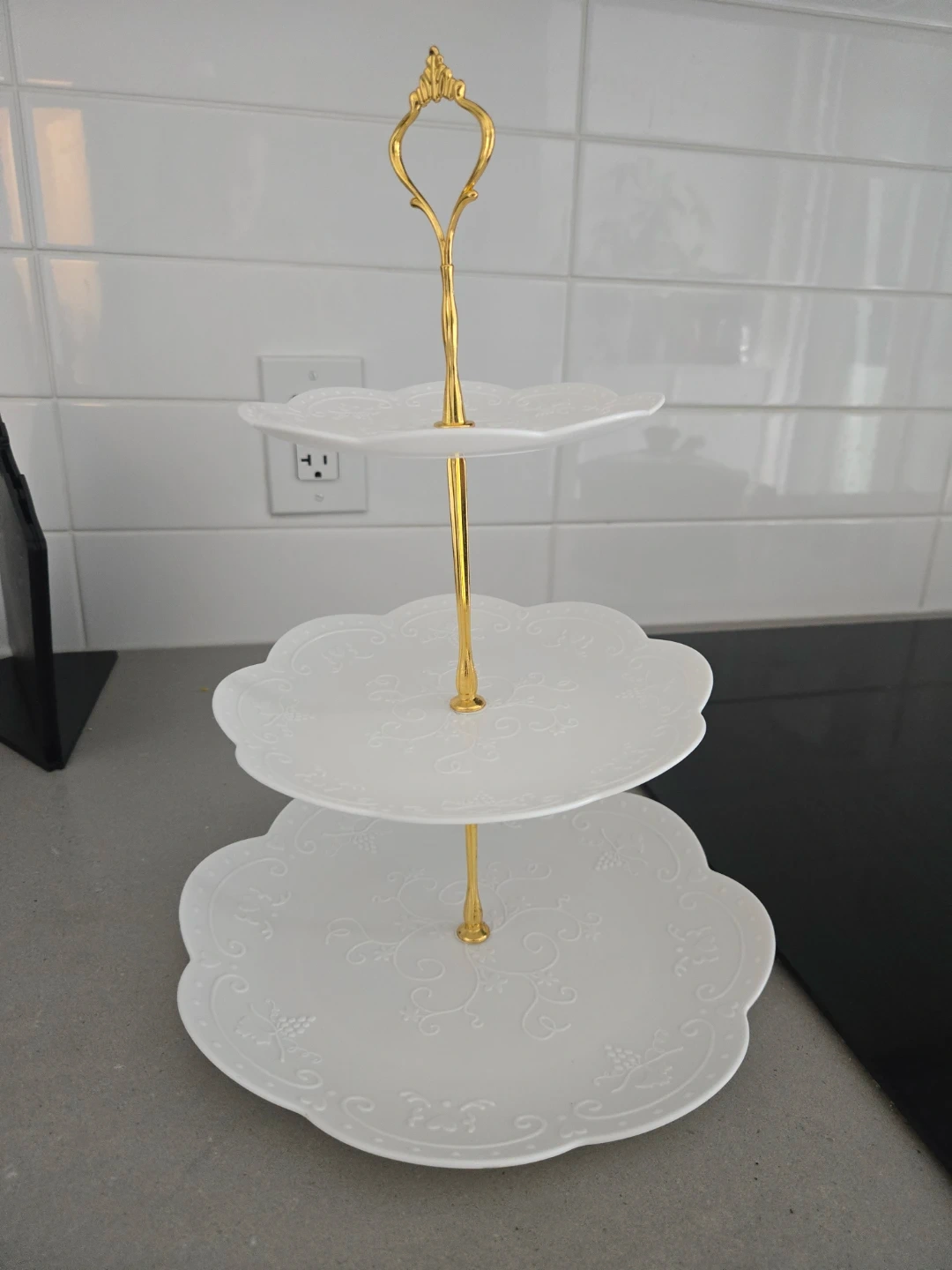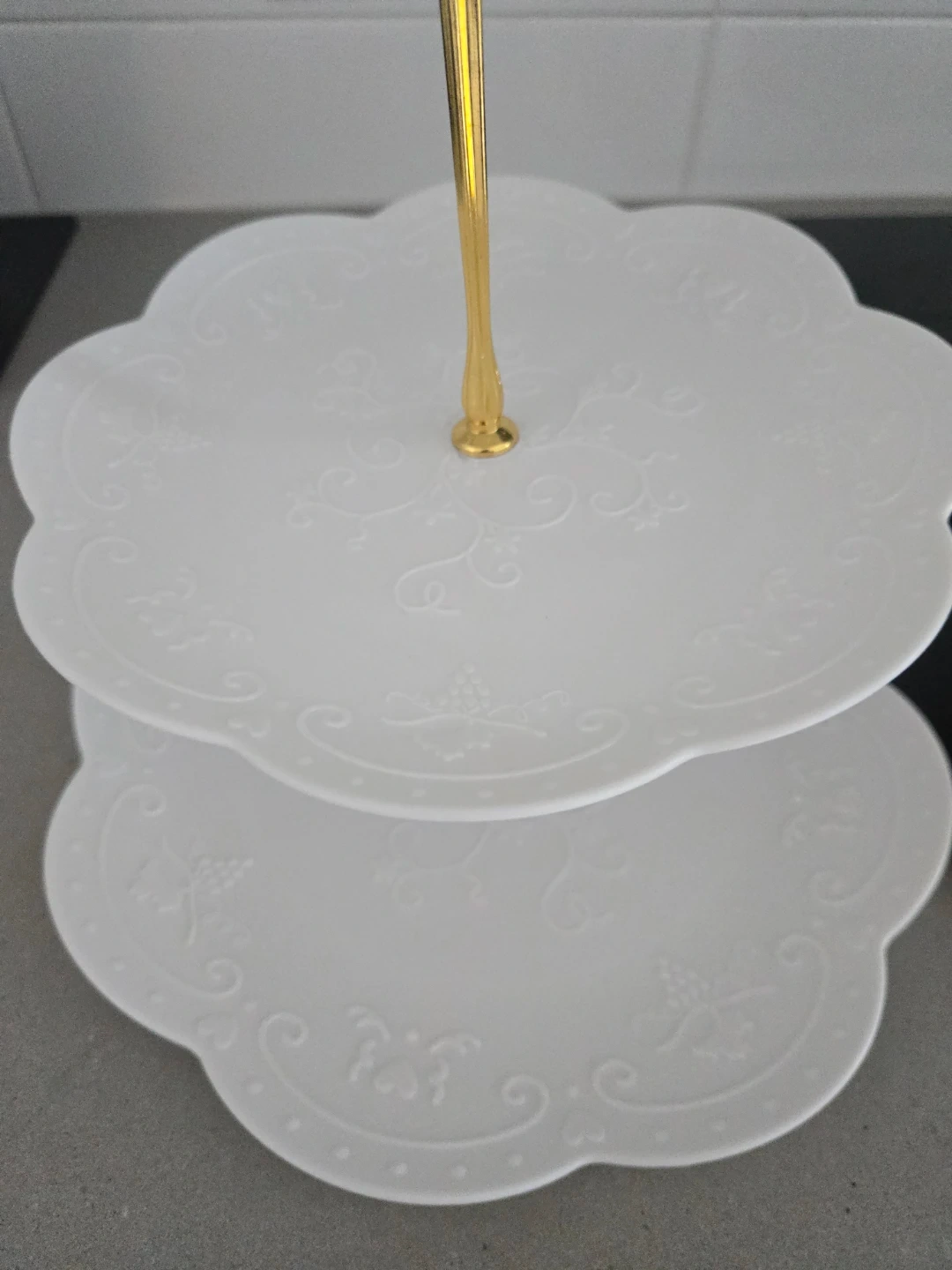 Here's two lovely 3-tier dessert stand! It's perfect for displaying cupcakes, appetizers, or any treats you'd like to showcase. The stand is white with a gold-tone handle, adding a touch of elegance to your table setting