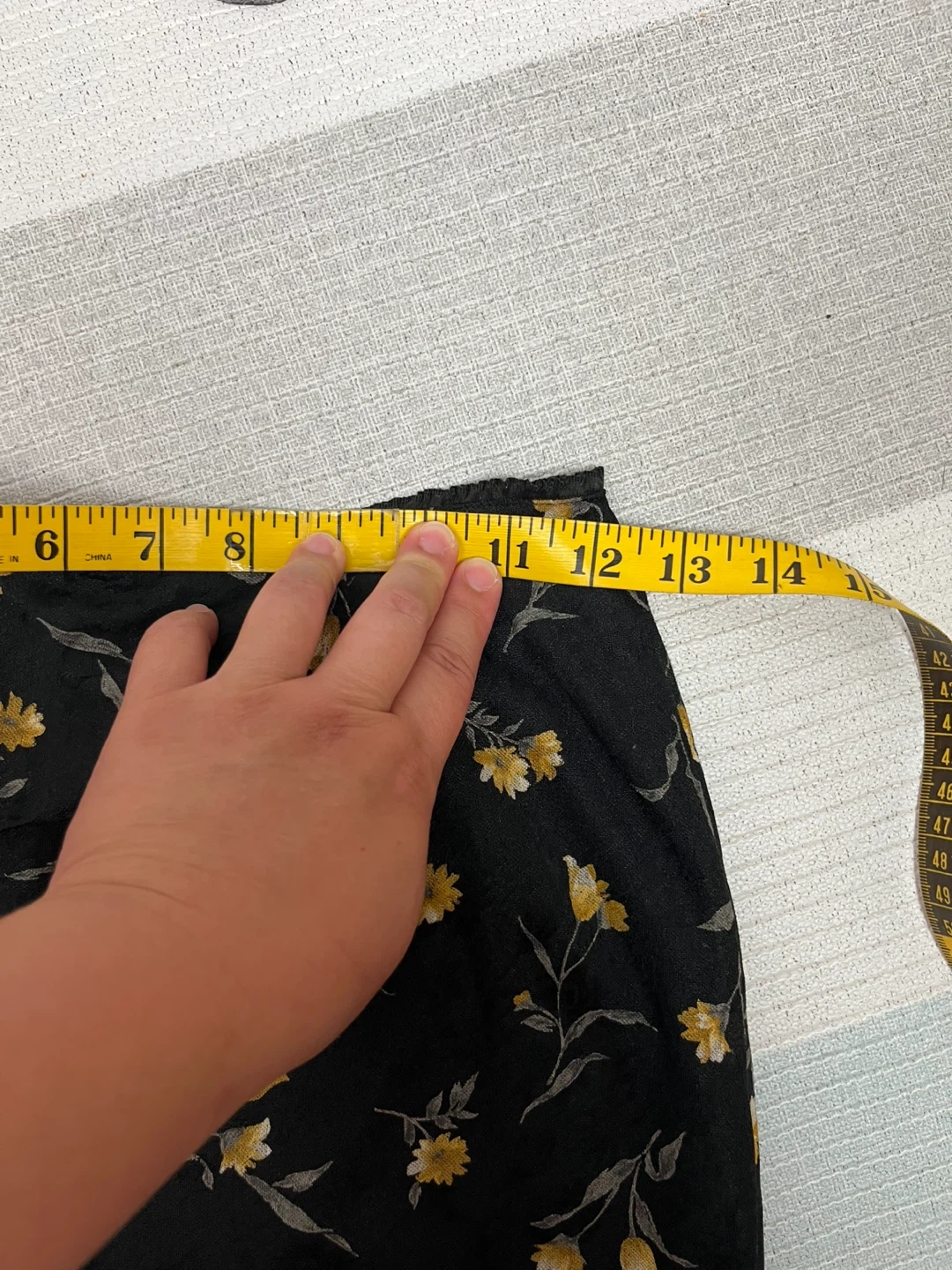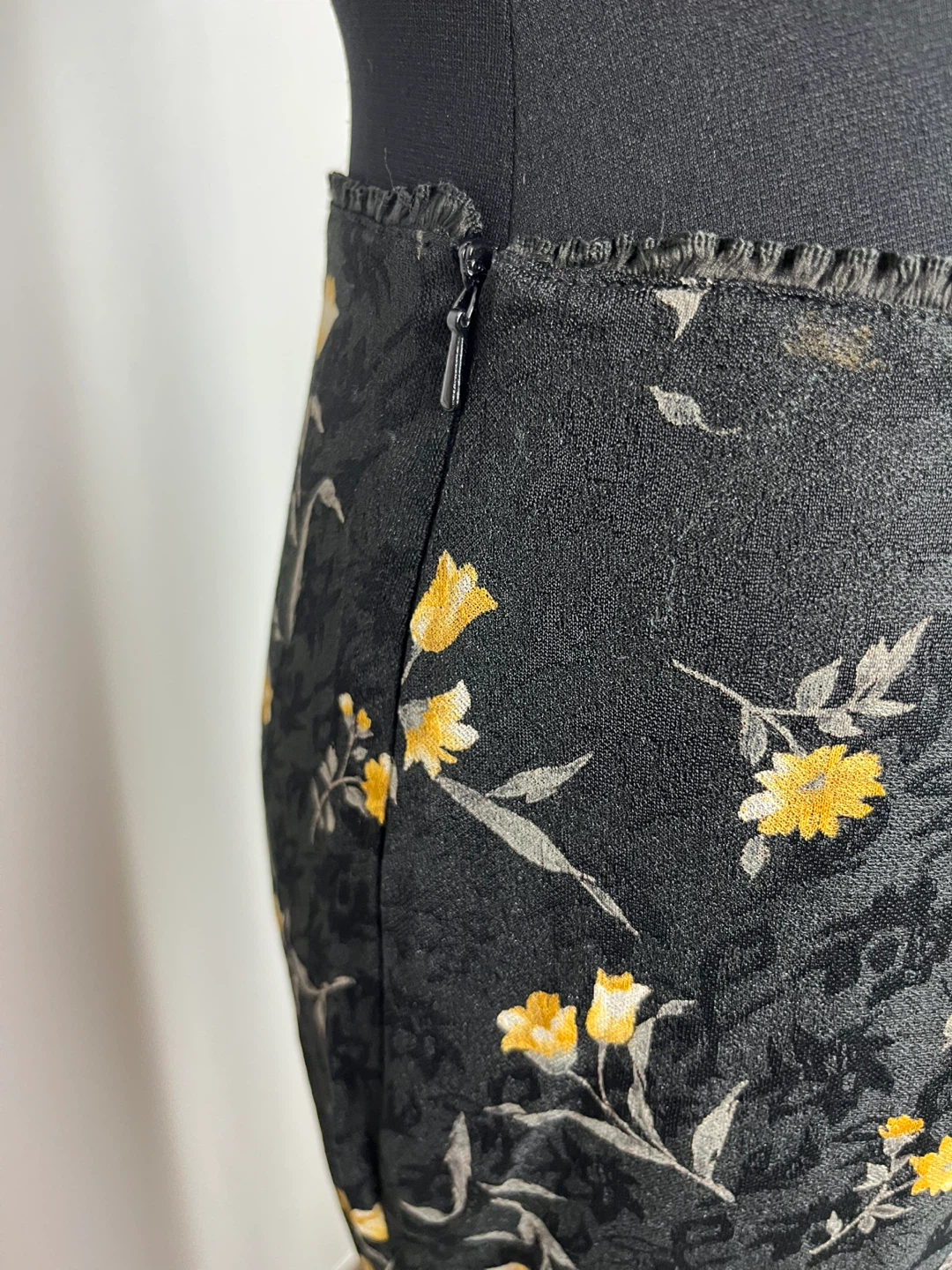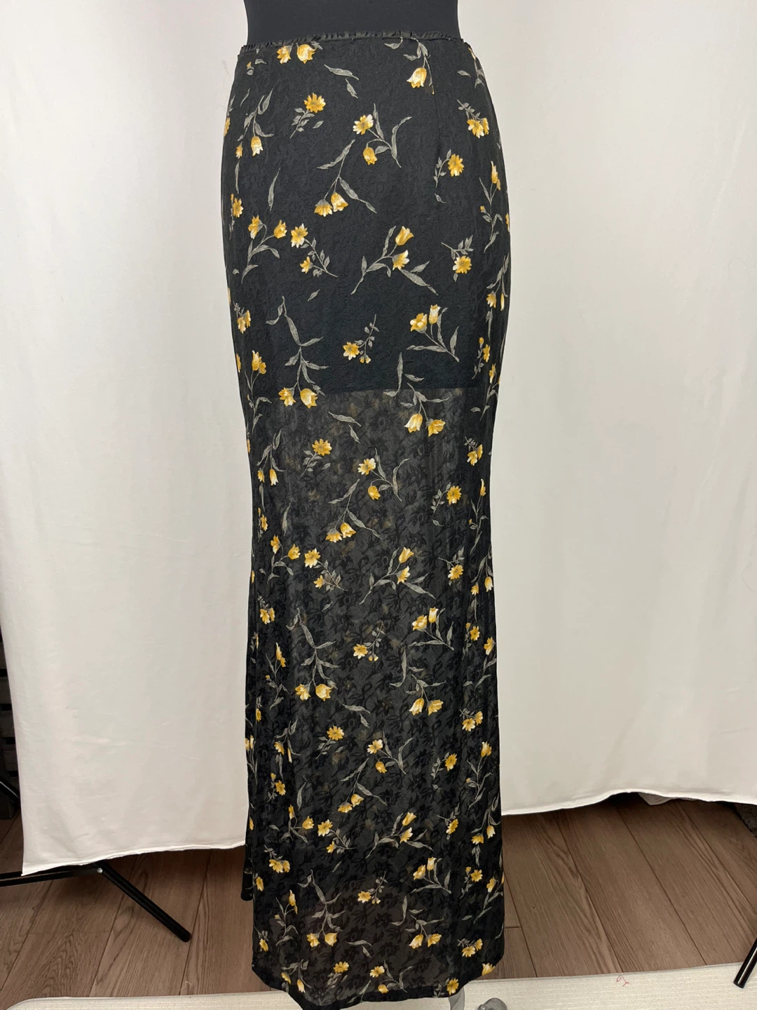 This is a lovely floral maxi skirt in a size XS. The skirt is black with a yellow floral print. The approximate waist size is 12 inches and the length is approximately 41 inches. It's in great condition and ready for a new owner!