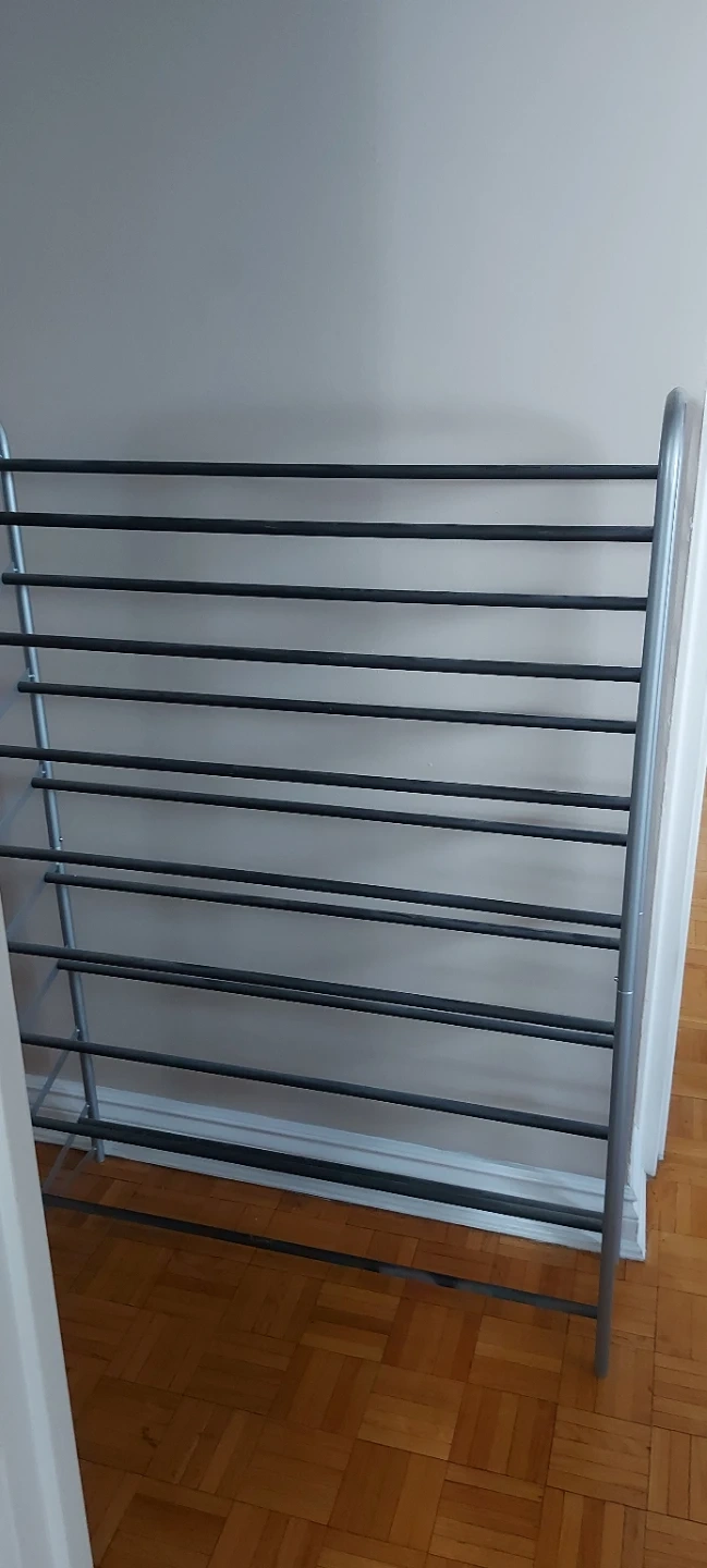 Here's a handy silver shoe rack! It's in great shape and ready to help organize your footwear. Perfect for keeping your entryway neat and tidy. Can hold up to 30 shoes. 35x39x9 inches