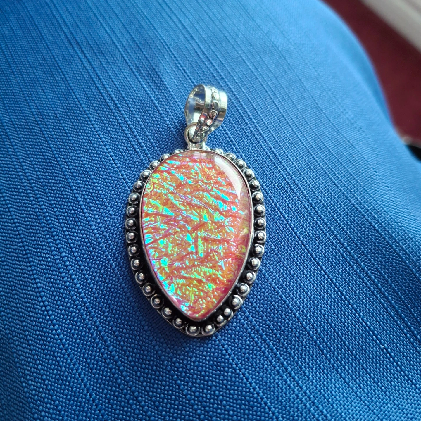 Selling a beautiful triplet opal pendant. It has a teardrop shape and is surrounded by a beaded sterling silver setting. The opal has a lovely shimmer and displays a mix of red, green, and yellow colours