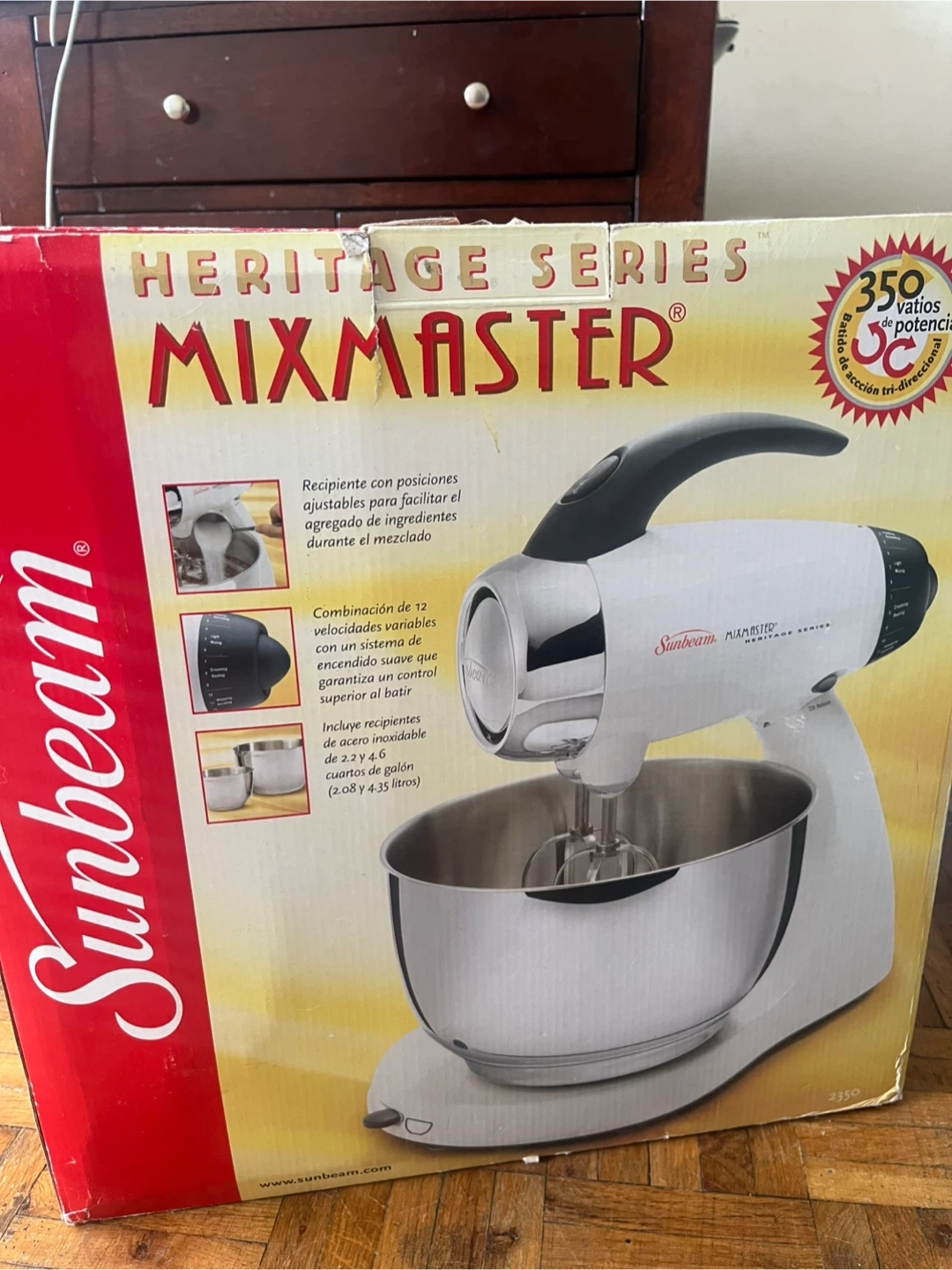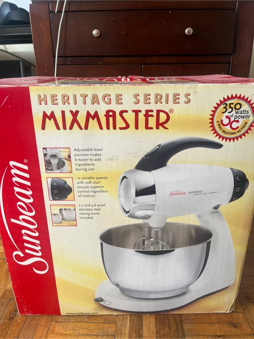 Selling a Sunbeam Heritage Series Mixmaster! It comes with an adjustable bowl position making it easier to add ingredients during use. It also has 12 variable speeds, ensuring superior control regardless of mixing. Includes 2.2 and 4.6 quart stainless steel mixing bowls. The box is included