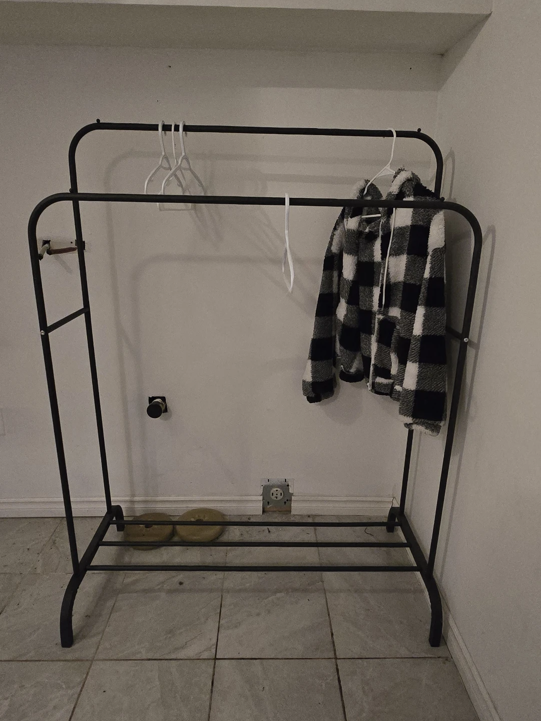Selling a metal coat rack. It's in great condition and ready to hold your jackets or long/short coats! Perfect for extra storage or organizing your walk-in closet.