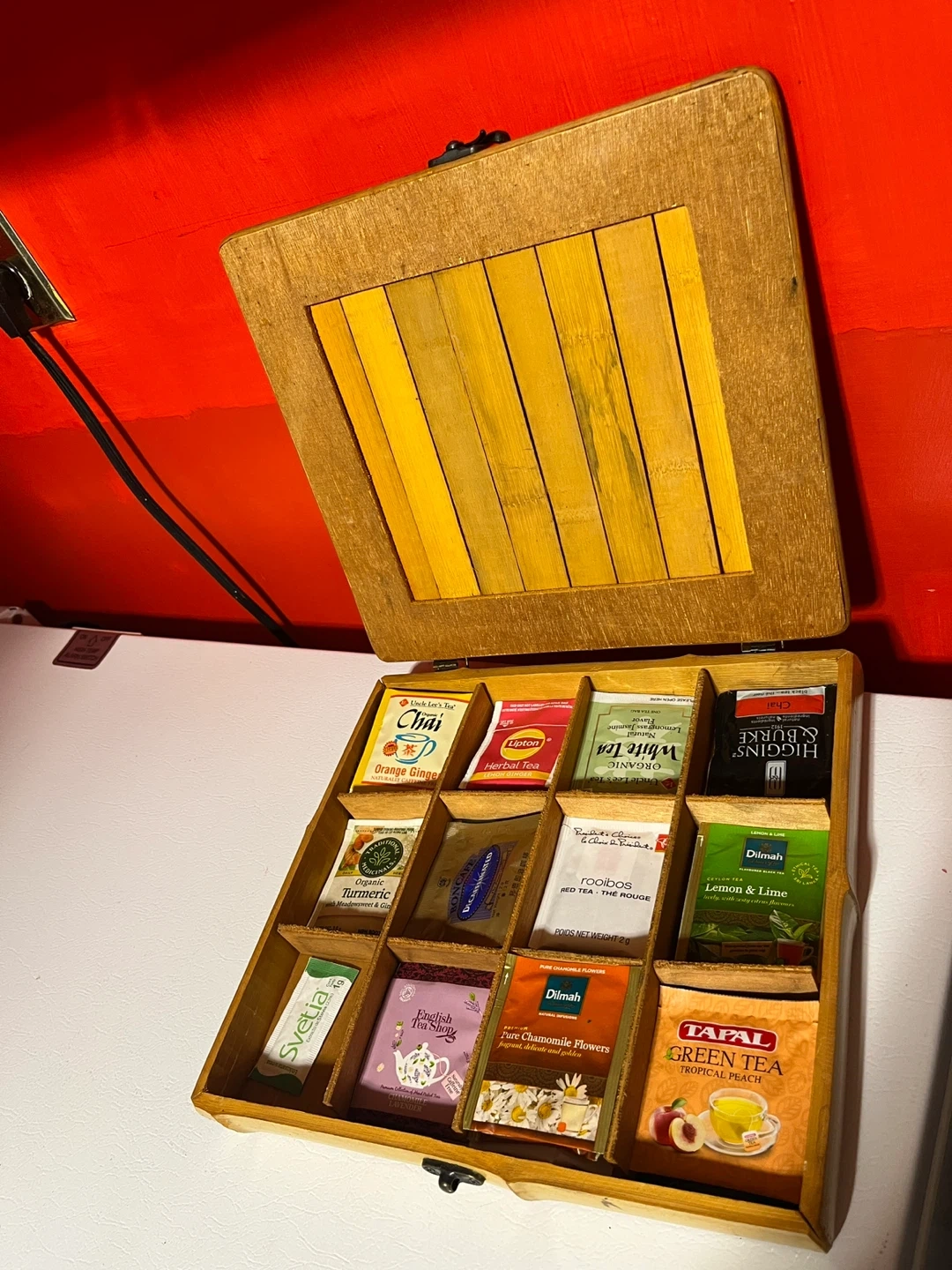Selling a charming wooden tea box . No tea bags included.It's perfect for organizing your favourite tea bags and adding a touch of rustic elegance to your kitchen. The box is in great condition and comes with a variety of tea flavours to enjoy