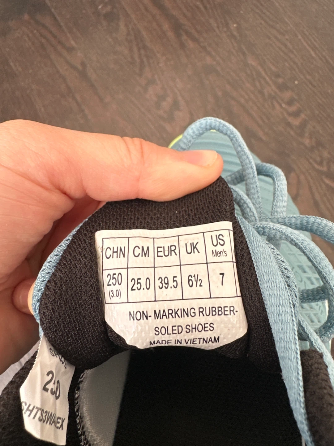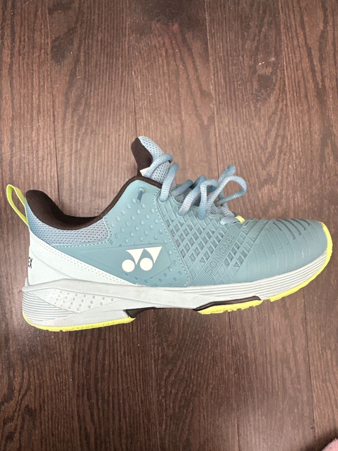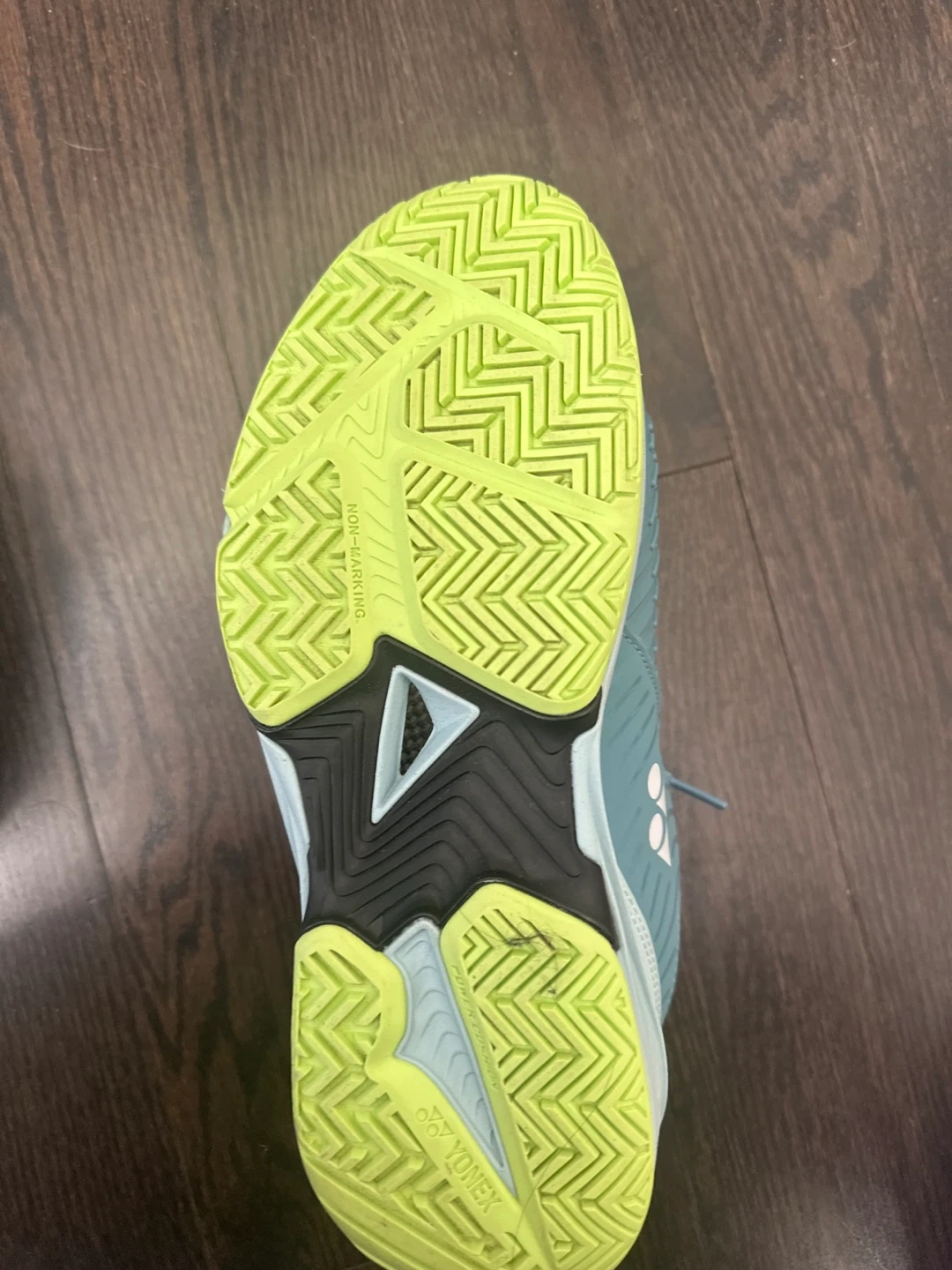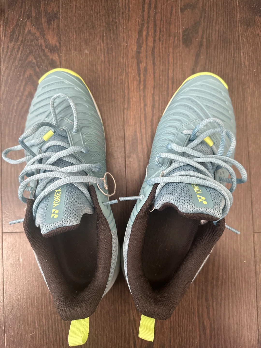 Selling a pair of Yonex tennis shoes in men's size 7. They are a nice light blue colour with yellow accents. The soles are non-marking rubber.