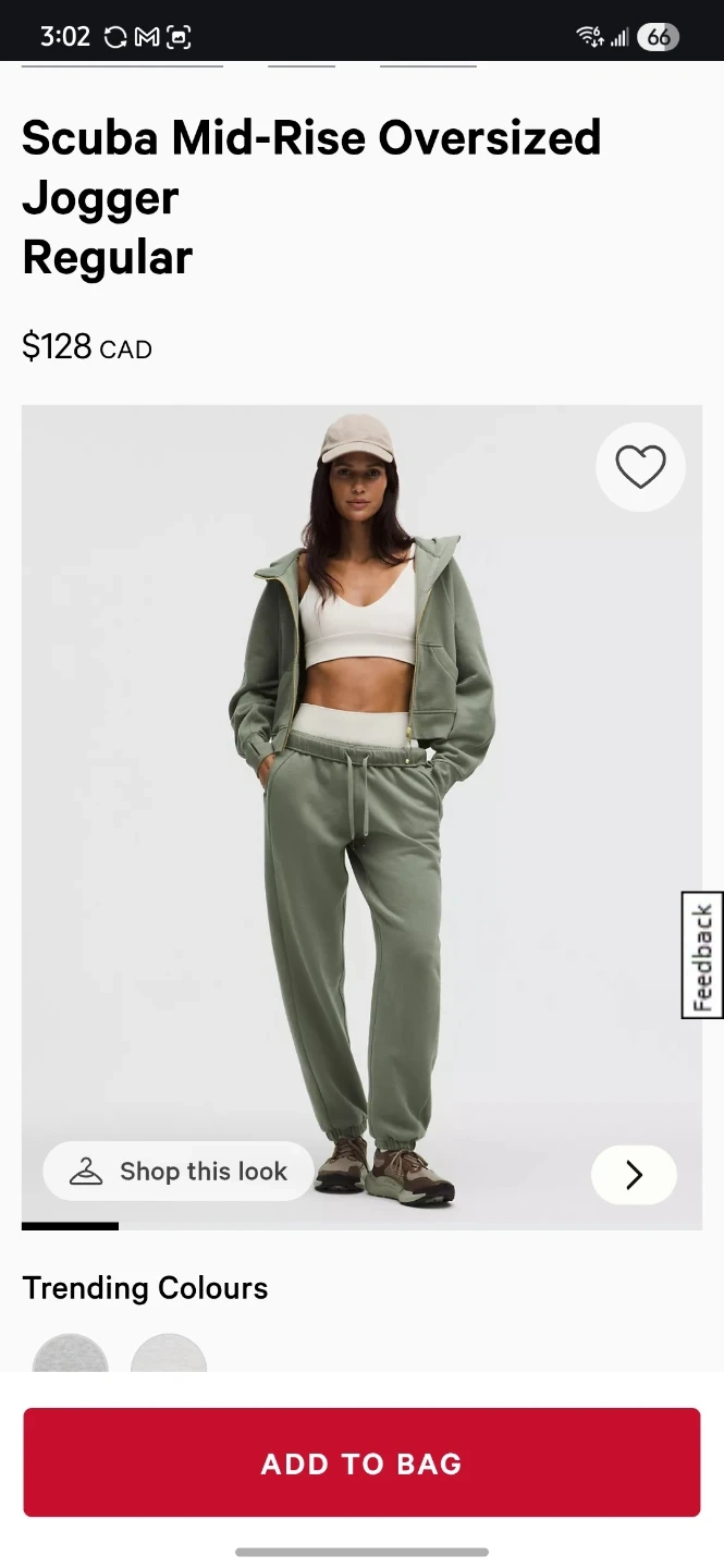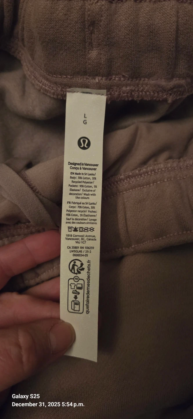 The tag mentions they're designed in Vancouver and made of a blend of 70% cotton and 30% polyester. They're a super comfy, slouchy fit and intended to sit at the ankle for heights of 5'5"-5'8".