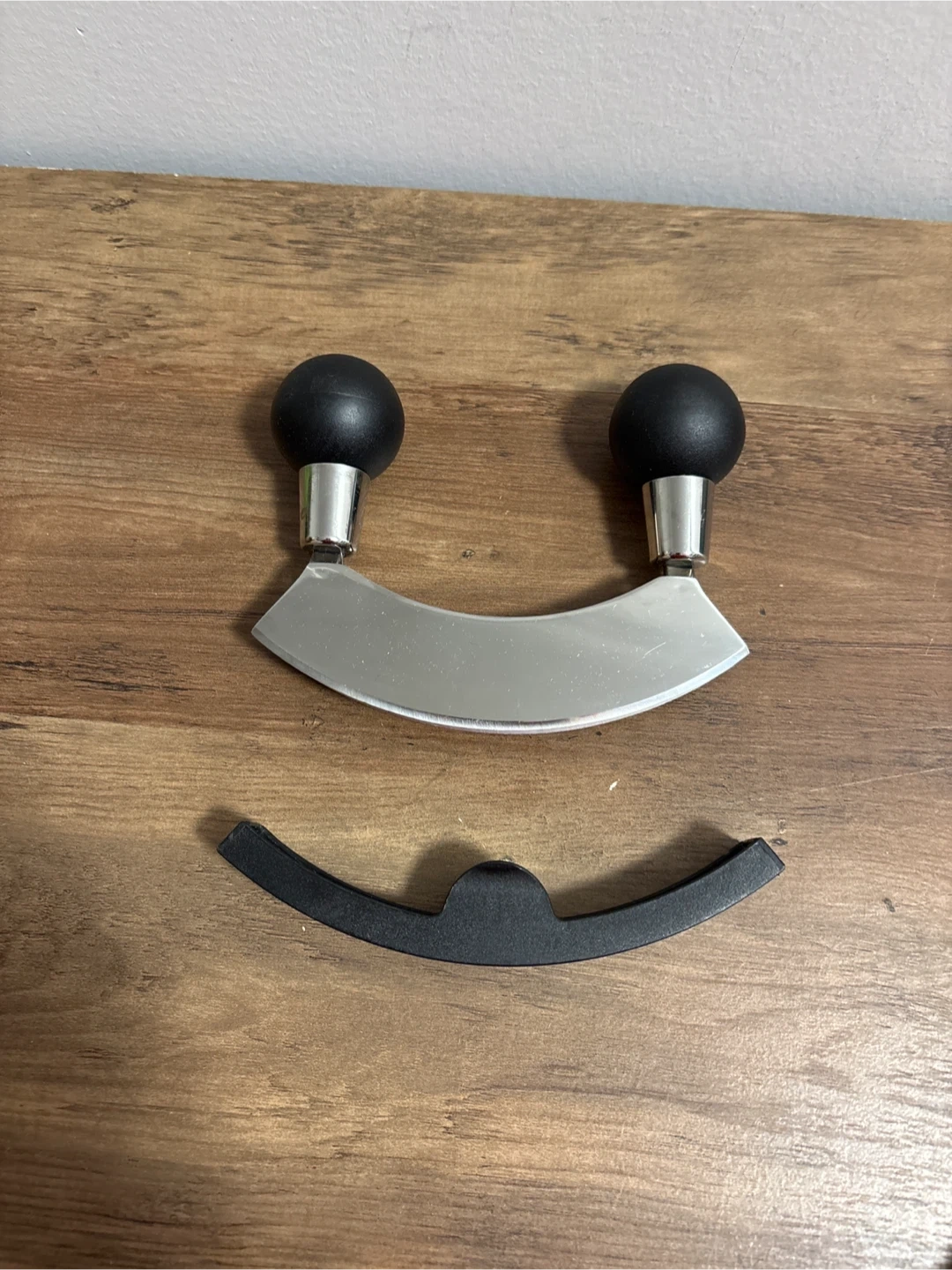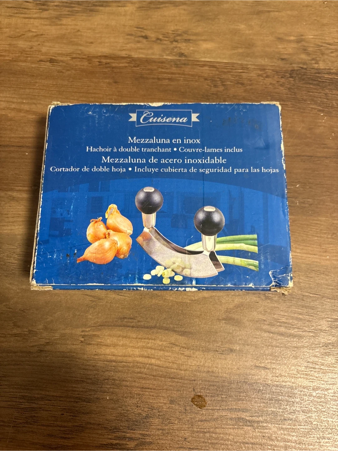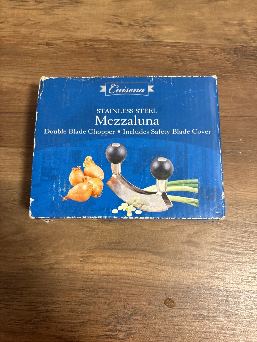 Selling a Cuisena stainless steel mezzaluna double blade chopper! It includes a safety blade cover. The box is included too!