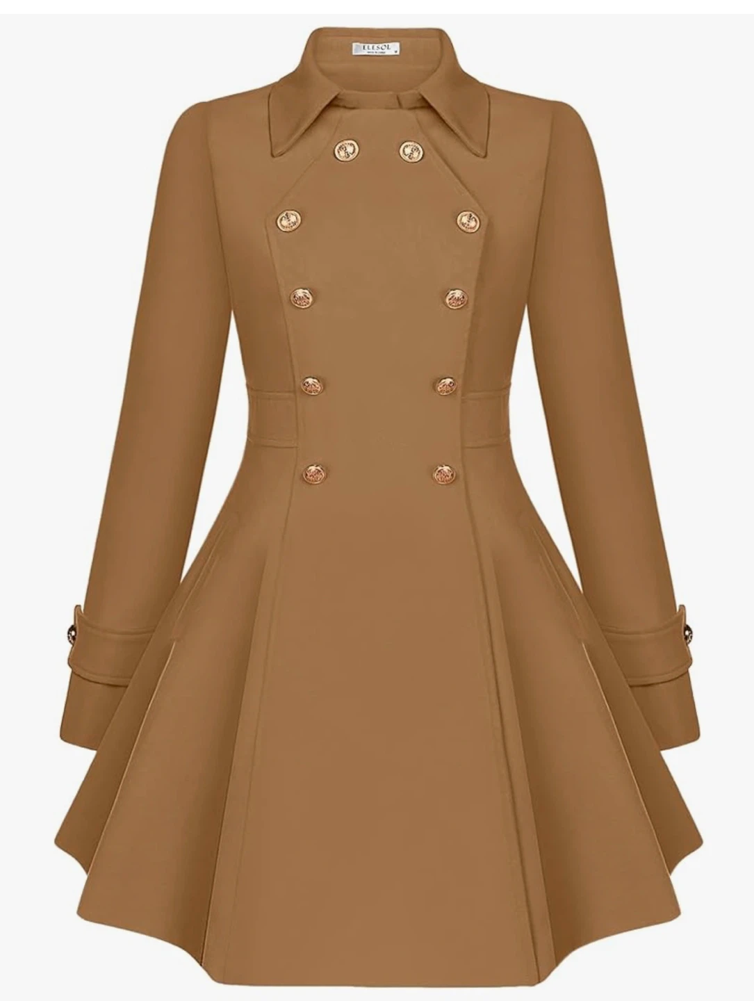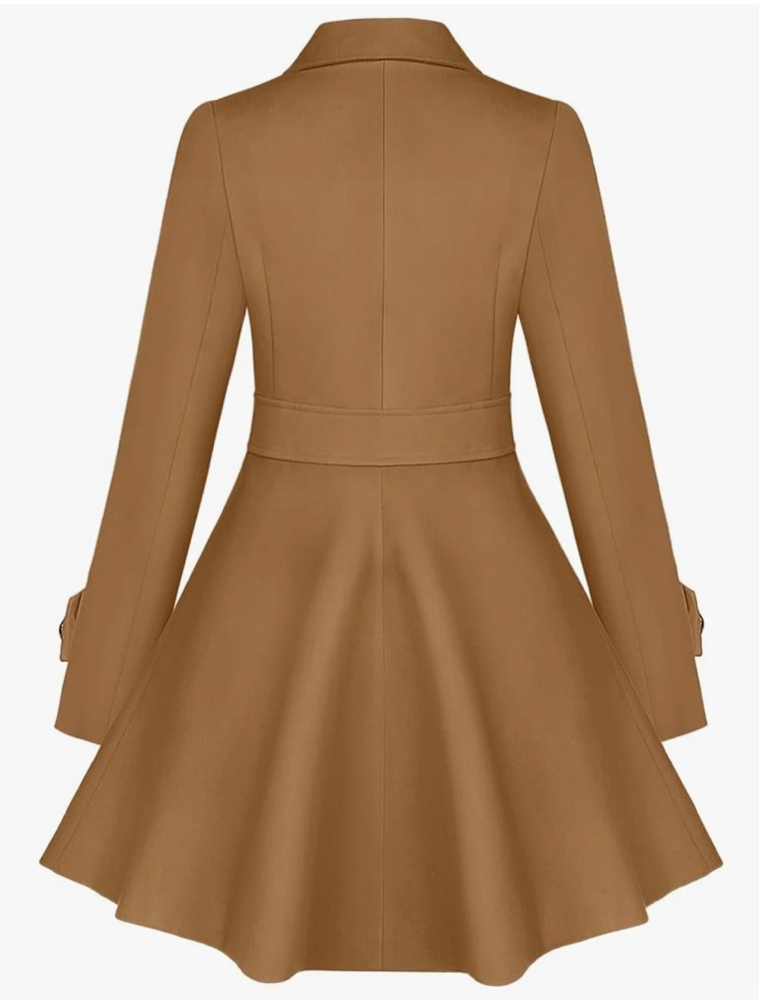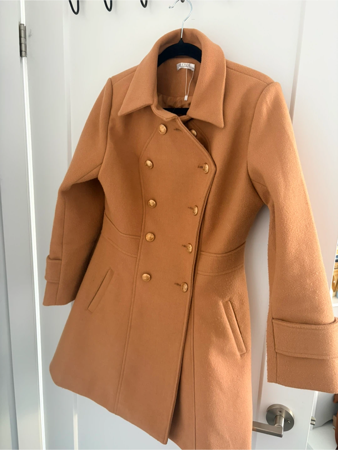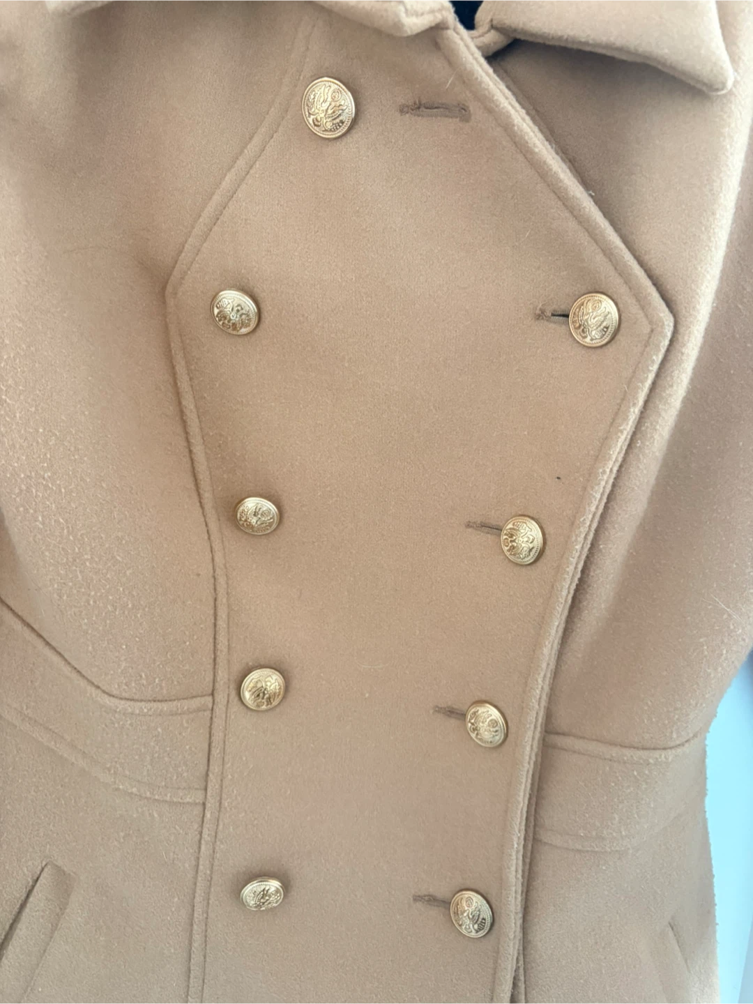 This is a beautiful fit and flare trench coat in a lovely tan colour and gold-tone buttons.