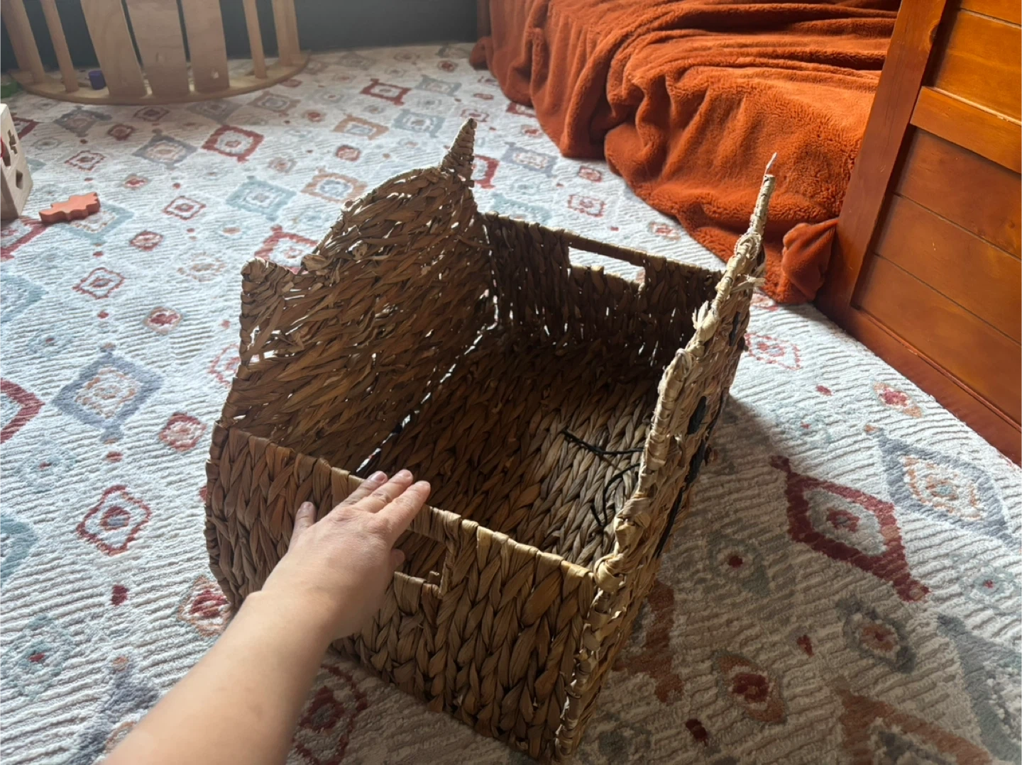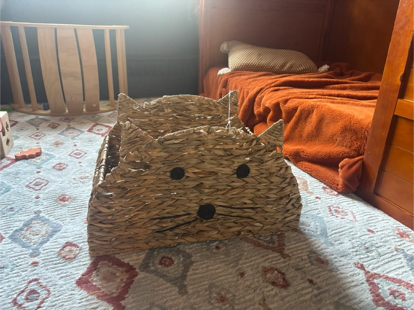 Selling a cute cat-shaped woven basket! It's in great condition and perfect for adding a touch of whimsy to any room. It would work great for storing toys or other items