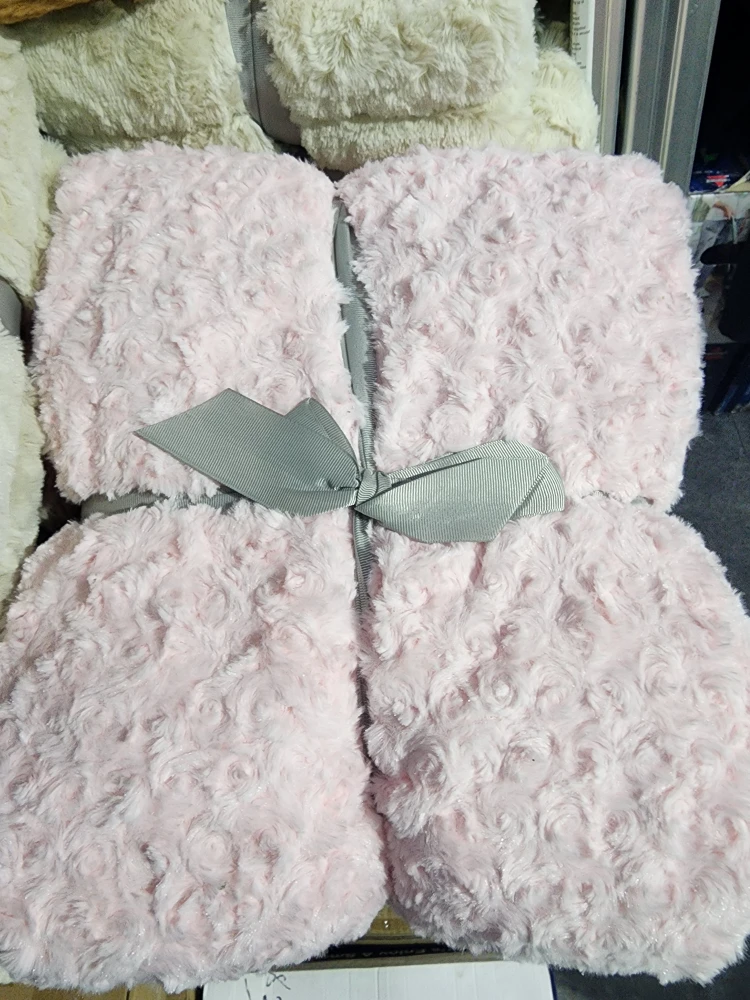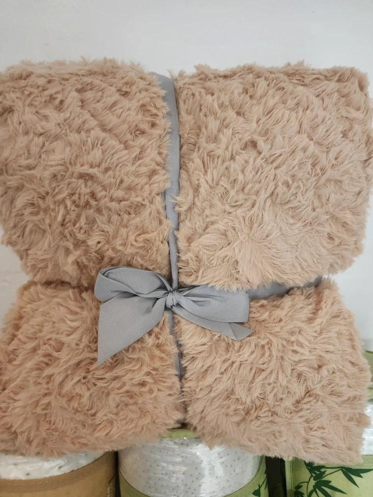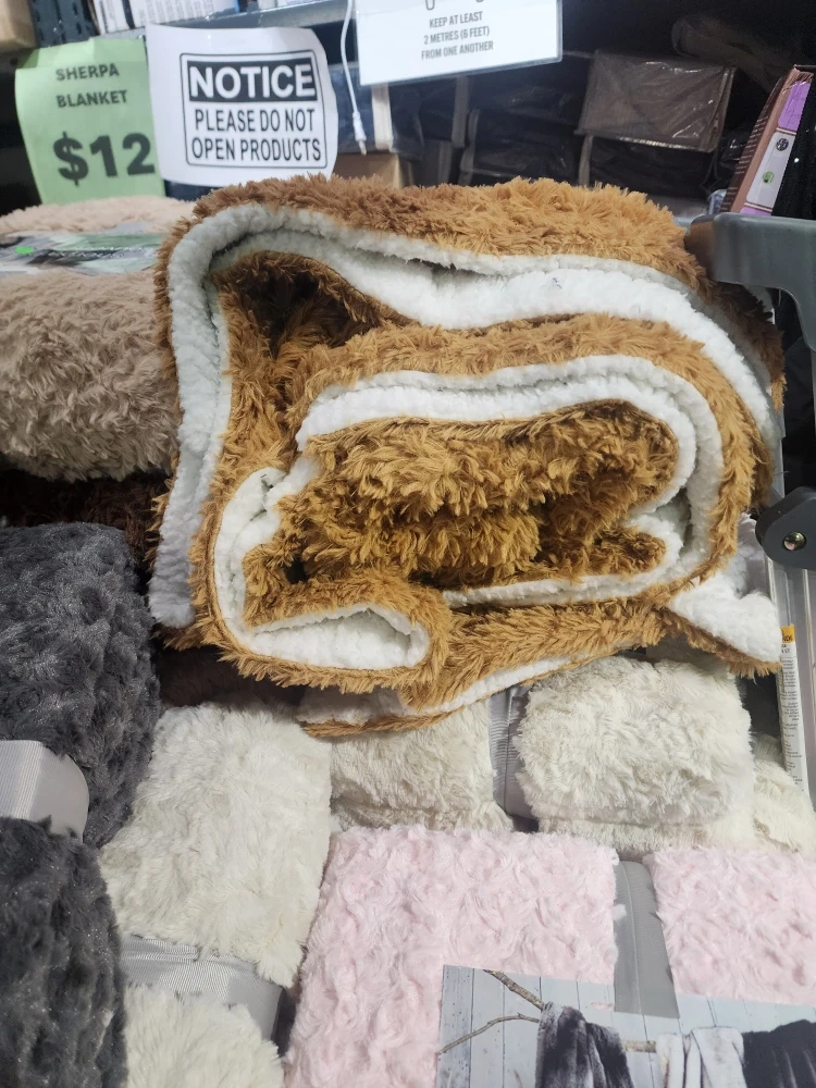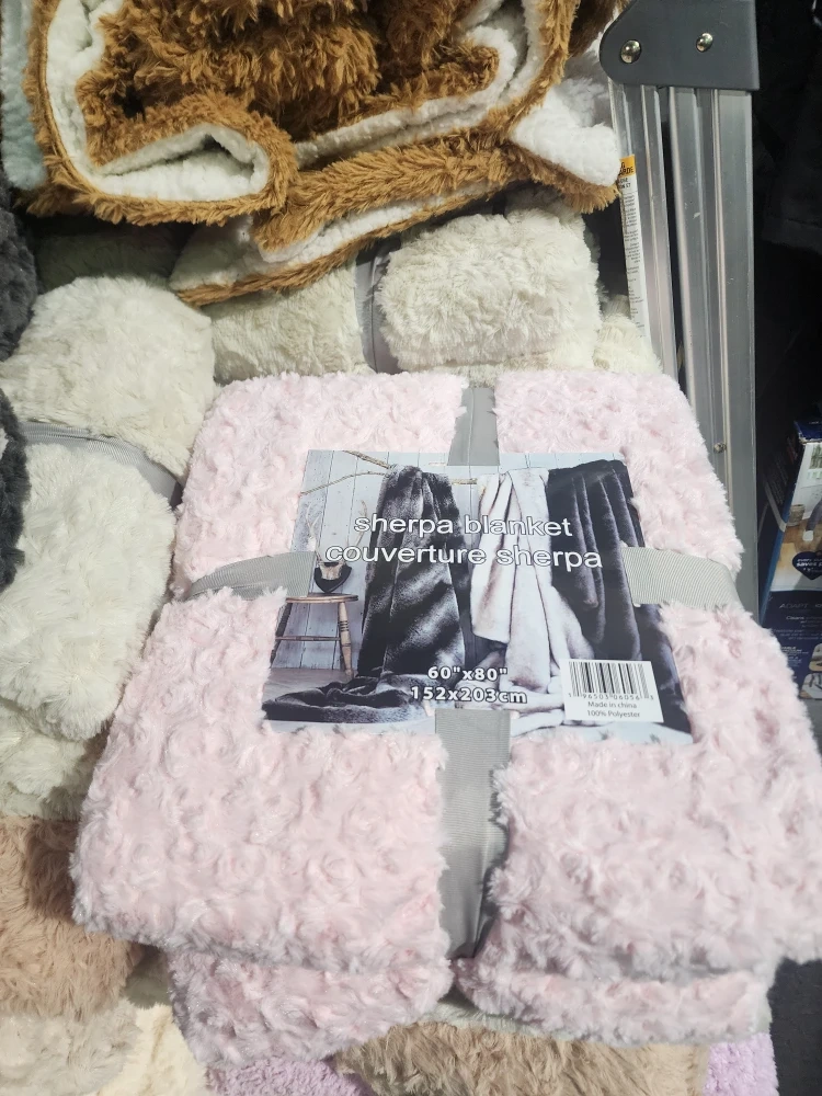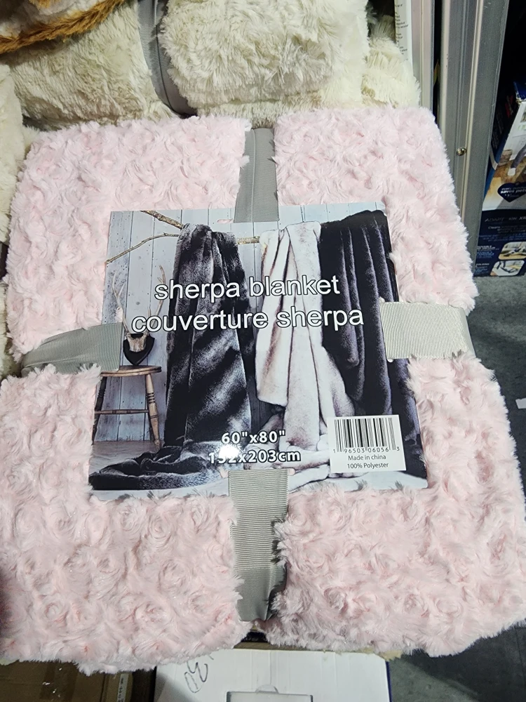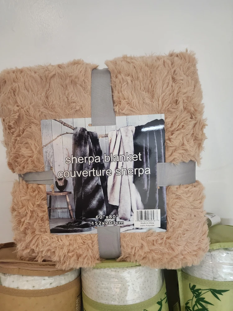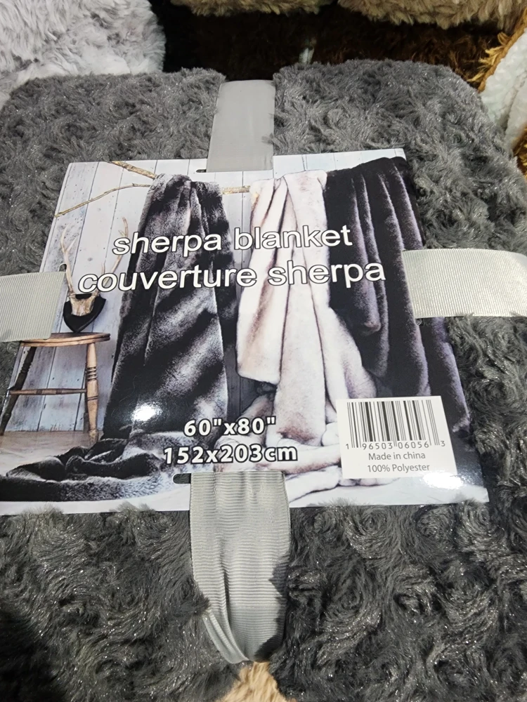 This Sherpa blanket is brand new and still in its packaging! It measures 60" x 80" (152 x 203 cm) and is made of 100% polyester