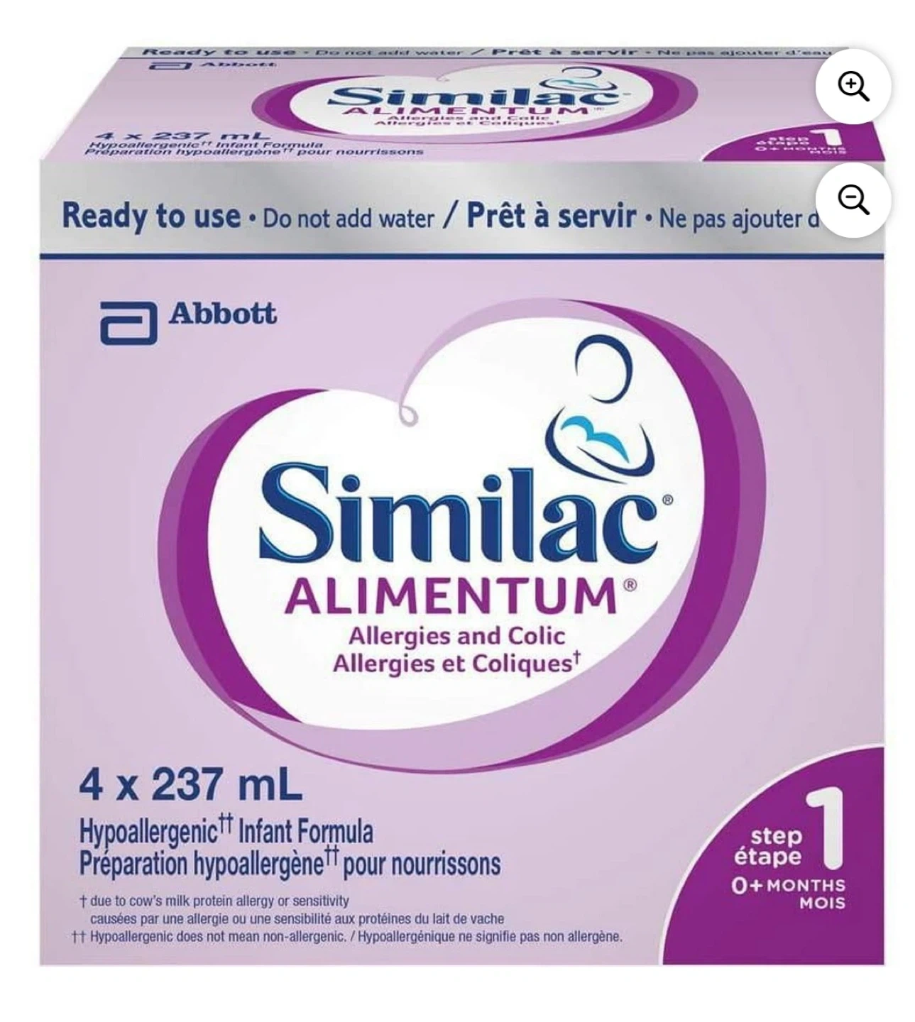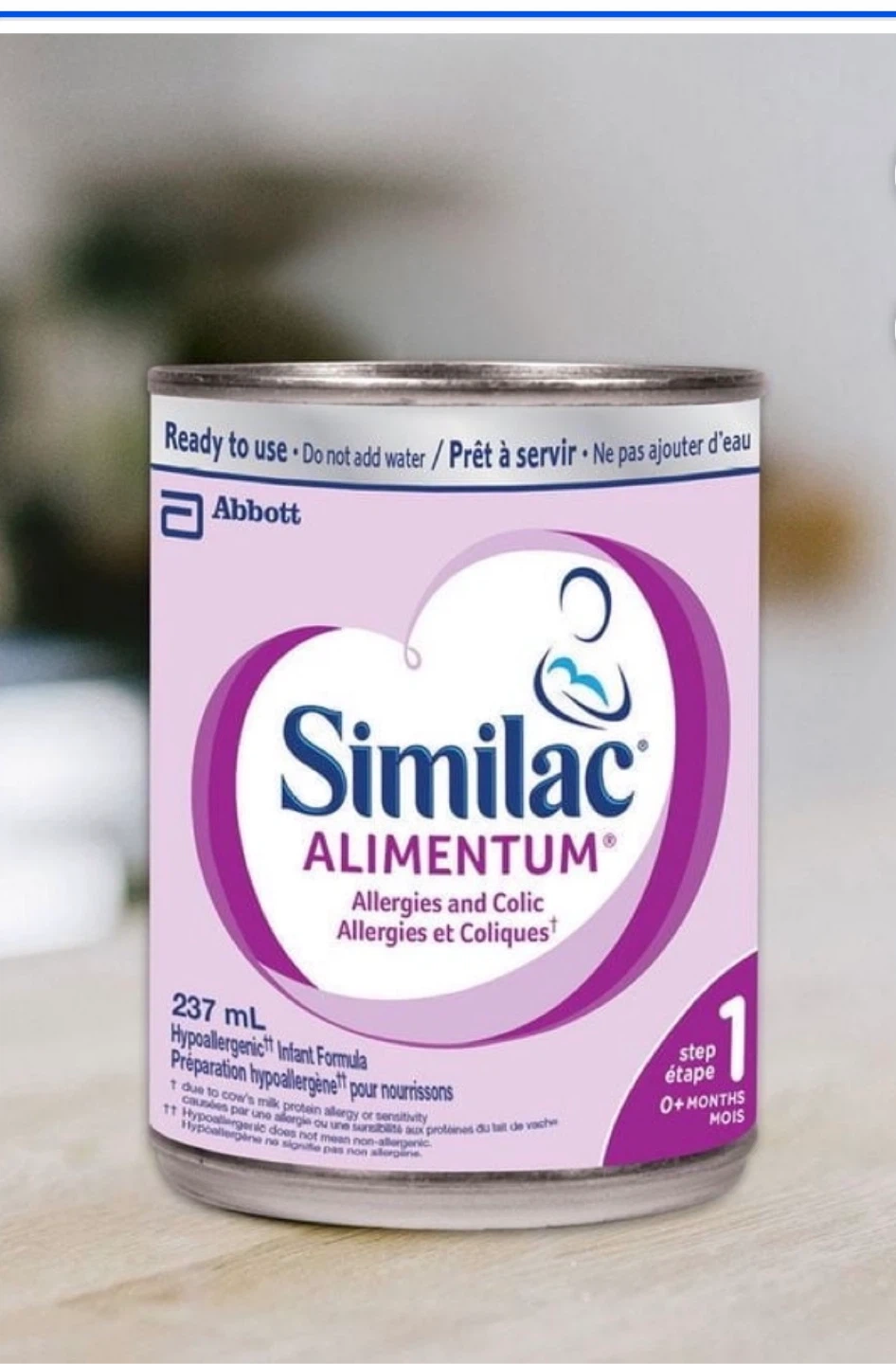 Selling Similac Alimentum infant formula. It's ready to use and hypoallergenic, perfect for babies with allergies and colic. The can contains 237 mL of formula. Suitable for babies 0+ months. Also selling a box of 4 x 237mL cans.