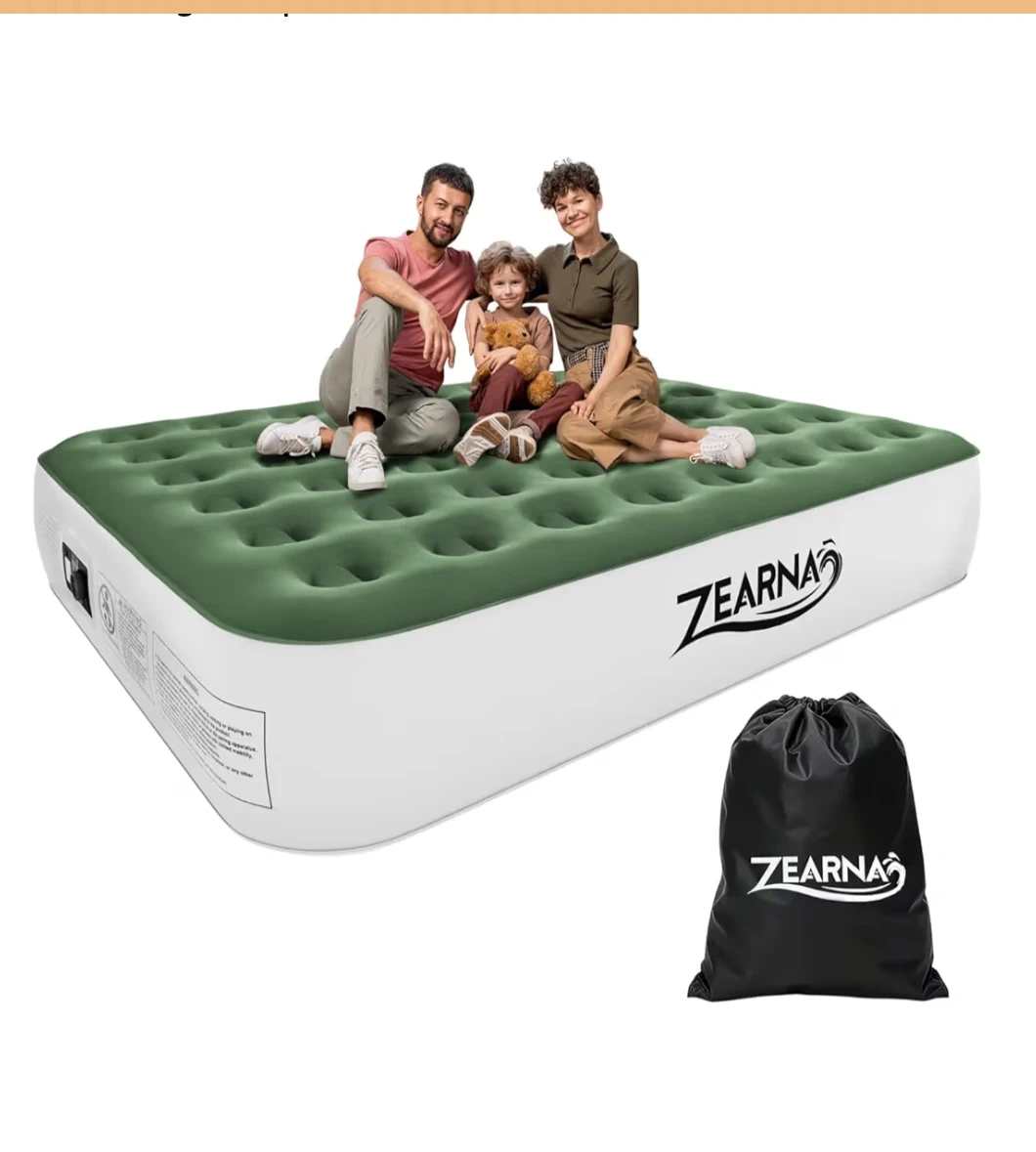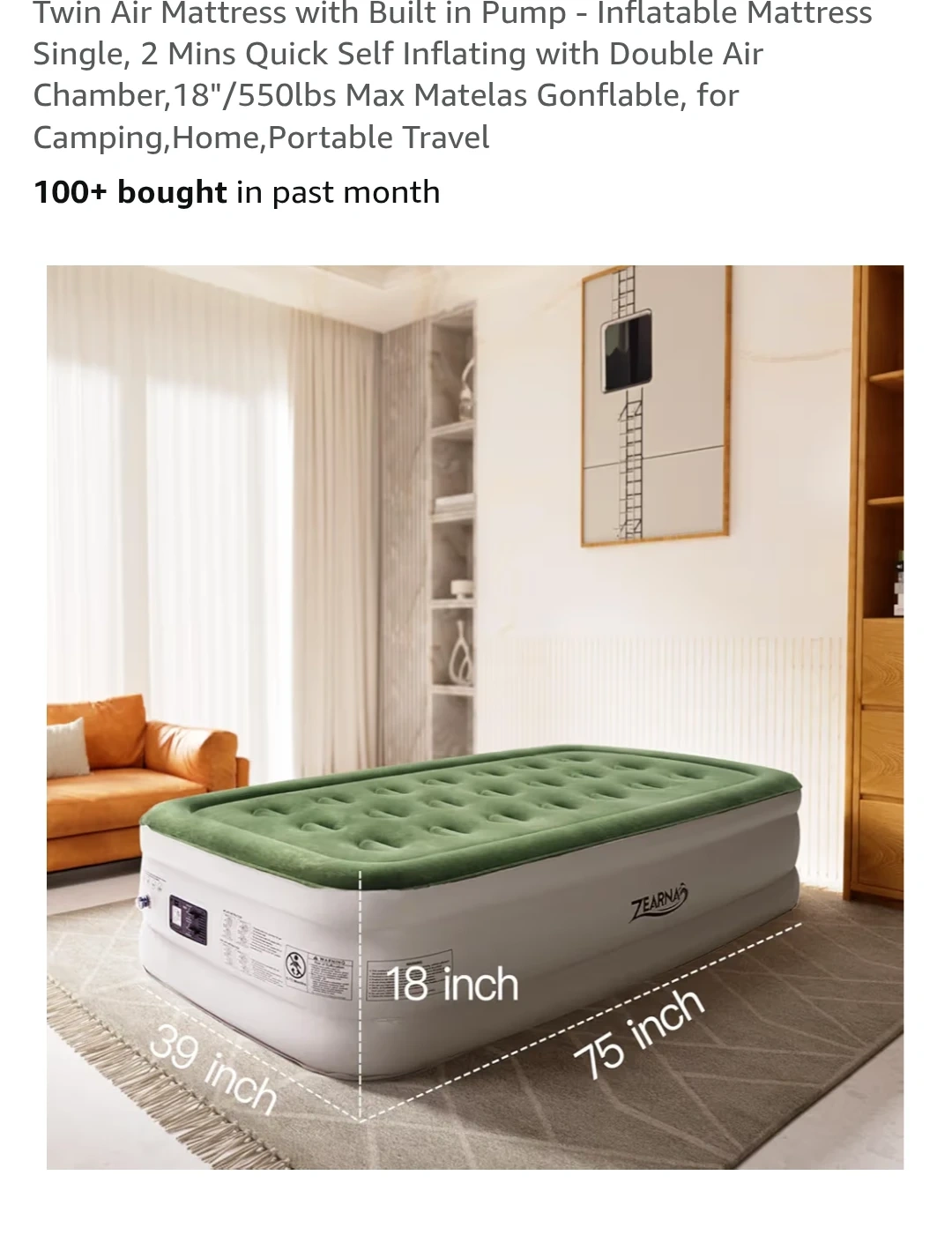 Get ready for camping or guests with this ZEARNA twin air mattress! It features a built-in pump for quick self-inflating in just 2 minutes. The double air chamber supports up to 550lbs. Perfect for home or portable travel. Dimensions are 18 inches high, 39 inches wide, and 75 inches long