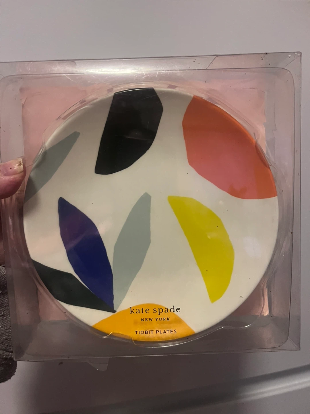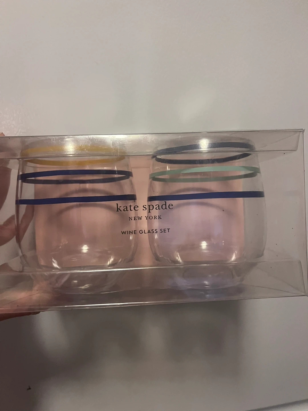 brand new Kate Spade Tidbit Plates and Wine Glass Set! They're still in the box, never been used. Perfect for adding a touch of style to your home.