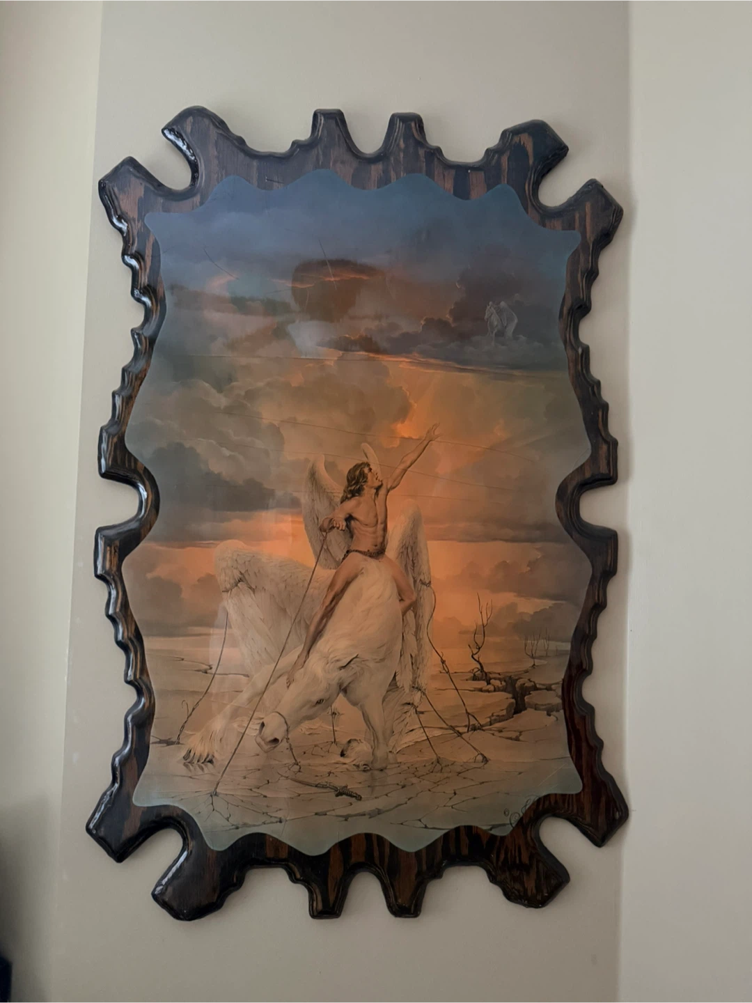 Large statement picture with fantasy-style artwork and an irregular sculpted frame. Unique, eye-catching piece in good condition. Perfect for adding character to any