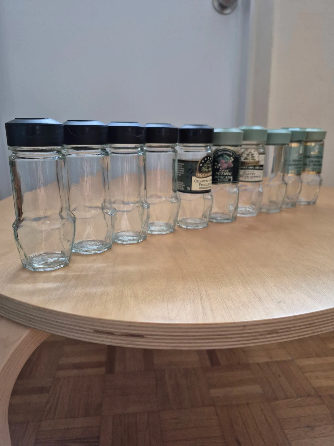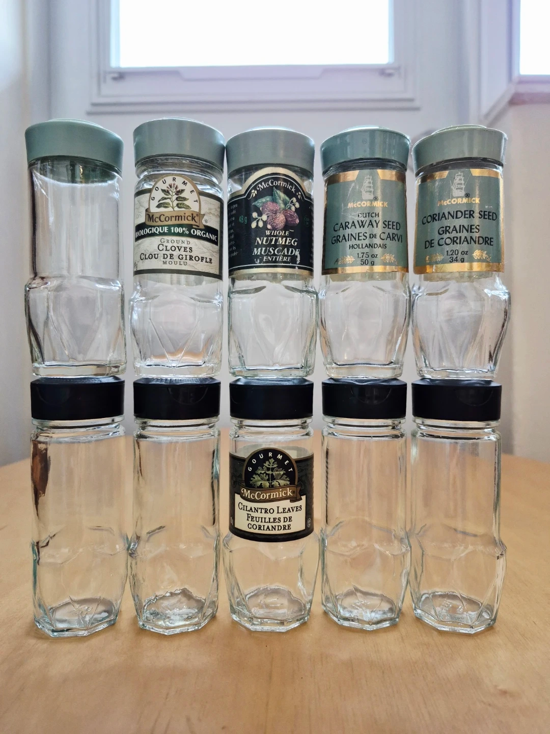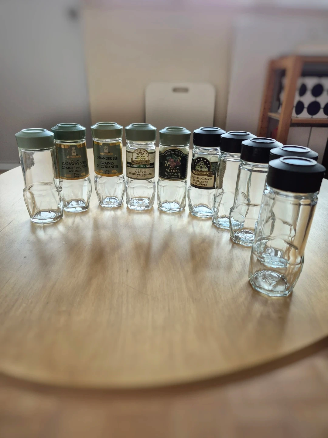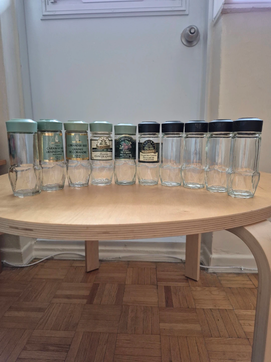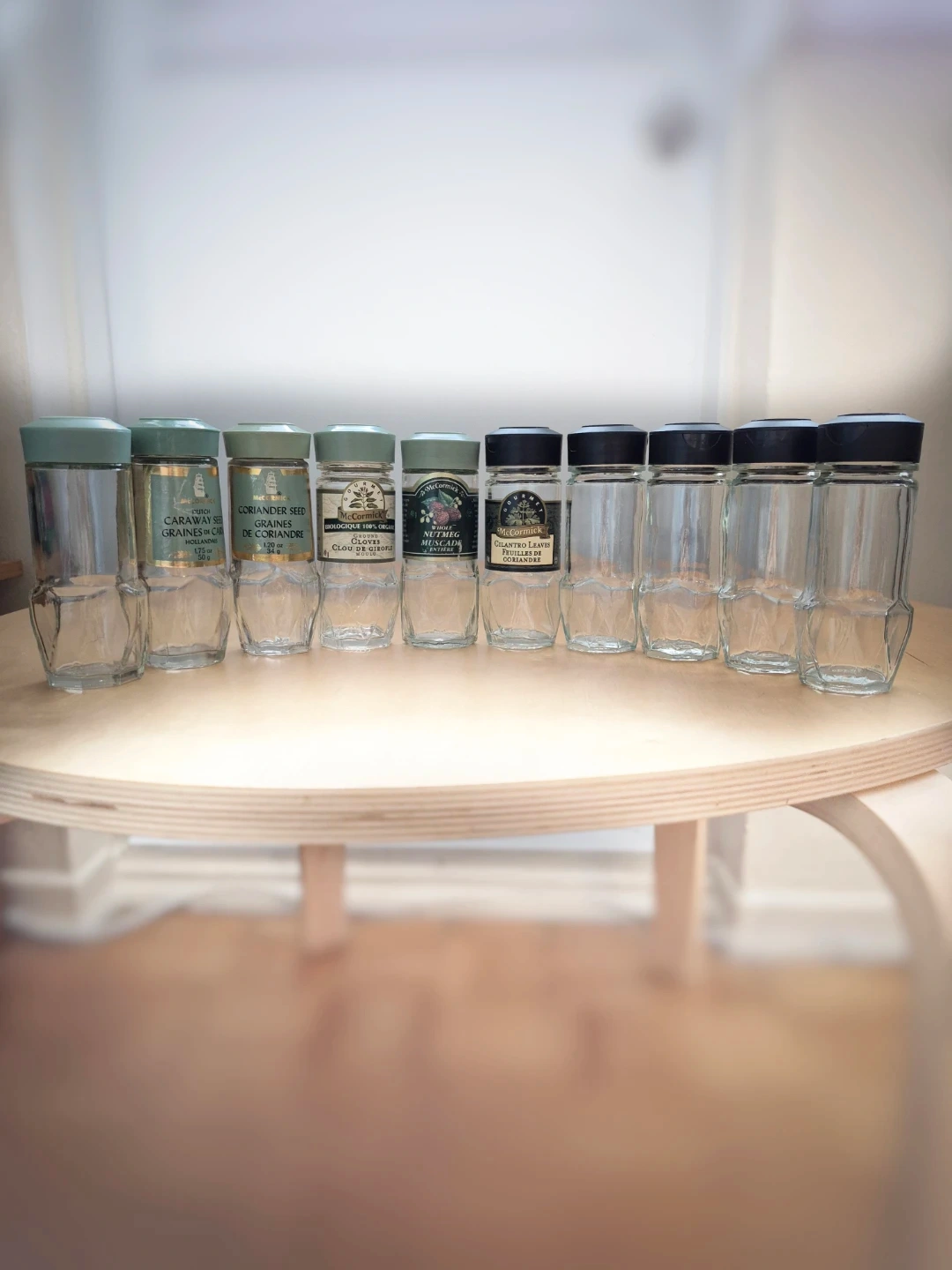 A lovingly collected set of 10 McCormick glass spice jars, including current & a few vintage.