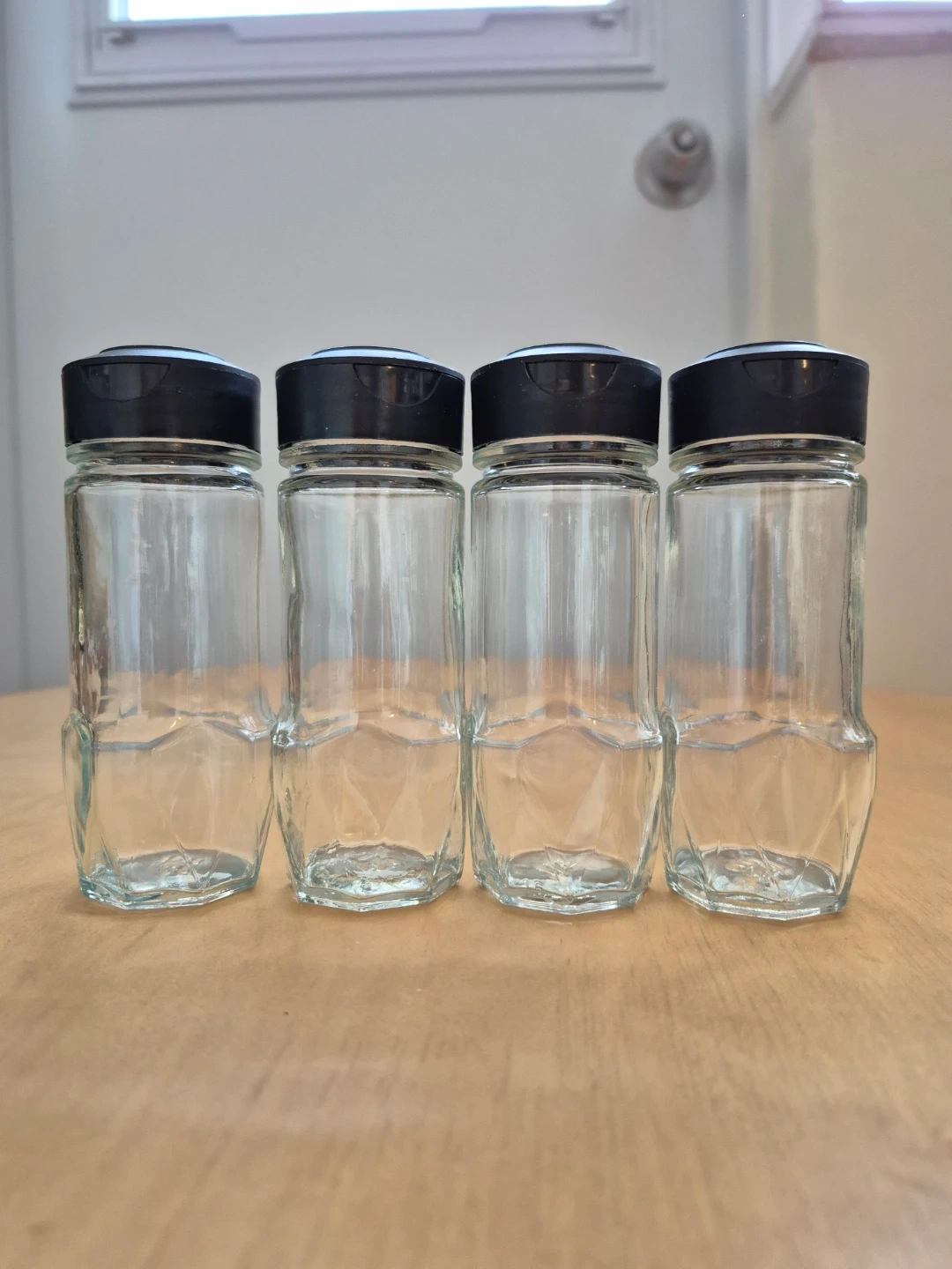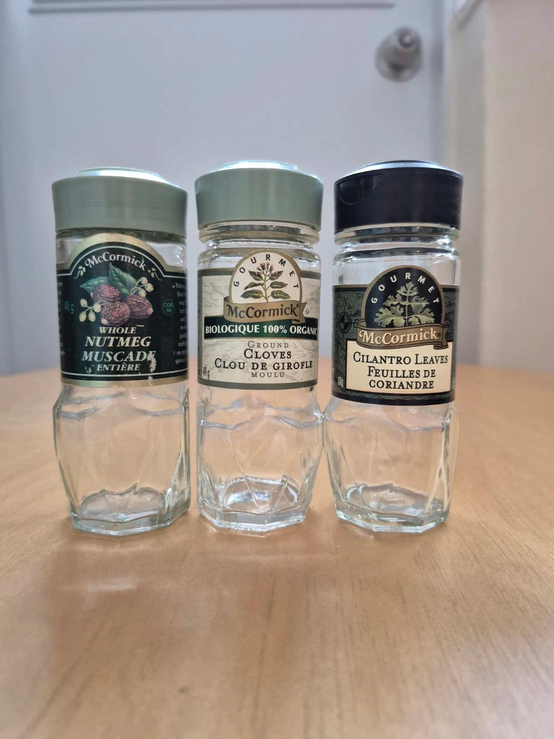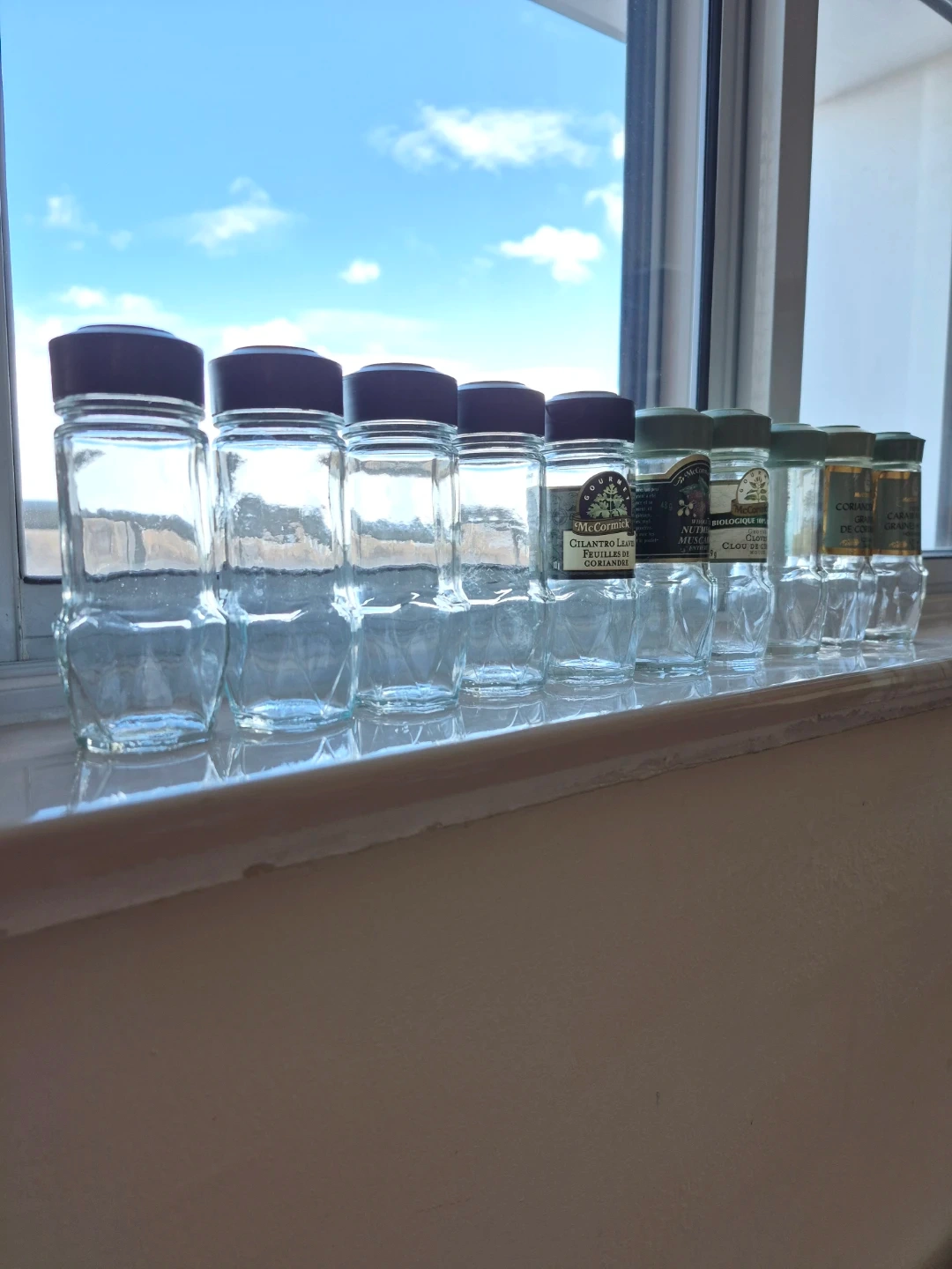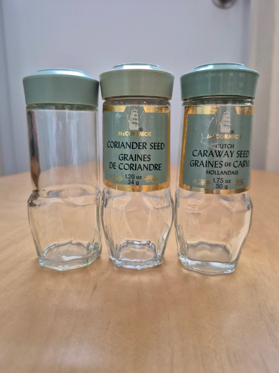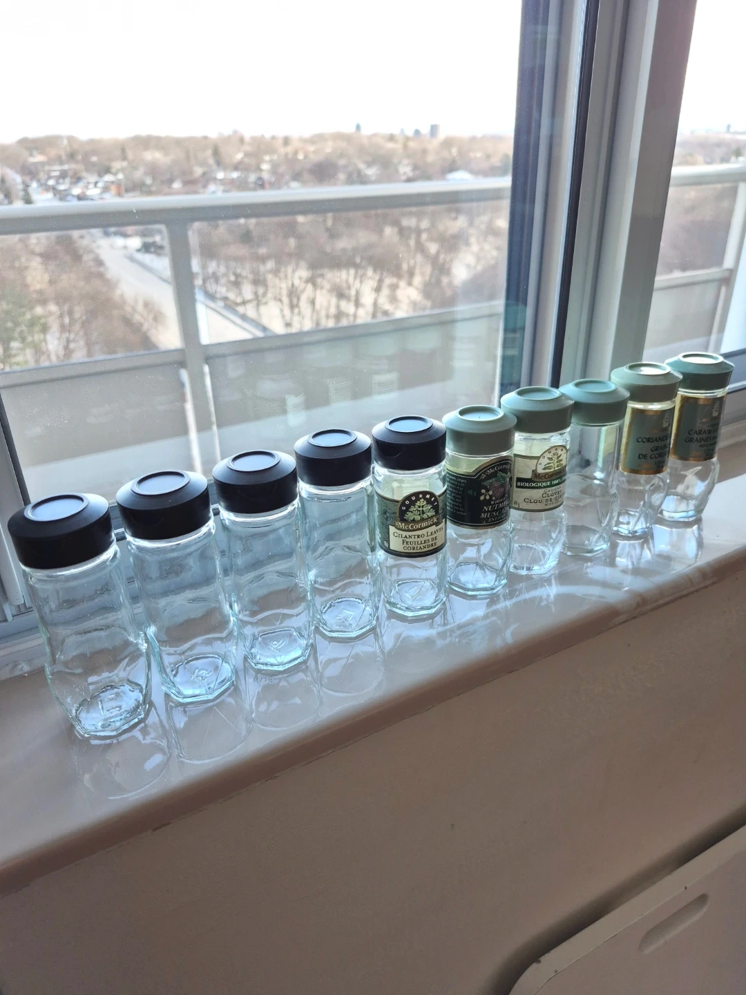 A lovingly collected set of 10 McCormick glass spice jars, including current & a few vintage.