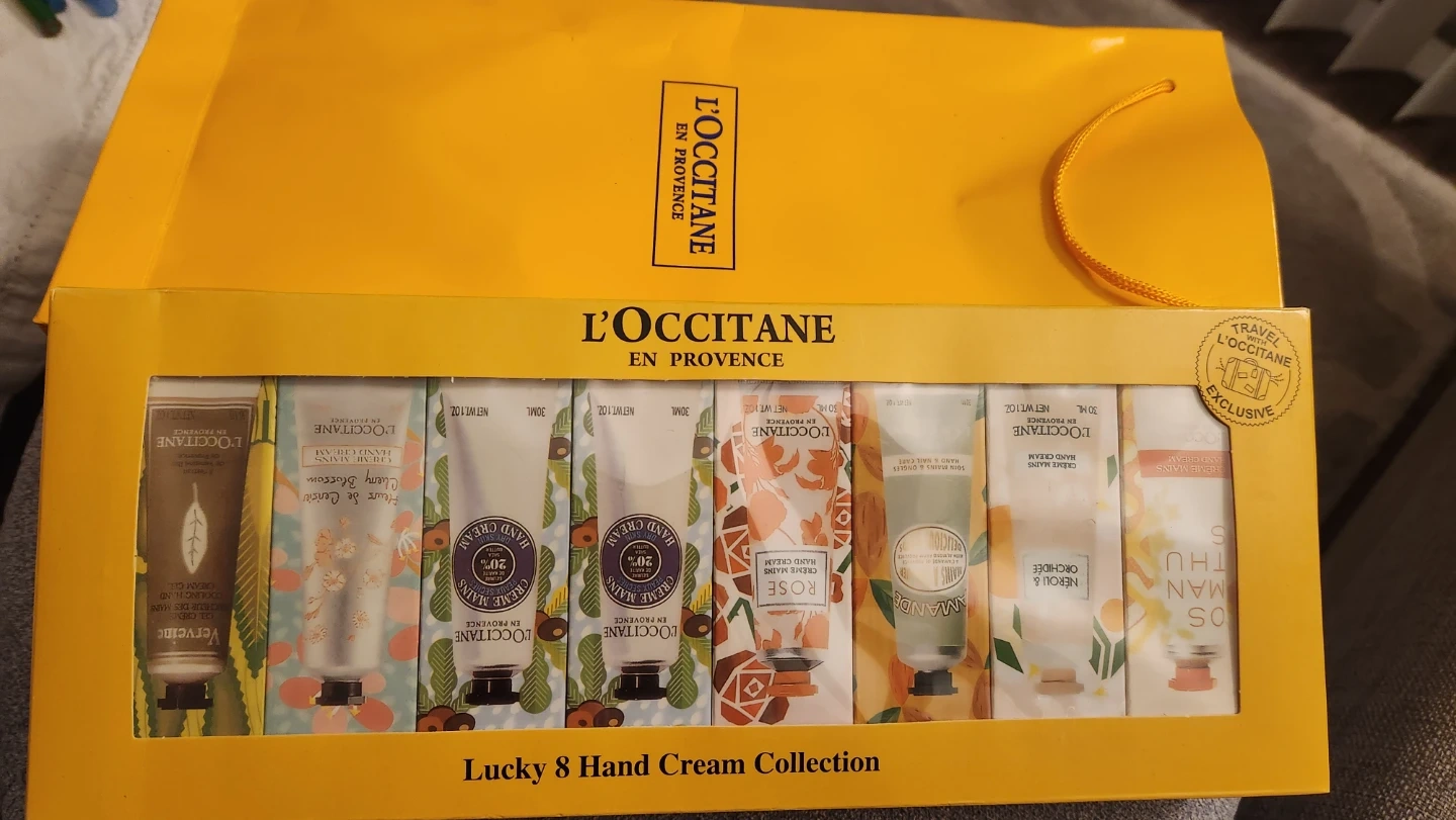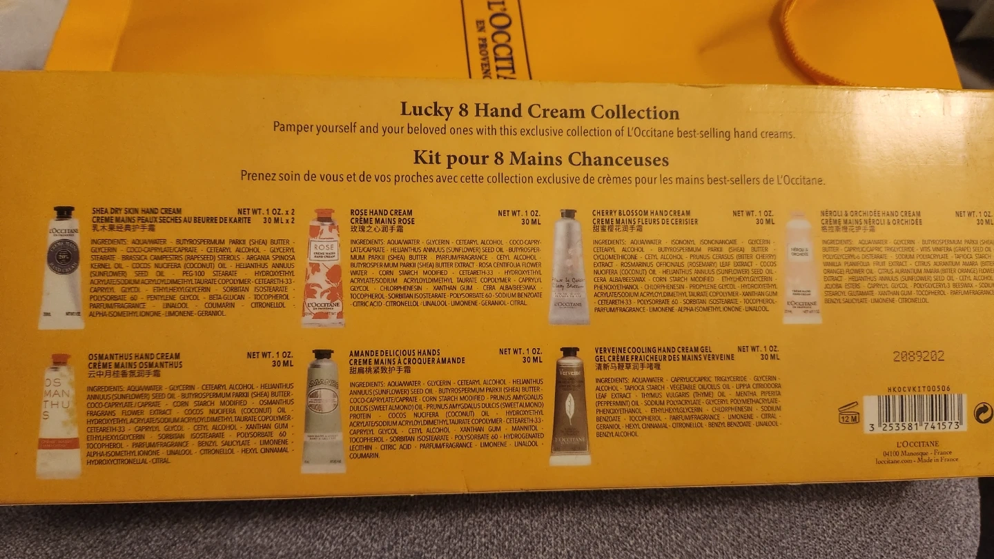 Selling a L'Occitane Lucky 8 Hand Cream Collection! It's a kit for Mains Chanceuses, perfect for treating yourself or as a gift. The collection includes Shea Dry Skin Hand Cream, Rose Hand Cream, Cherry Blossom Hand Cream, Neroli & Orchidée Hand Cream, Osmanthus Hand Cream, Amande Delicious Hands, Verveine Cooling Hand Cream, and a mystery hand cream. Each tube contains 30ml / NET WT 1 OZ of cream. Comes with the original packaging