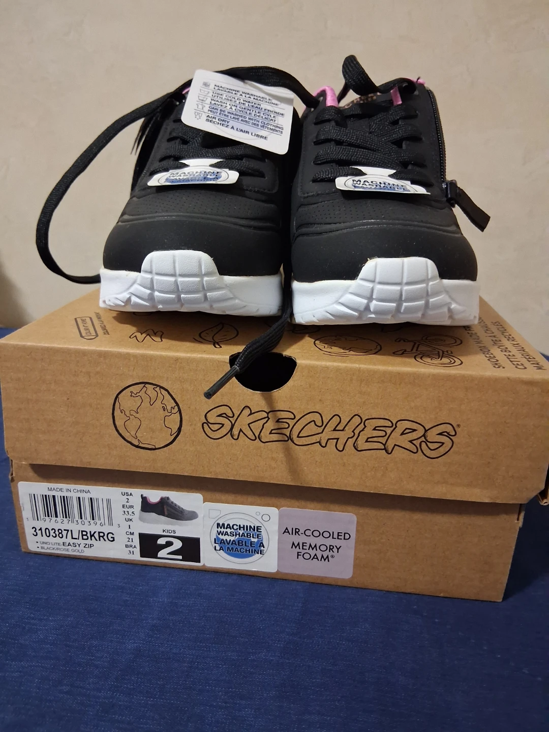 Selling a pair of Skechers Uno Lite Easy Zip sneakers for kids in size 2 (US). These are in black and rose gold. They feature air-cooled memory foam for extra comfort. The box is included!